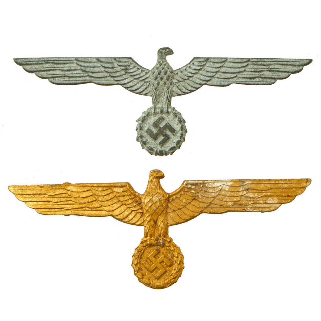 Original Items: Only One Set of 2 Available. This is a lovely pair of German Kriegsmarine Navy metal uniform breast eagles, with large metal pins on the back. Both are the standard Wehrmachtadler (Armed Forces Eagle) design, with a right facing eagle with outspread wings perched on a wreathed swas (hook cross).