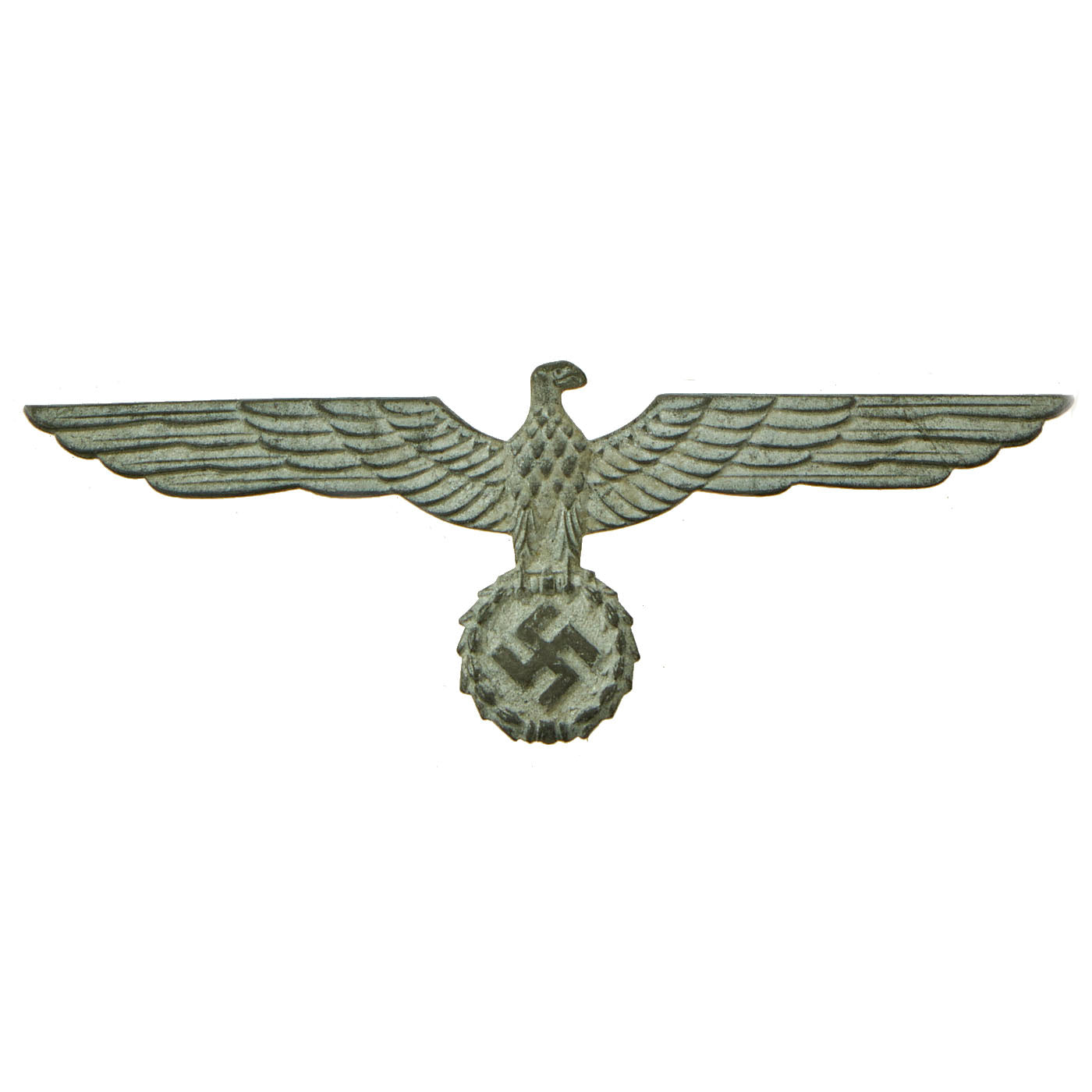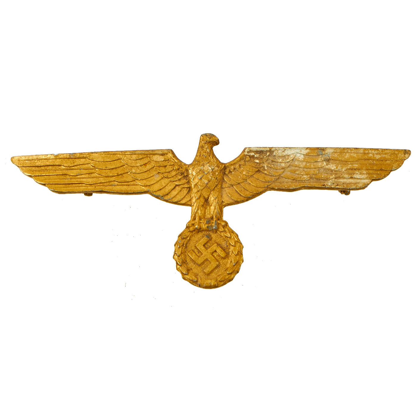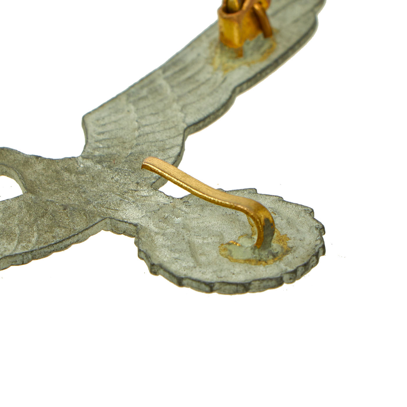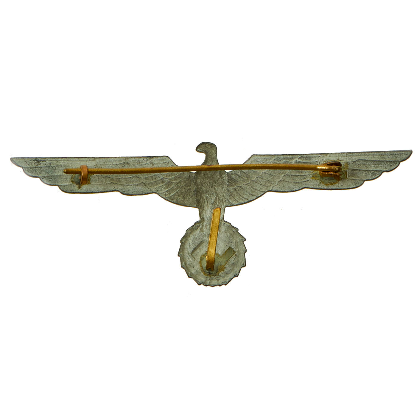 This style of eagle was used on the white "Summer Weight" uniforms used by the Kriegsmarine. Instead of using stitched on embroidered eagles, these uniforms used a metal eagle attached to thread loops on the uniform. Each has a large pin on the back for going through the upper loops, and there would be a third loop below for the hook on the back of the wreathed swas.