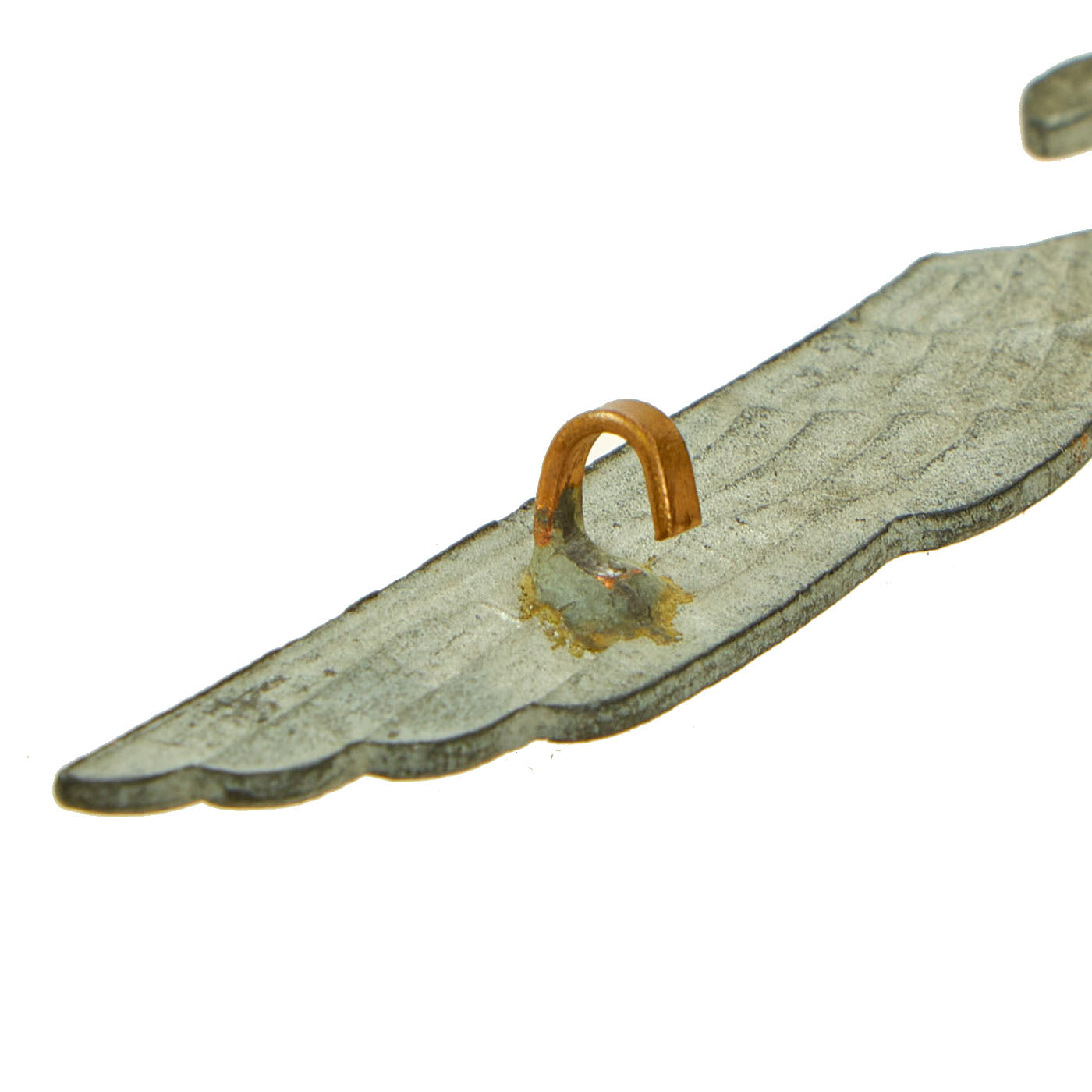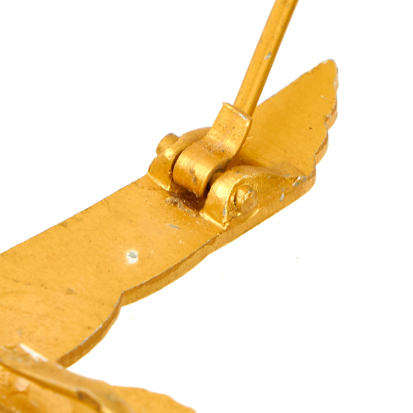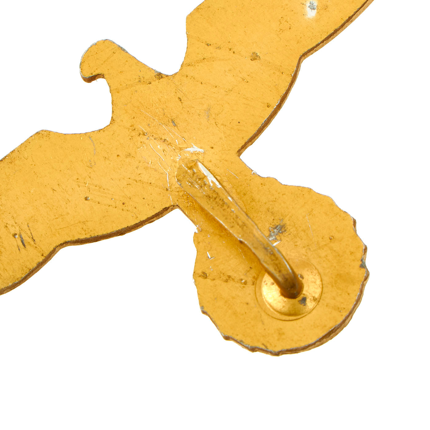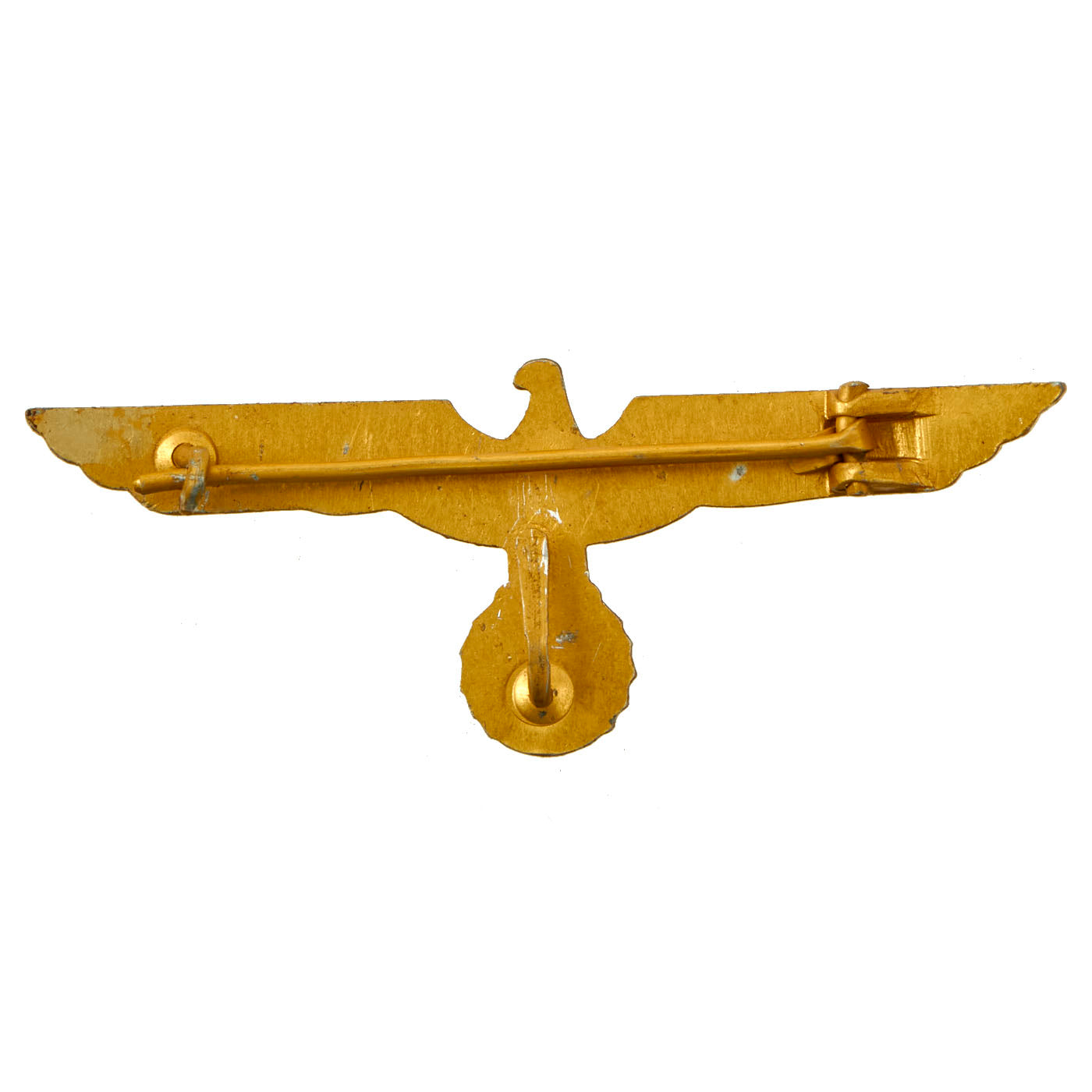 One of the eagles included in this set is a cast zinc example, with a brass pinback and attachment clip. As with many of the zinc examples, they would oxidize over time, causing all of the gold wash to flake away, so the eagle itself shows a dull zinc patina overall. The other eagle looks to be a made from injection molded Aluminum, which was then coated with a gold wash, which is very well retained. The attachment hardware looks to be aluminum and brass.