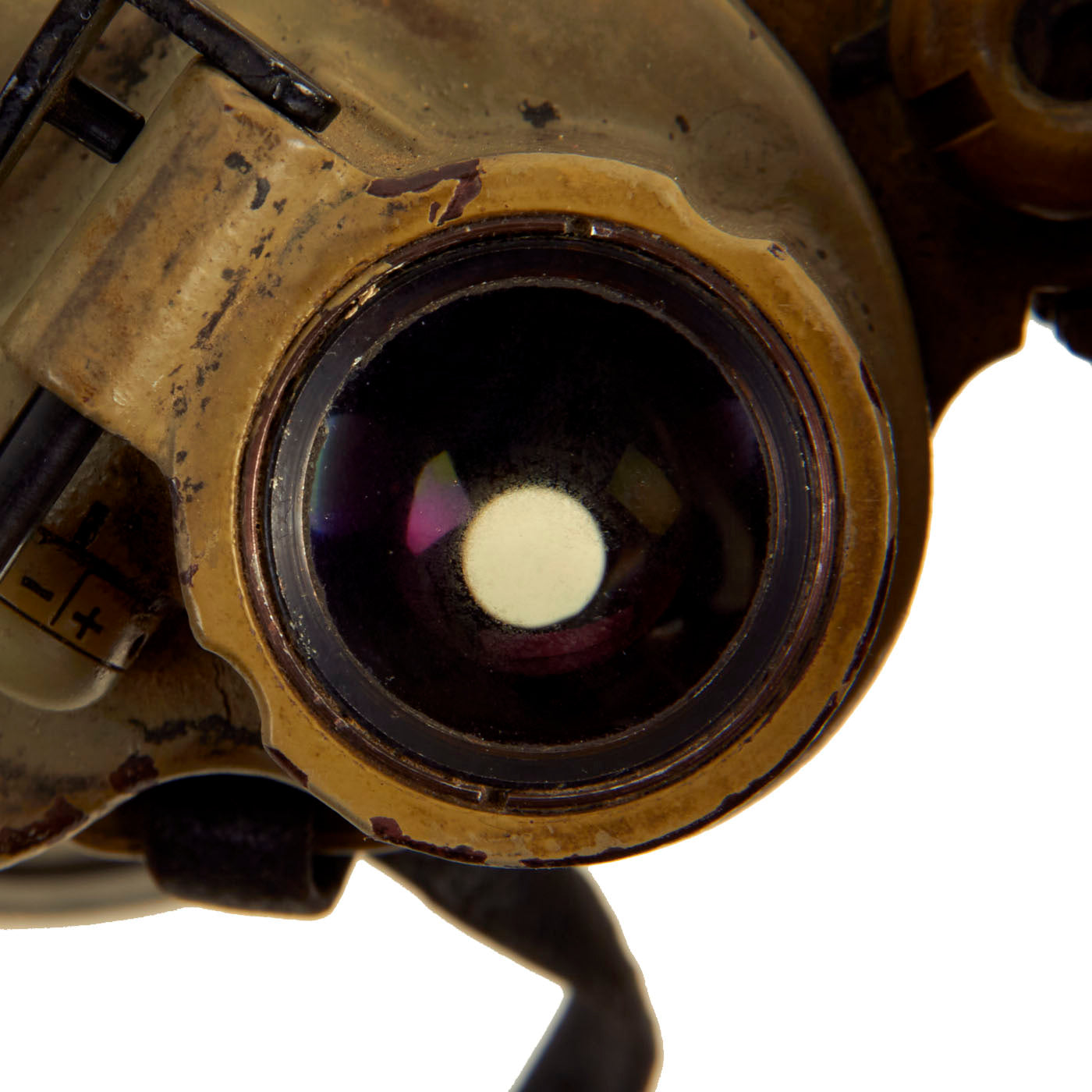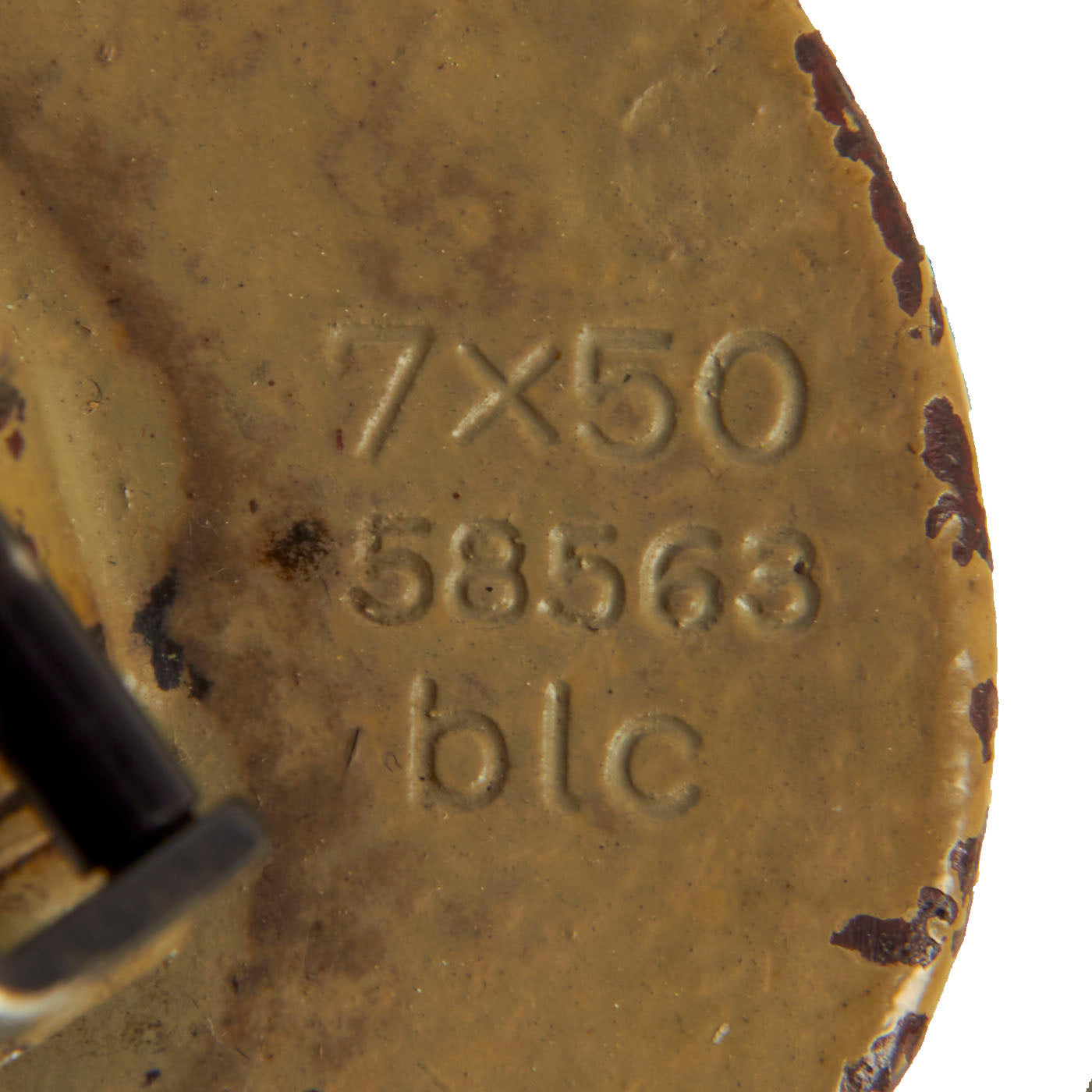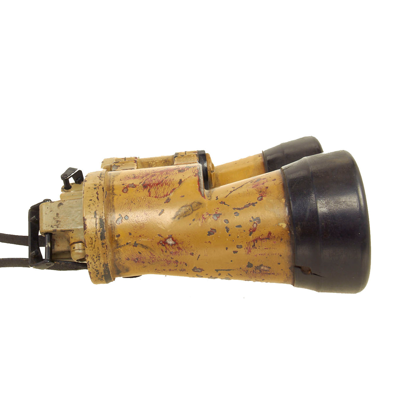 Original Item: Only One Available. This is a very good pair of extremely rare German WWII Kriegsmarine U-boat 7x50 binoculars, made by Carl Zeiss of Jena, a specialist lens maker, and one of the finest makers of the time. They are equipped with rubber fittings around the objective lenses though it does appear that these may have had more rubber pieces but were removed. Rubber fitted optics made them virtually impervious to moisture, possibly even if immersed in water for a short time, definitely a plus on a U-boat! As they normally have the rubber fittings, the eyepieces do not have bakelite cups, as they are part of the rubber molding, though they are not present in this example.