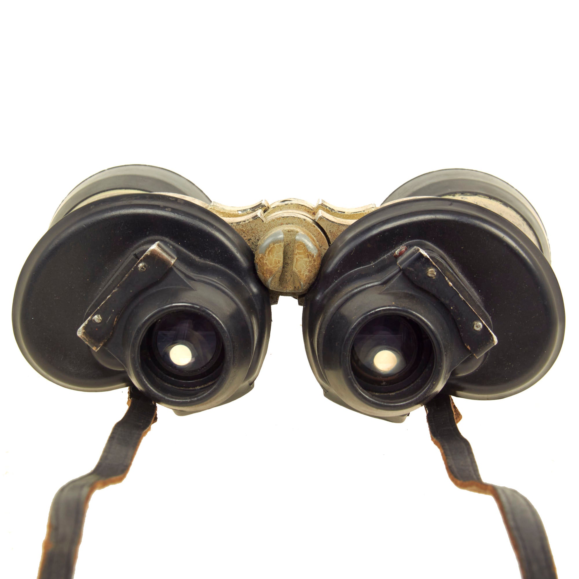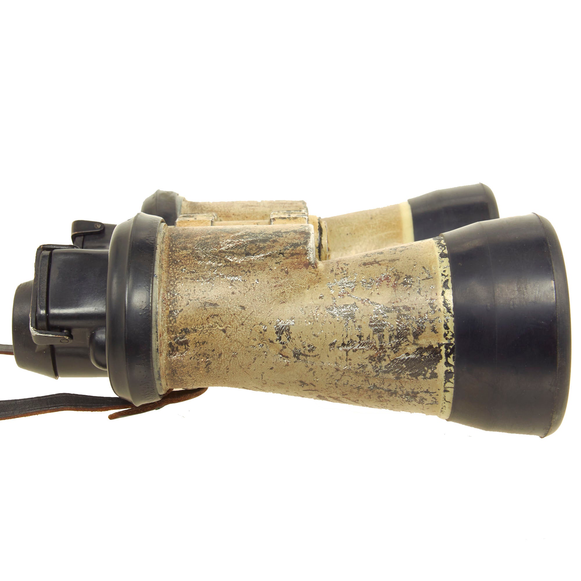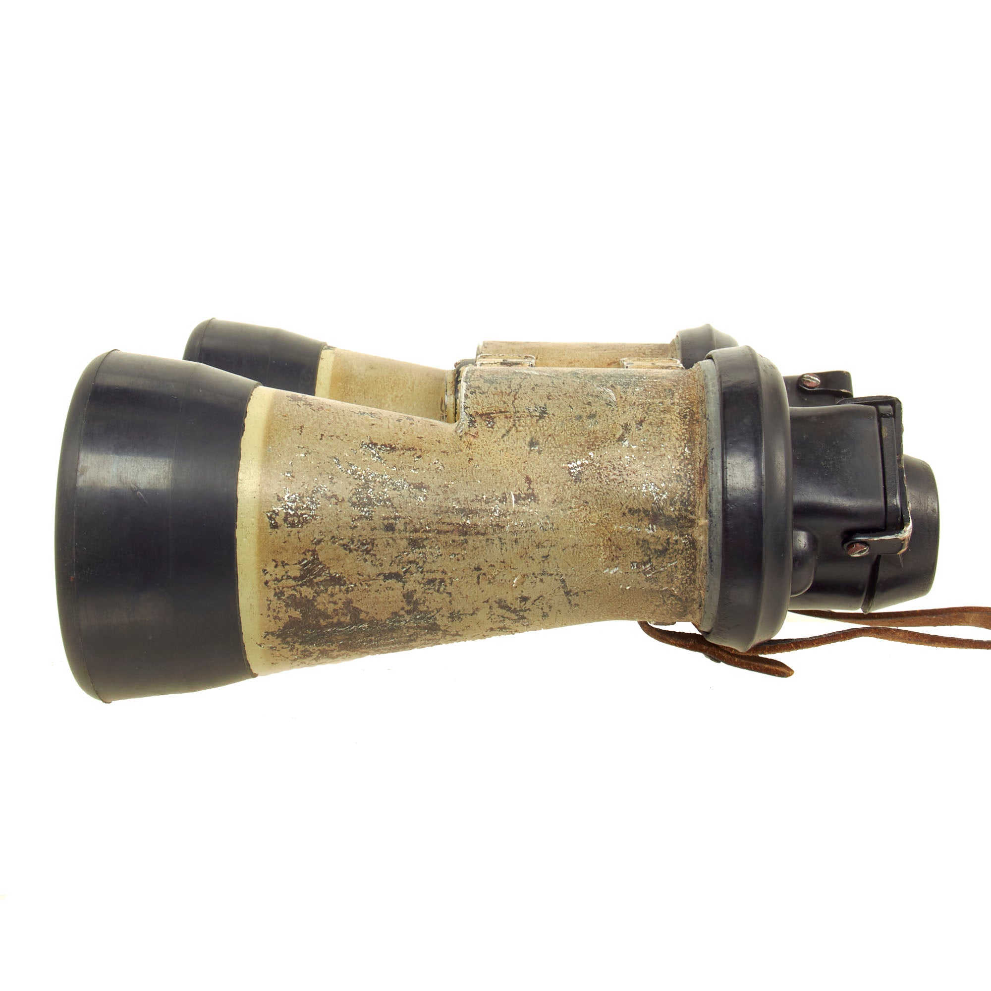 Original Item: Only One Available. This is a very good pair of extremely rare German WWII Kriegsmarine U-boat 7x50 binoculars, made by Carl Zeiss of Jena, a specialist lens maker, and one of the finest makers of the time. They are equipped with rubber fittings around the objective lenses though it does appear that these may have had more rubber pieces but were removed. Rubber fitted optics made them virtually impervious to moisture, possibly even if immersed in water for a short time, definitely a plus on a U-boat! As they normally have the rubber fittings, the eyepieces do not have bakelite cups, as they are part of the rubber molding.