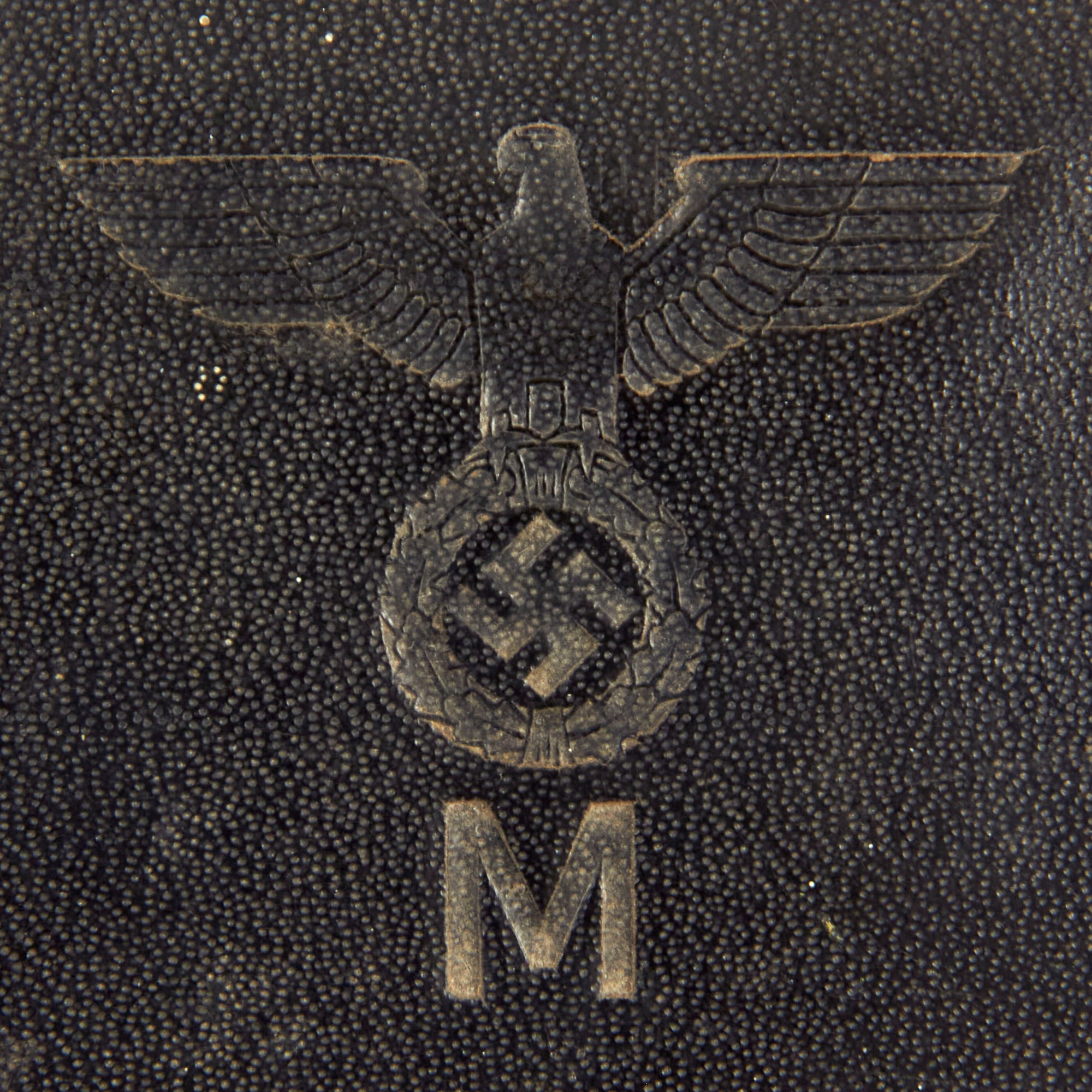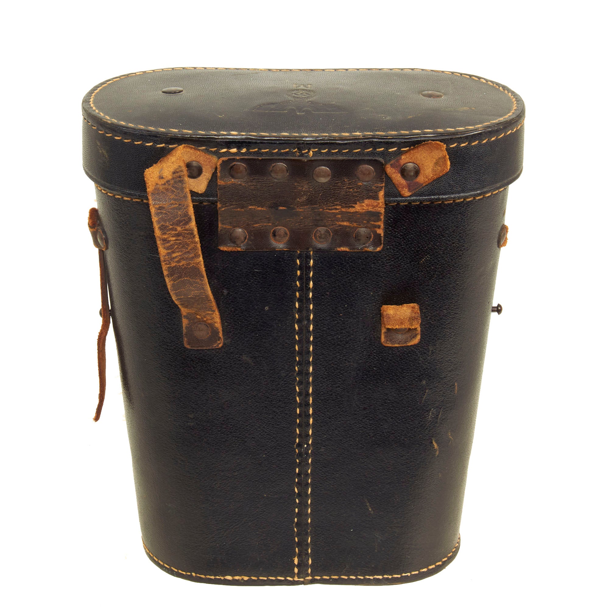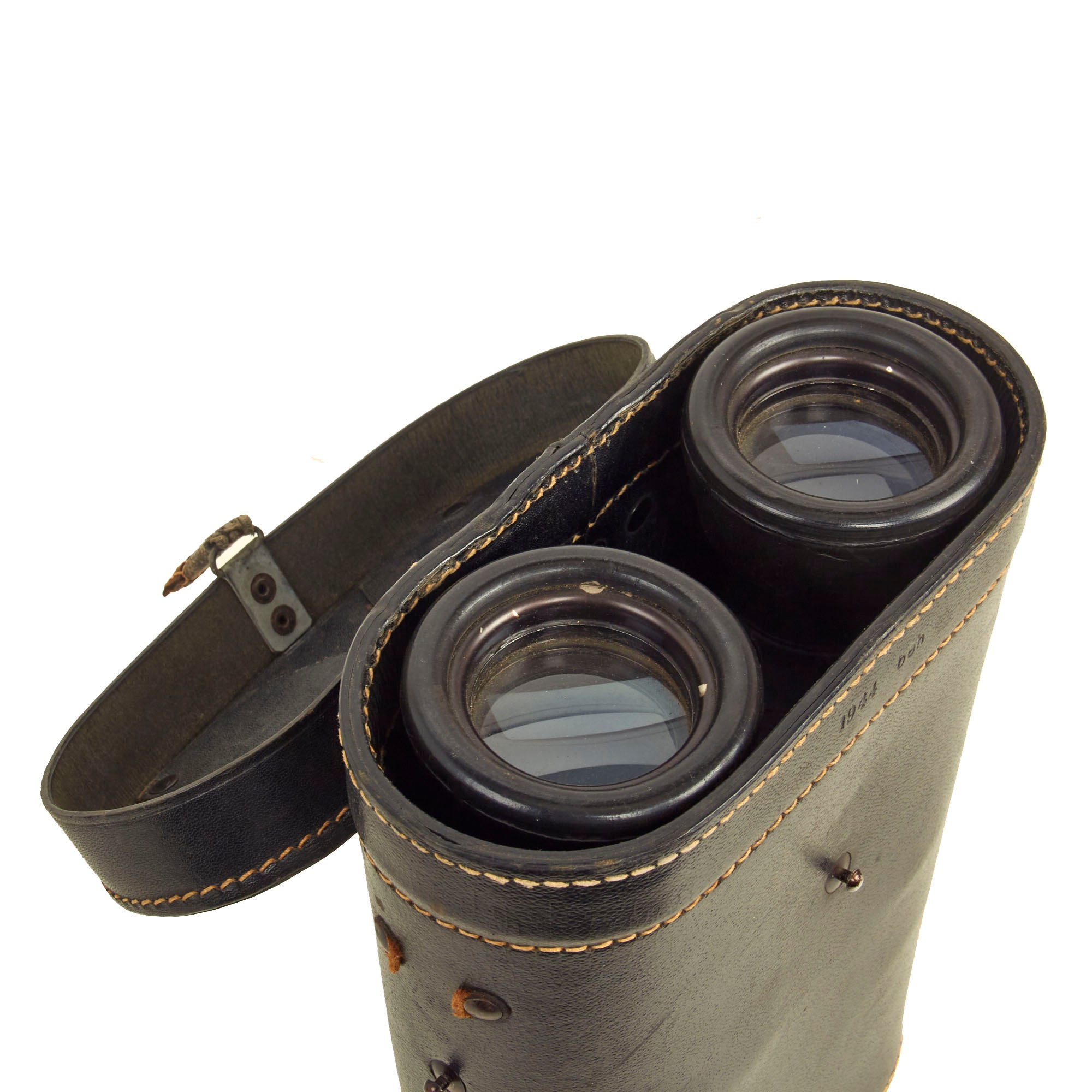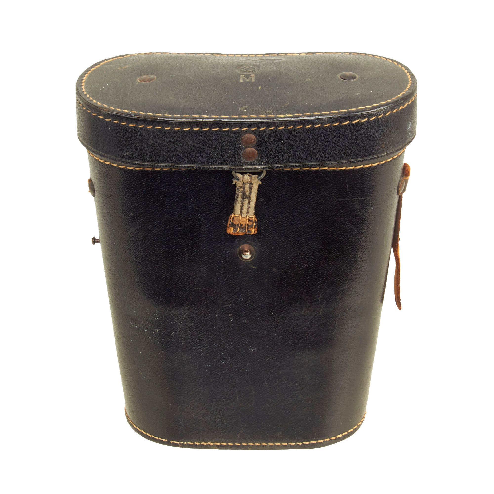 The binoculars come in their original black issue case, which has the Kriegsmarine Eagle / M proof on the lid. Under the lid is maker code and date 1944 beh, so these were also made by Leitz.