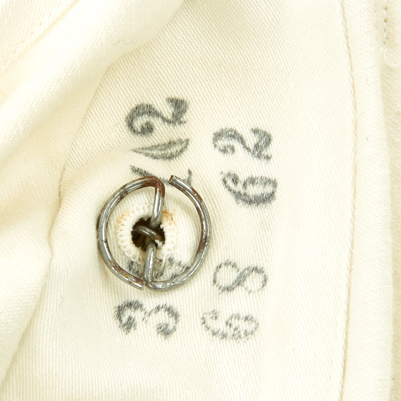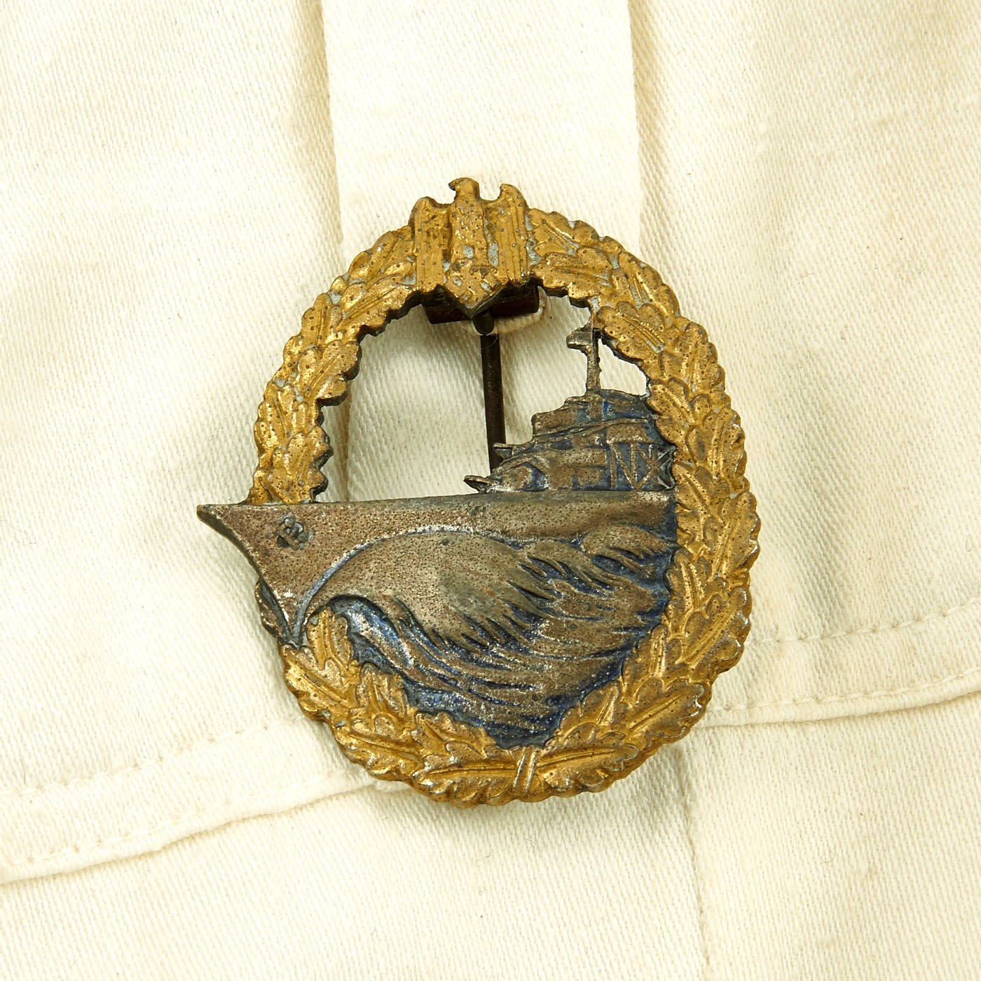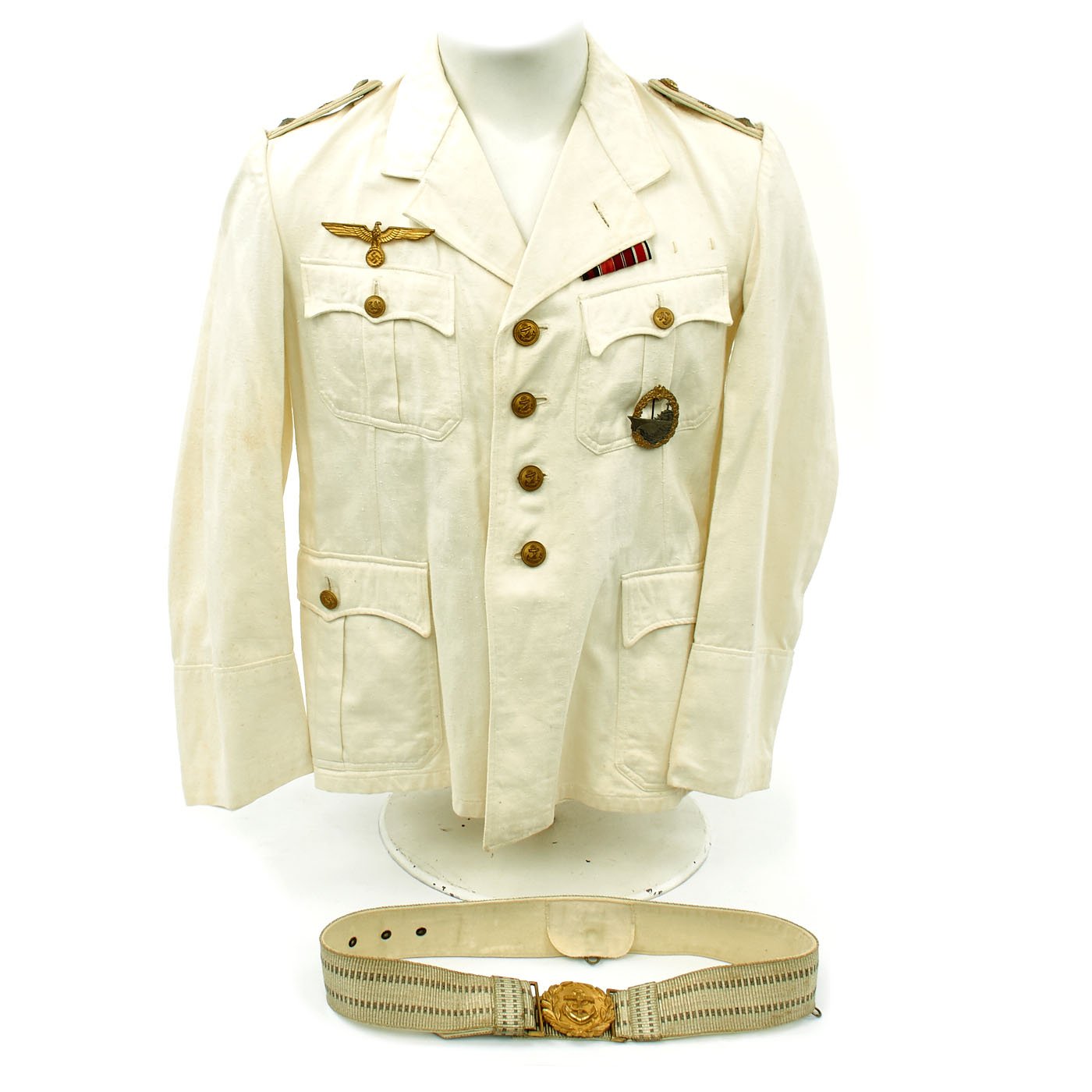 The right breast above the pocket is enriched with a Summer Kriegsmarine breast eagle insignia pin held in place via two horizontally-aligned vertical loops in white threading. Above the left breast pocket is a medal ribbon with Iron Cross 2nd class medal ribbon, Eastern front medal ribbon, Anschluss medal ribbon, and Sudetenland Medal medal ribbon. There are two more vertical thread loops for additional medal ribbons. Below the pocket is a Destroyer War Badge makers marked R.S. and held in place by pin back inside two loops. R.S. indicates manufacture by Rudolf Suval of Wien.