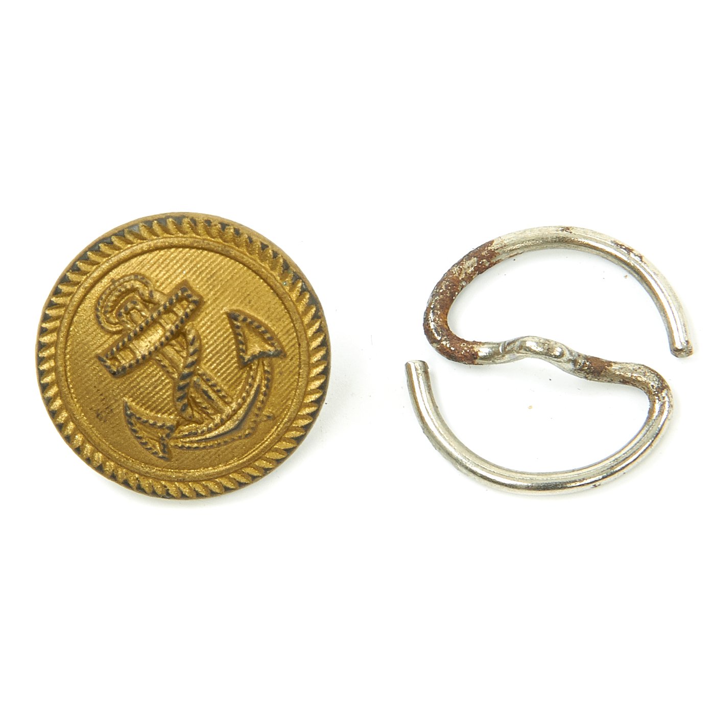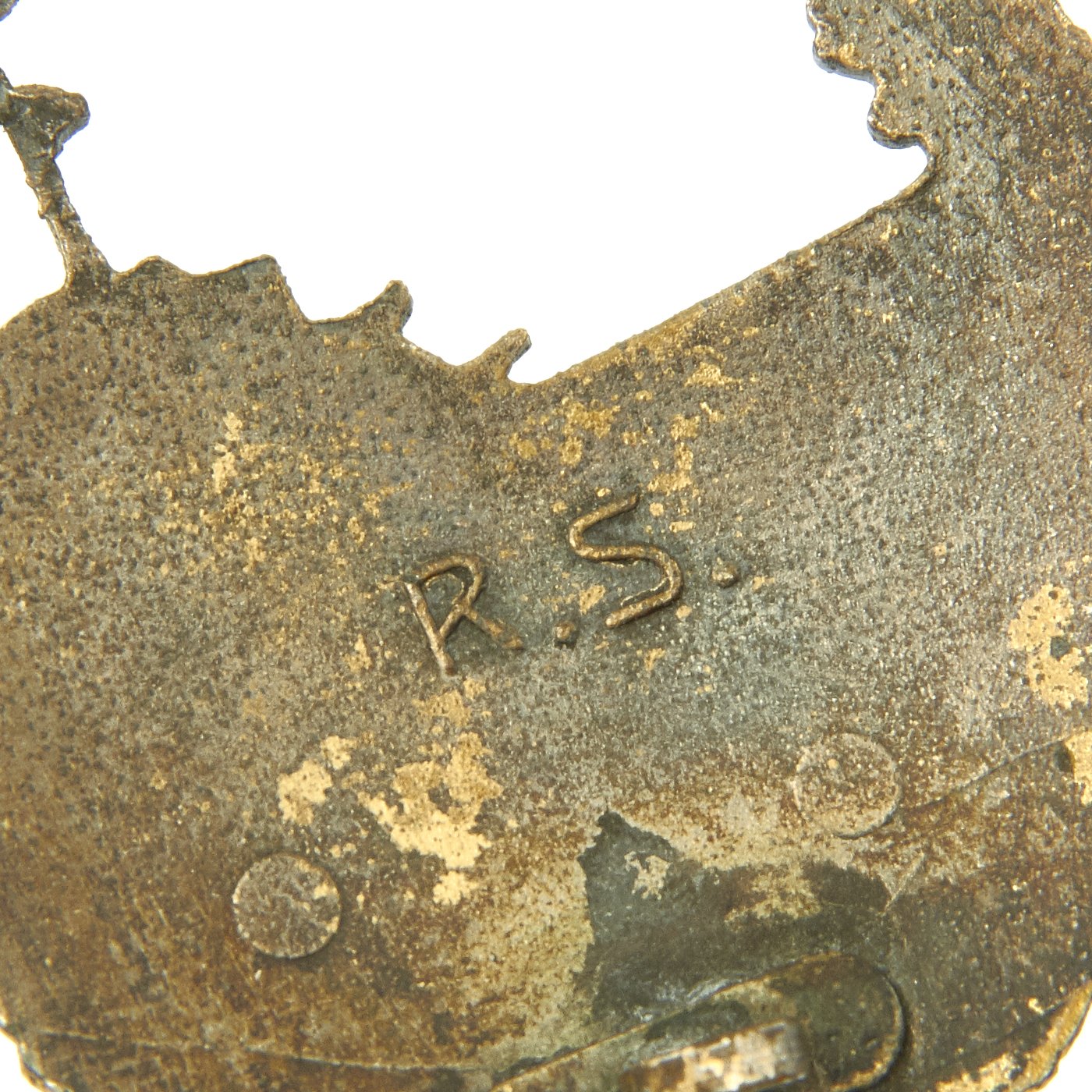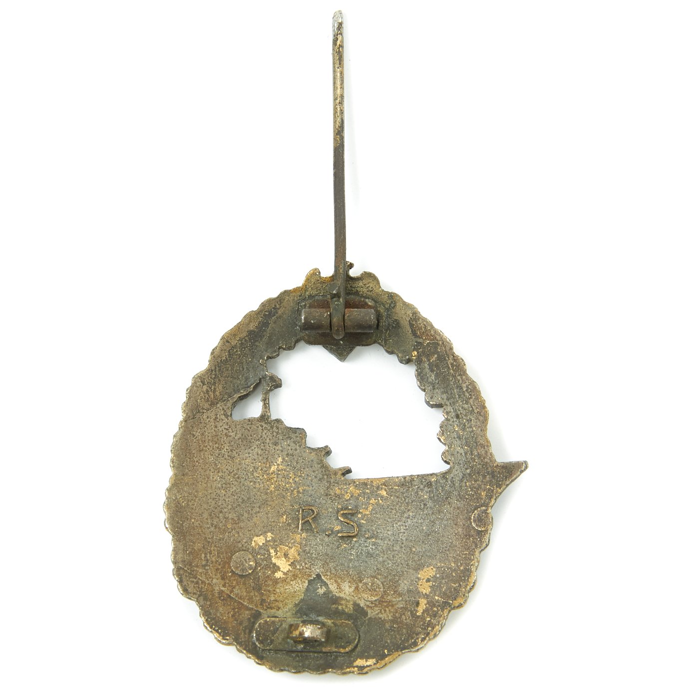 The right breast above the pocket is enriched with a Summer Kriegsmarine breast eagle insignia pin held in place via two horizontally-aligned vertical loops in white threading. Above the left breast pocket is a medal ribbon with Iron Cross 2nd class medal ribbon, Eastern front medal ribbon, Anschluss medal ribbon, and Sudetenland Medal medal ribbon. There are two more vertical thread loops for additional medal ribbons. Below the pocket is a Destroyer War Badge makers marked R.S. and held in place by pin back inside two loops. R.S. indicates manufacture by Rudolf Suval of Wien.