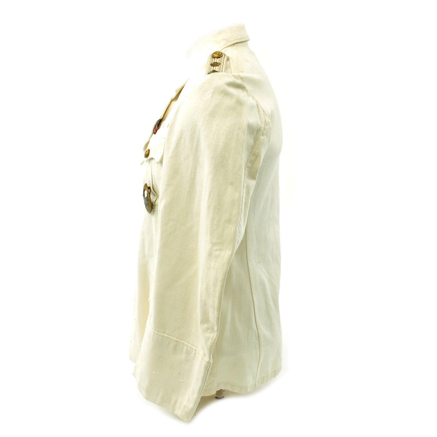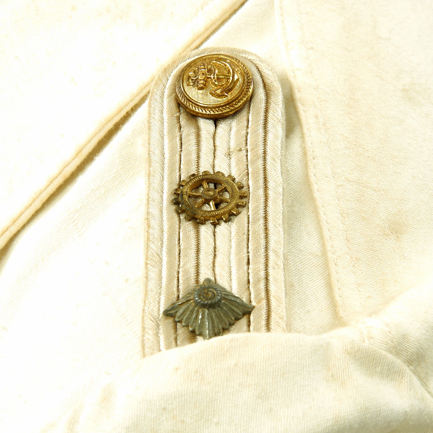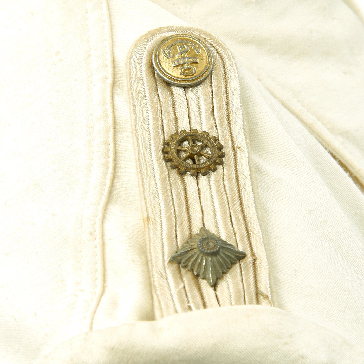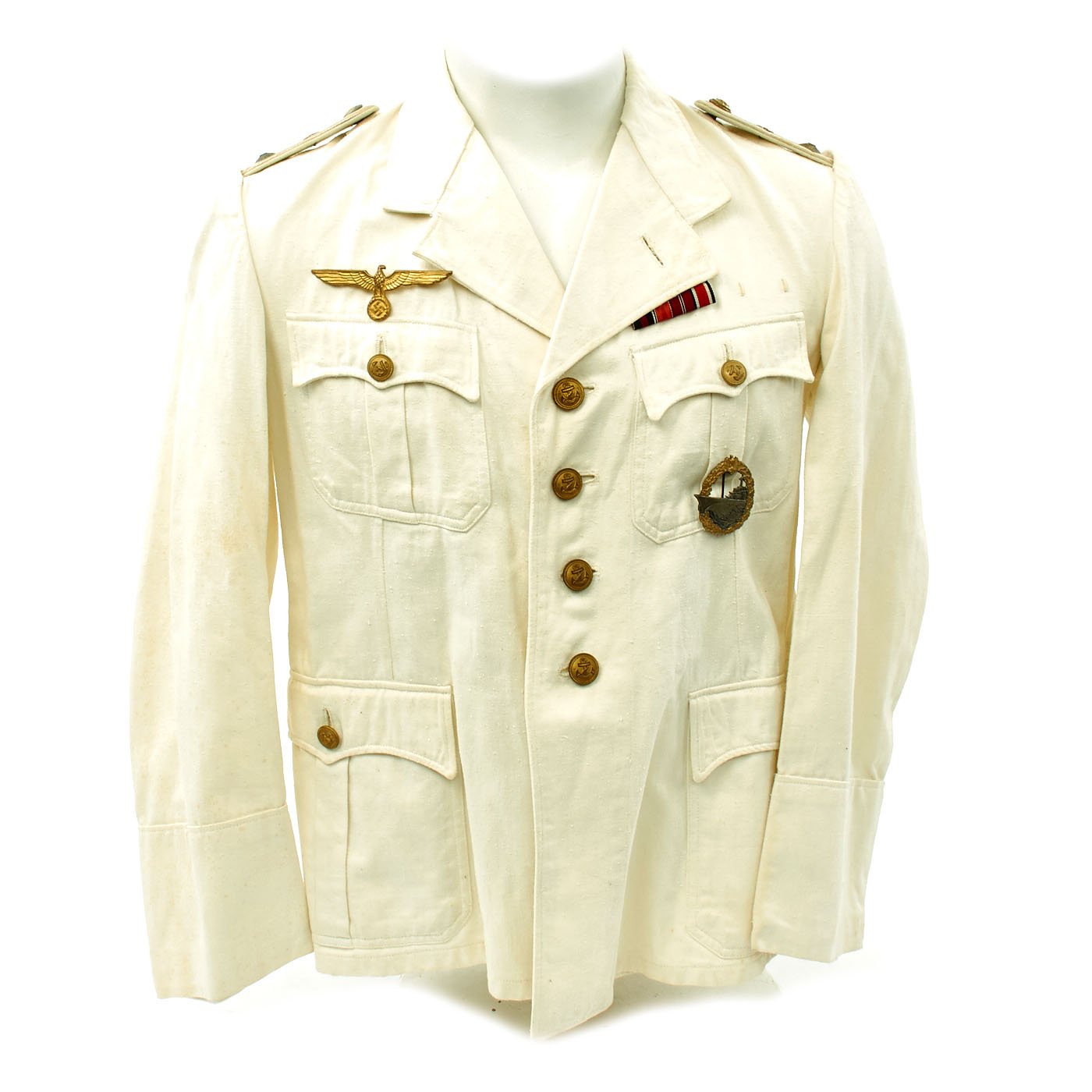 Original Item: Only One Available. This wonderful condition summer tunic is fabricated from a white cotton-rayon blend. The shoulders are adorned with Kriegsmarine Oberleutnant shoulder boards incorporating rows of silvered aluminum wire, the end creating a button hole for a Kriegsmarine gilt button. There is also a cog wheel on the should boards which indicates a mechanical officer, an officer responsible for the operation and maintenance of the ship.