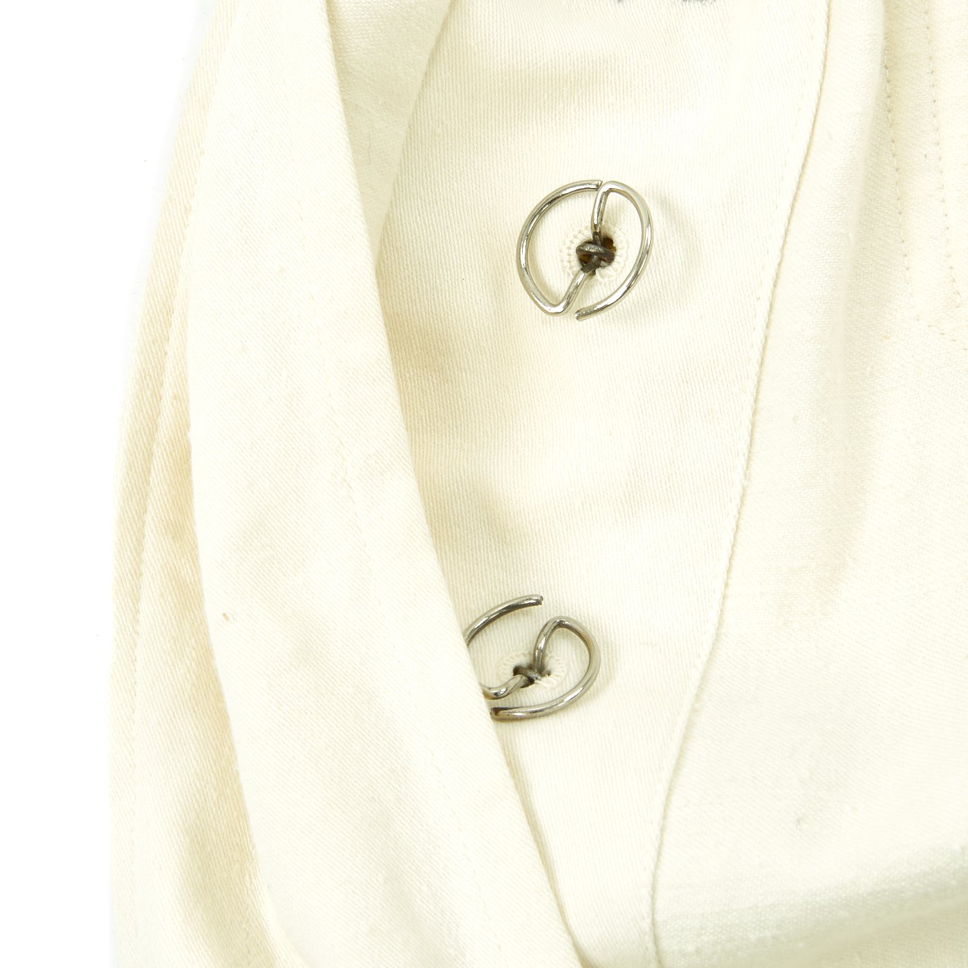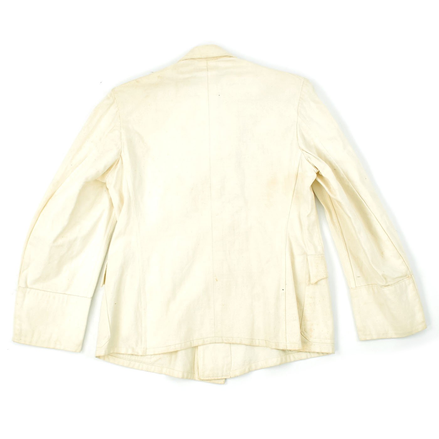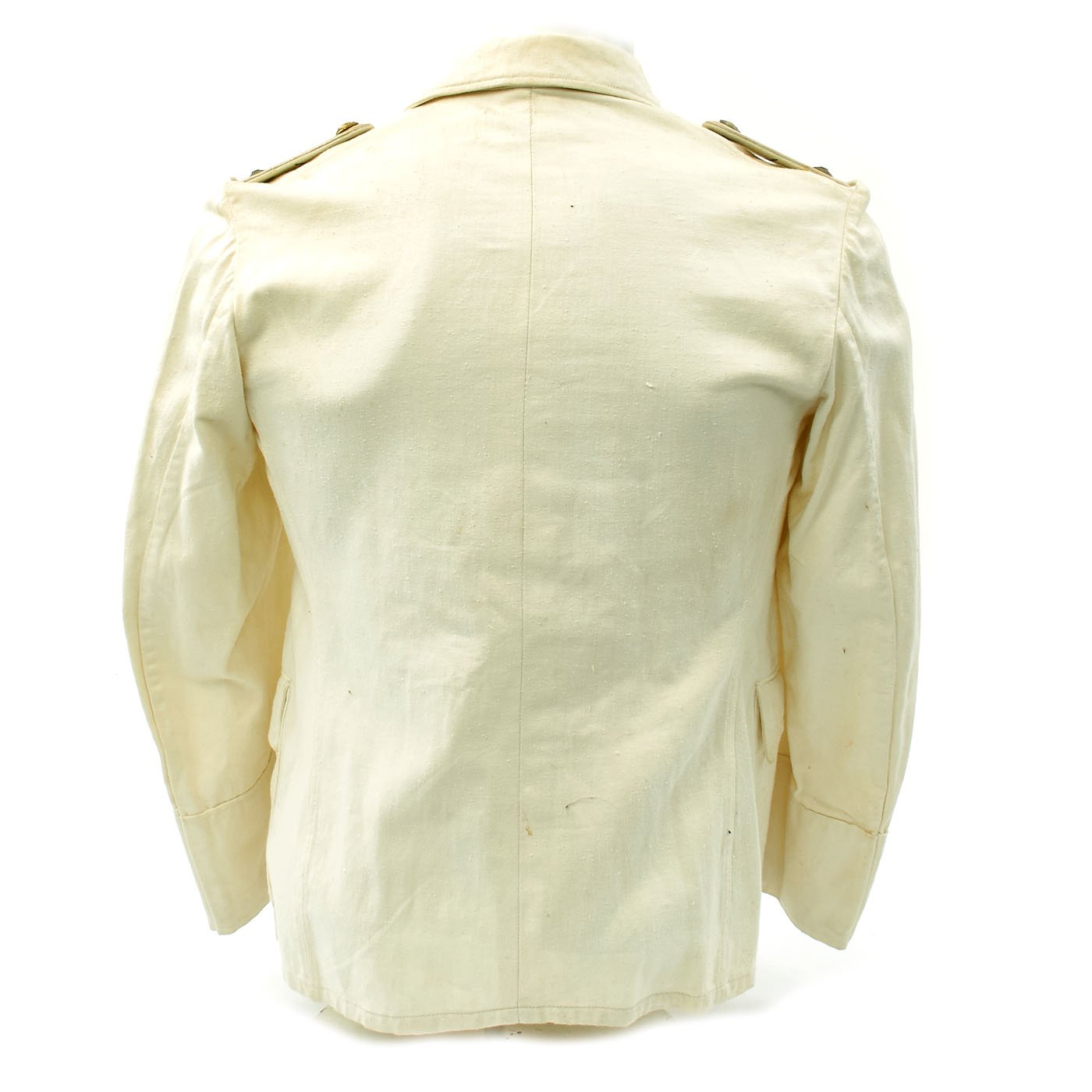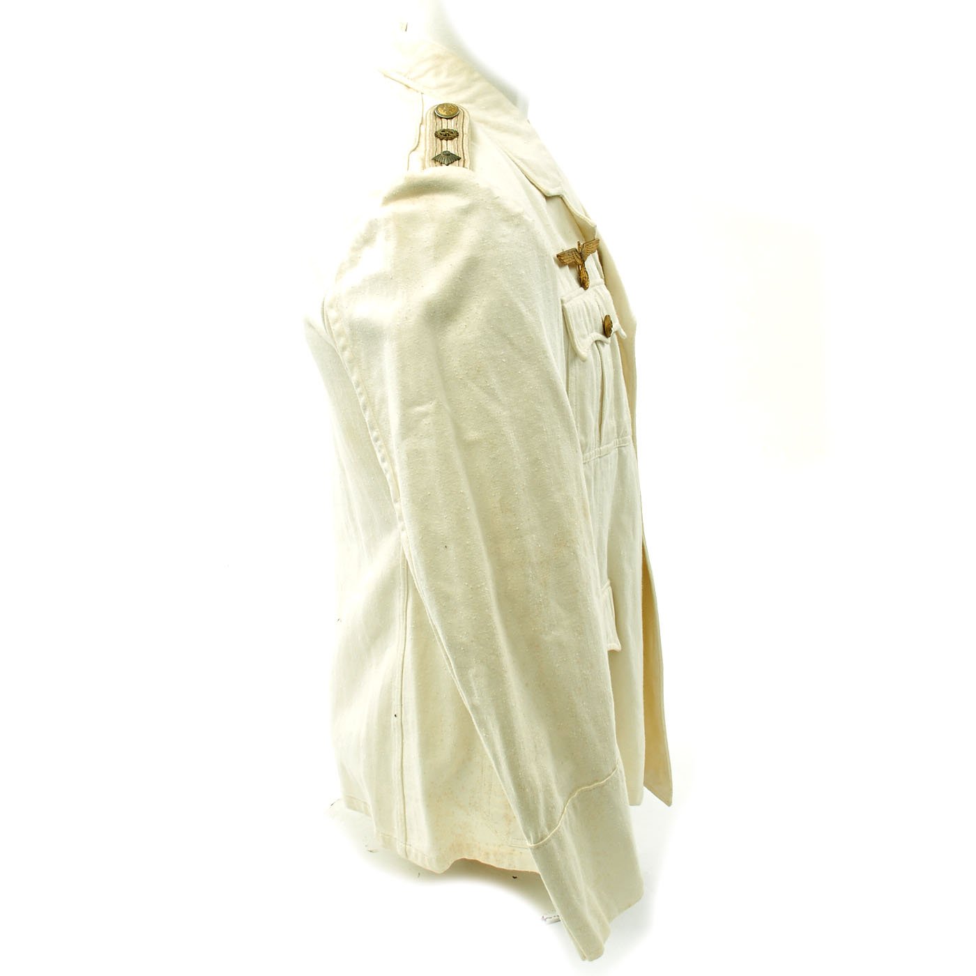 Original Item: Only One Available. This wonderful condition summer tunic is fabricated from a white cotton-rayon blend. The shoulders are adorned with Kriegsmarine Oberleutnant shoulder boards incorporating rows of silvered aluminum wire, the end creating a button hole for a Kriegsmarine gilt button. There is also a cog wheel on the should boards which indicates a mechanical officer, an officer responsible for the operation and maintenance of the ship.