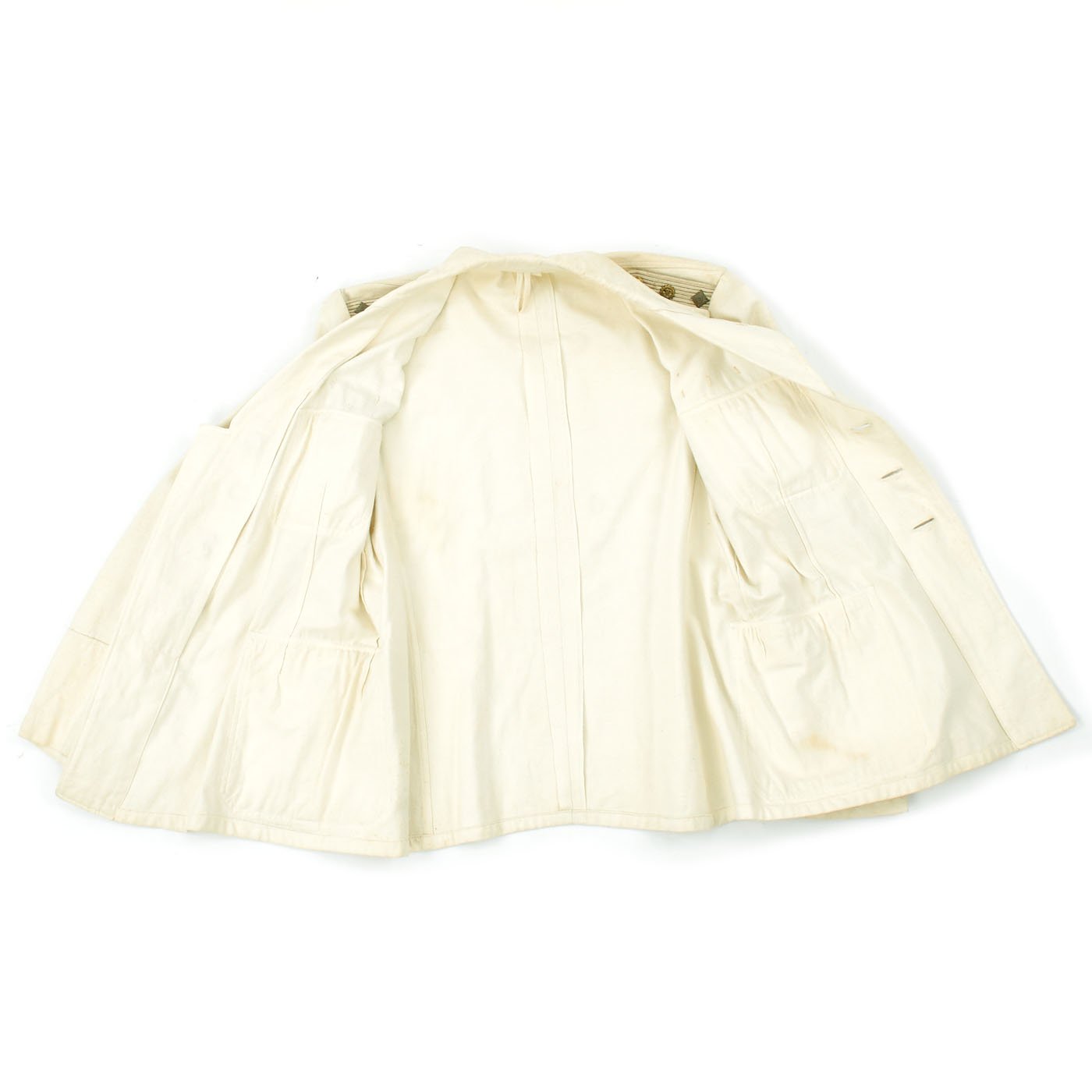 There are four pockets on the front, one on each breast and larger ones at the waist on both sides, each designed with a decorative pleat and gilt Kriegsmarine buttons, each of which is maker marked and are held in place by rings on the underside and embedded in the pleat.