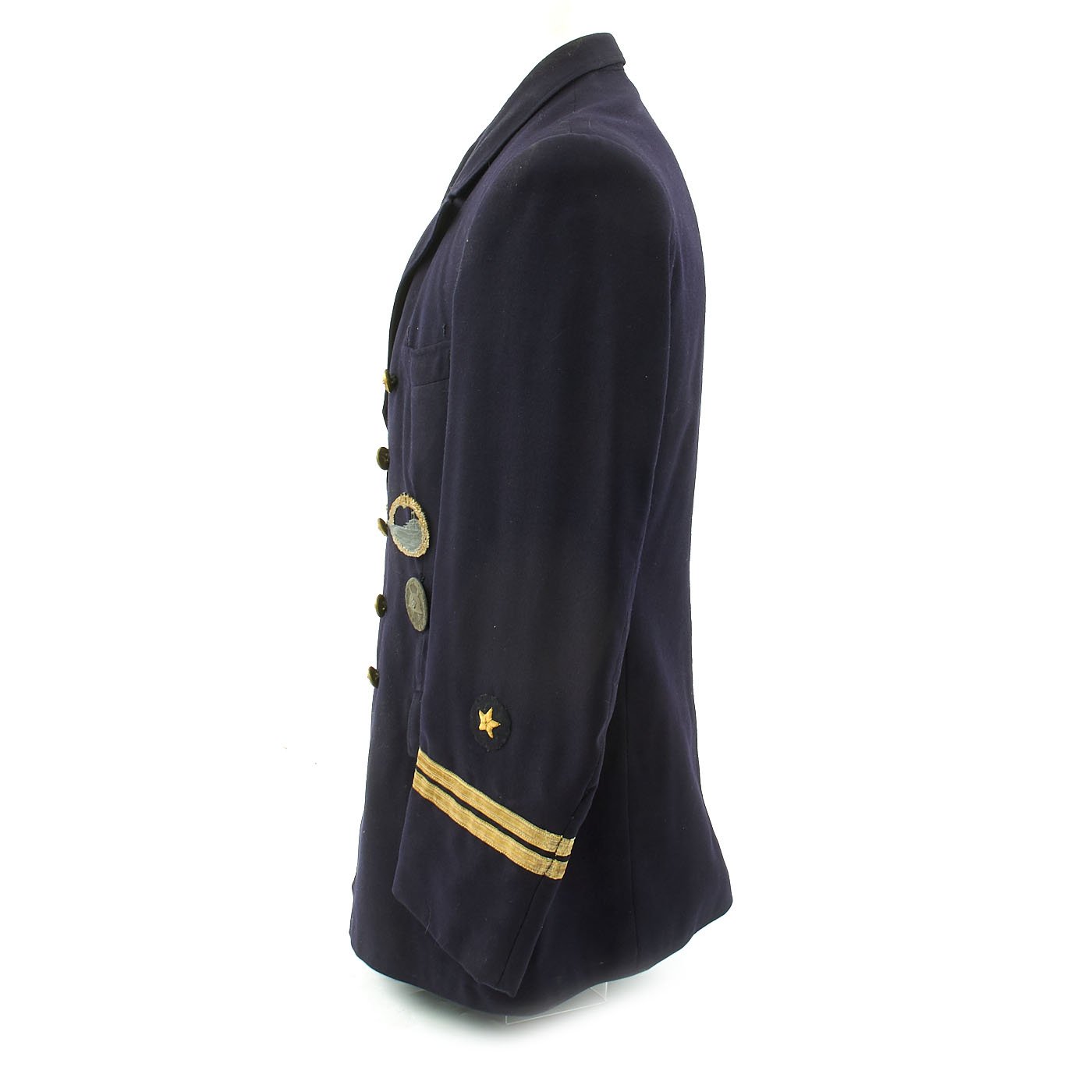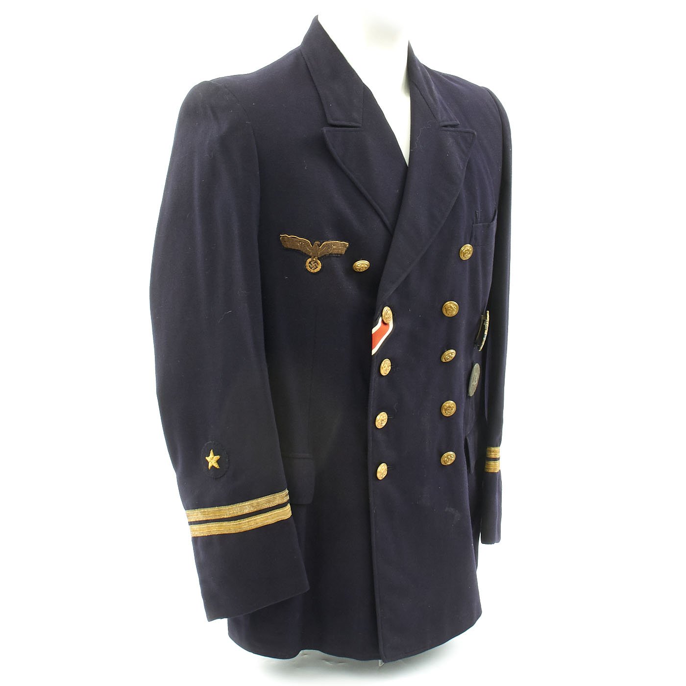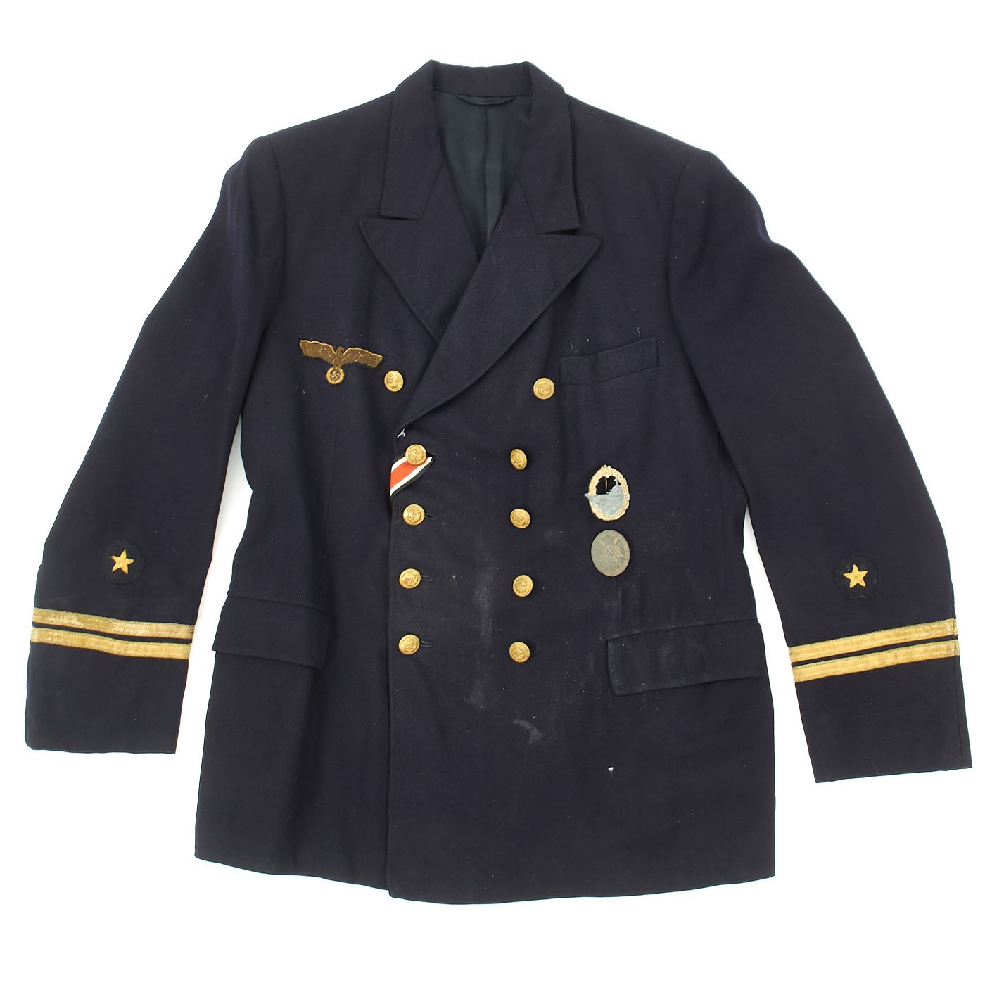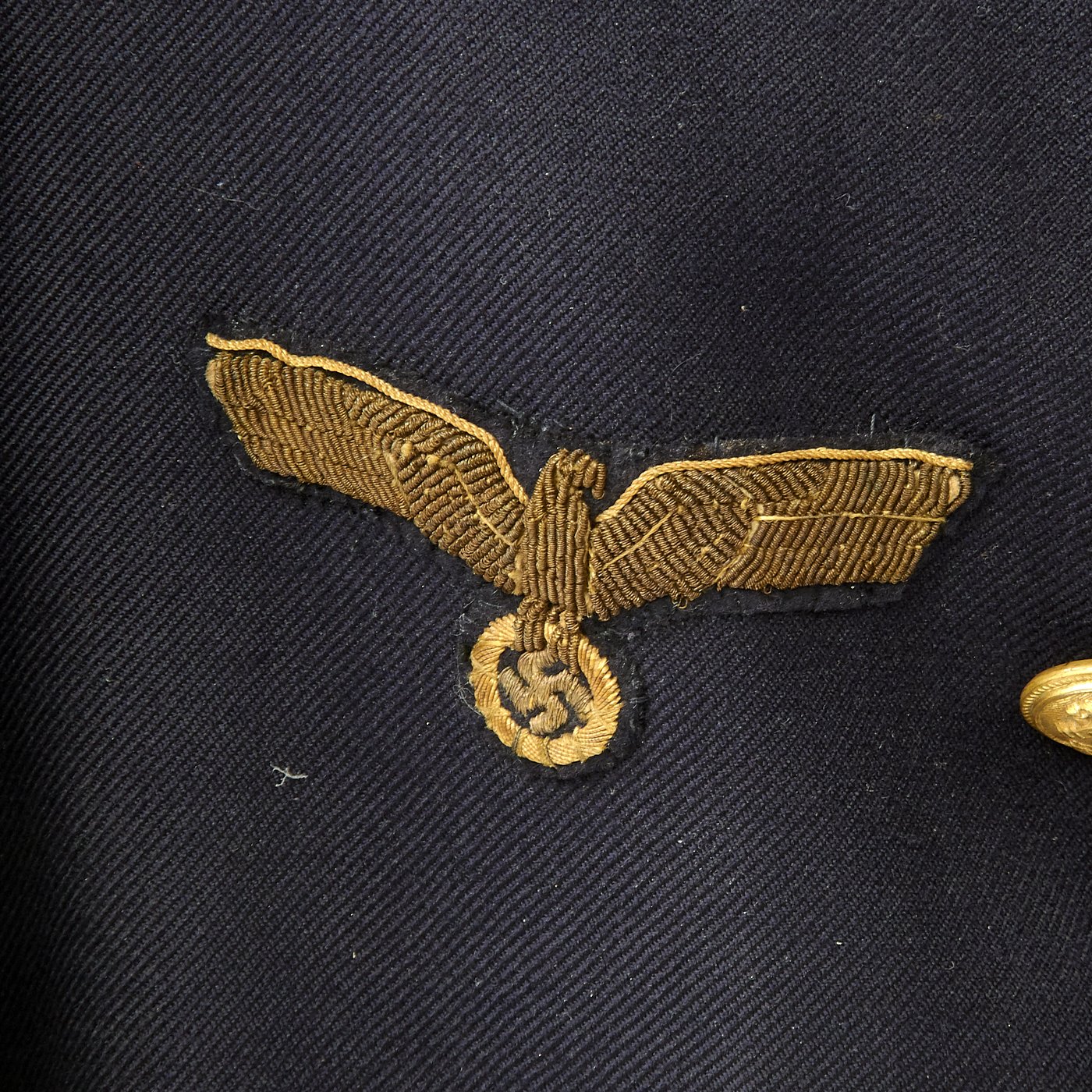 Jacket is of wool construction, double breasted open collar having ten gilt fouled anchor button closure and two gilt ribbon cuff bands denoting rank of Oberleutnant zur See with bullion caduceus insignia on each sleeve. Bullion chest eagle, Iron Cross second class button hole ribbon are affixed to the jacket. Interior is lined in black satin like material with two internal pockets. Jacket is offered in very good condition.