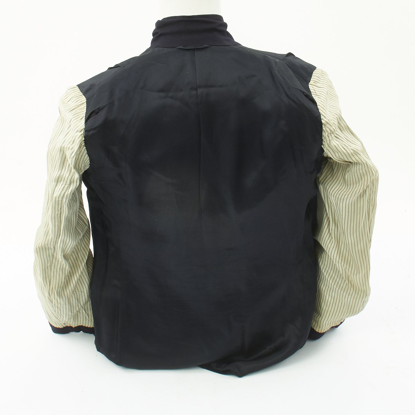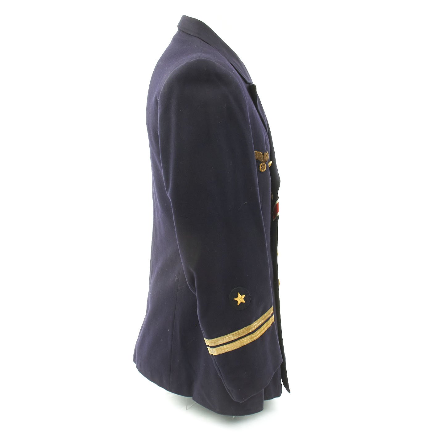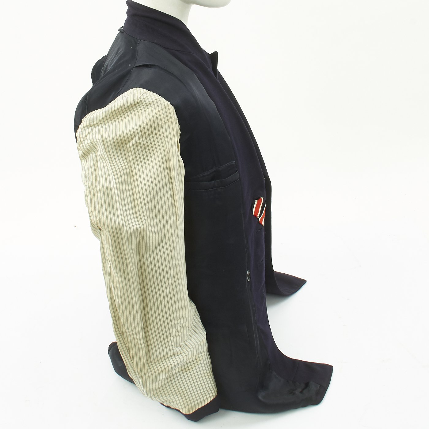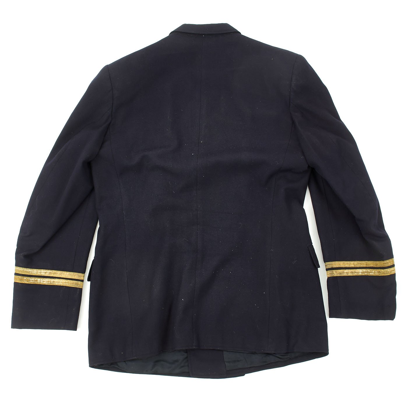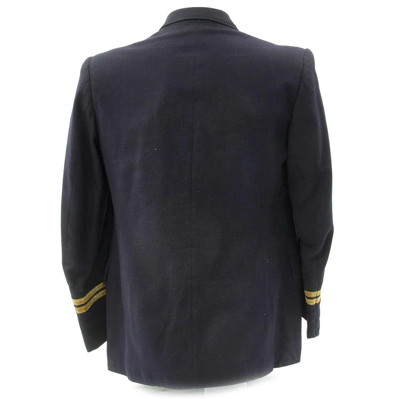 Jacket is of wool construction, double breasted open collar having ten gilt fouled anchor button closure and two gilt ribbon cuff bands denoting rank of Oberleutnant zur See with bullion caduceus insignia on each sleeve. Bullion chest eagle, Iron Cross second class button hole ribbon are affixed to the jacket. Interior is lined in black satin like material with two internal pockets. Jacket is offered in very good condition.