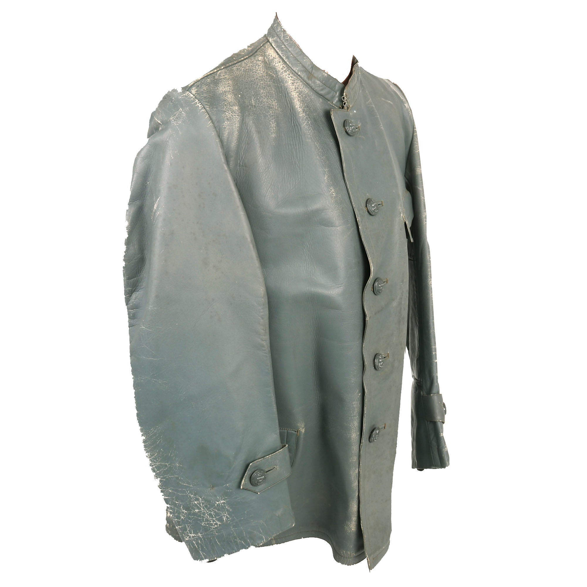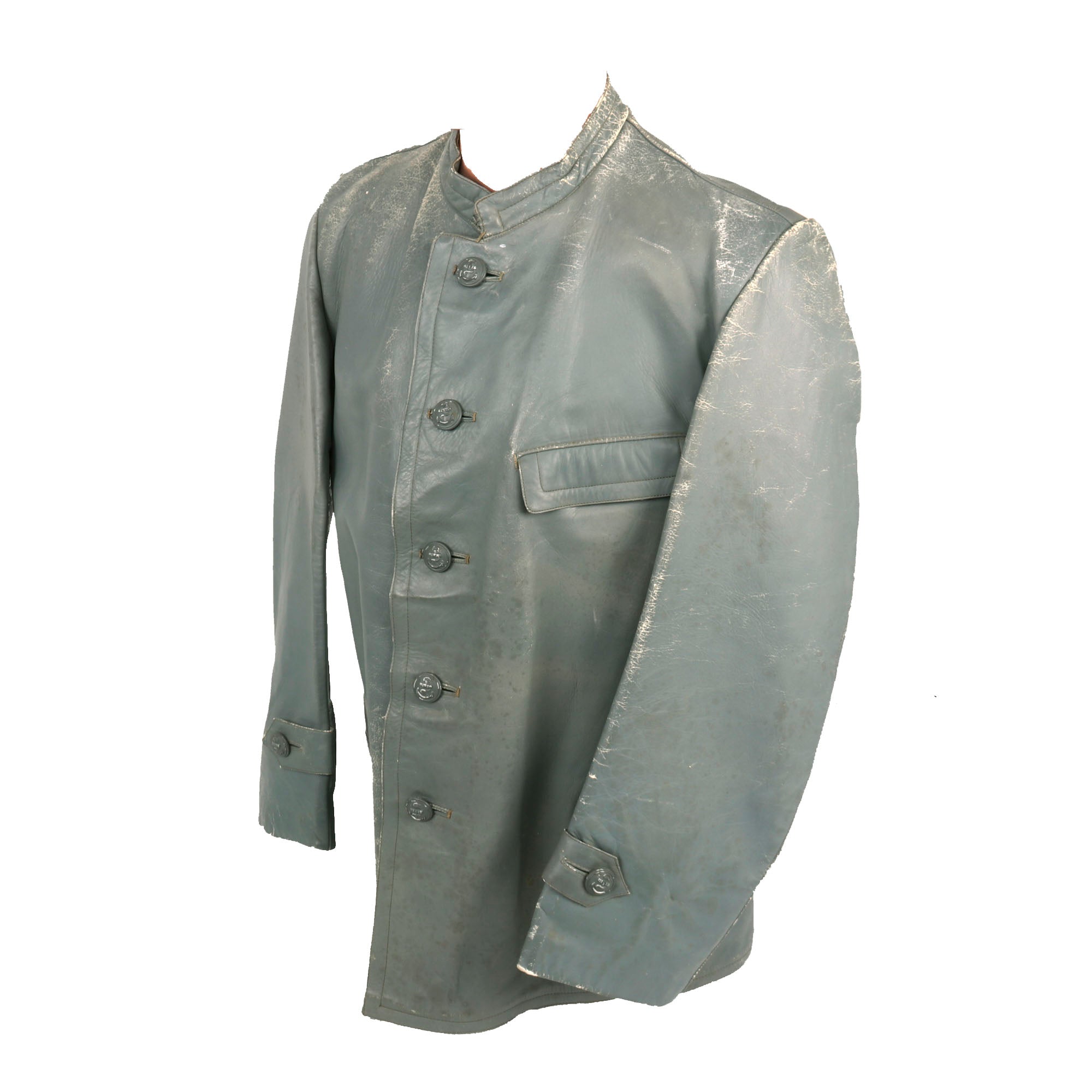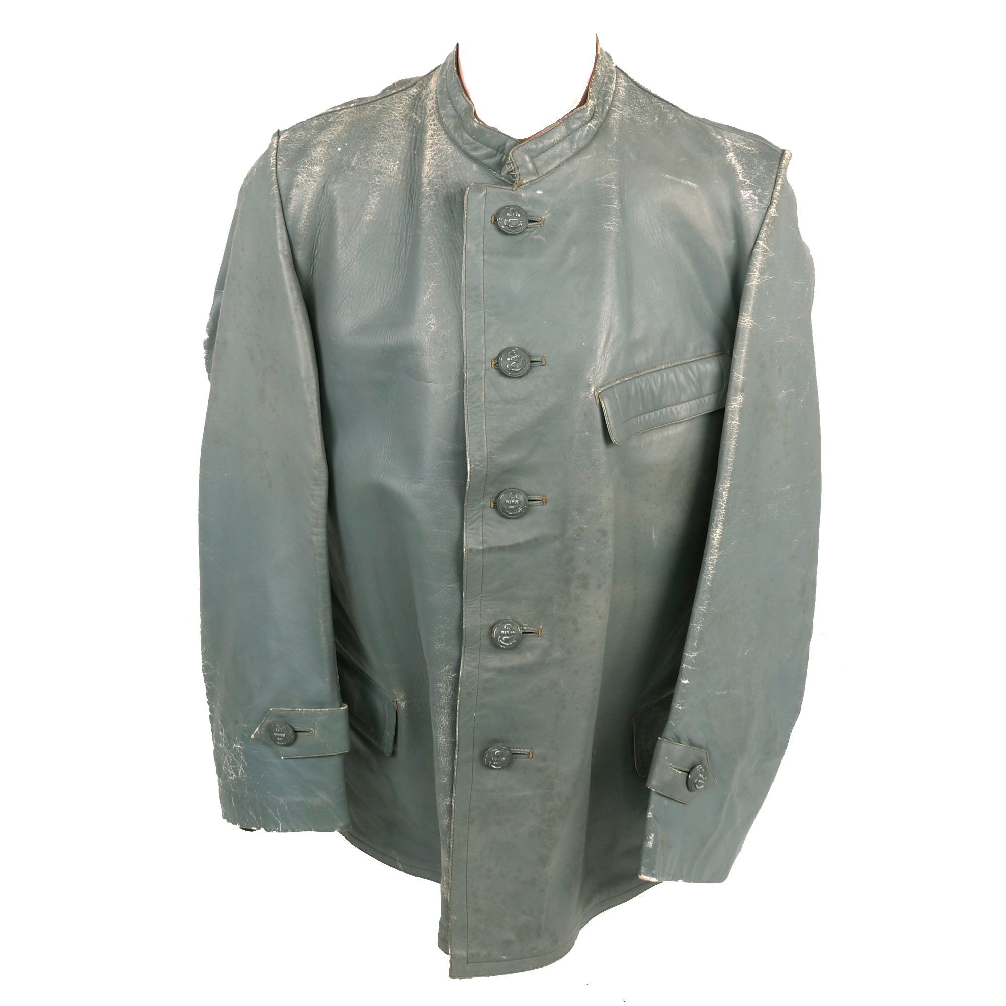 Original Items: Only One Set Available. This is an outstanding two piece, grey leather deck uniform in a variant pattern as worn by lower ranked Kriegsmarine personnel. The jacket, of heavy grey leather with a five-button front furnished with gray finished magnetic buttons, which are marked on the back with maker OVERHOFF & CIE with the <OLC> trademark at the bottom.