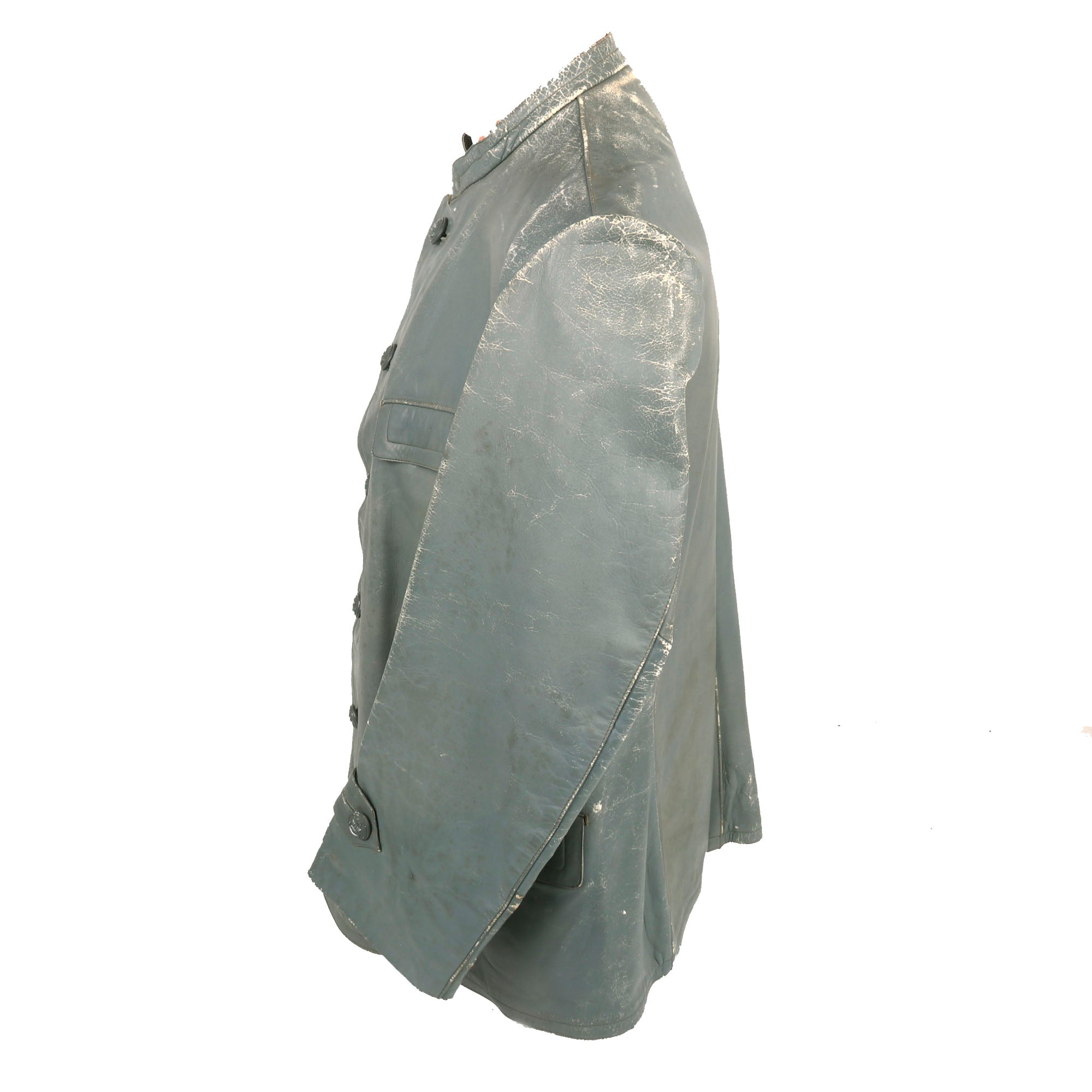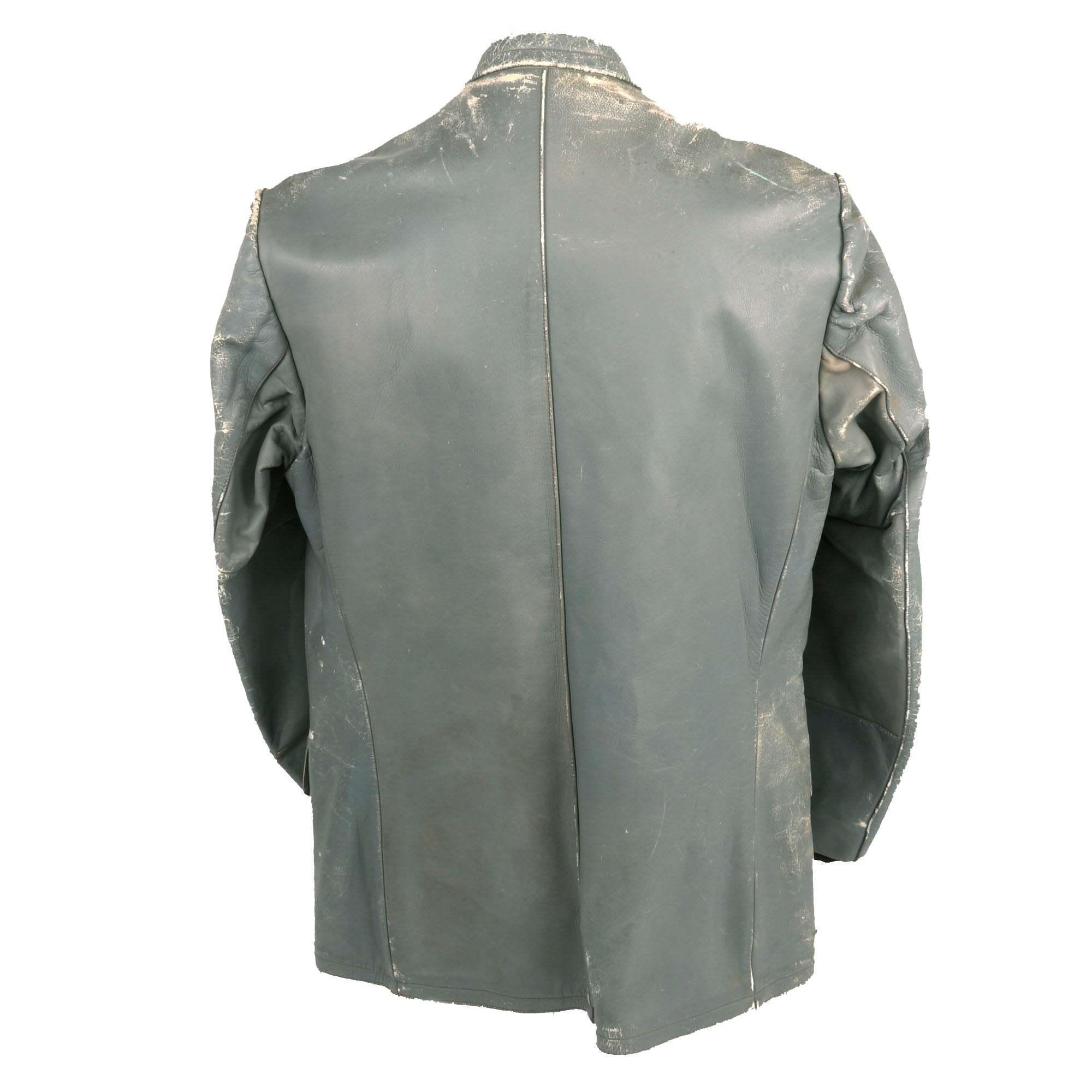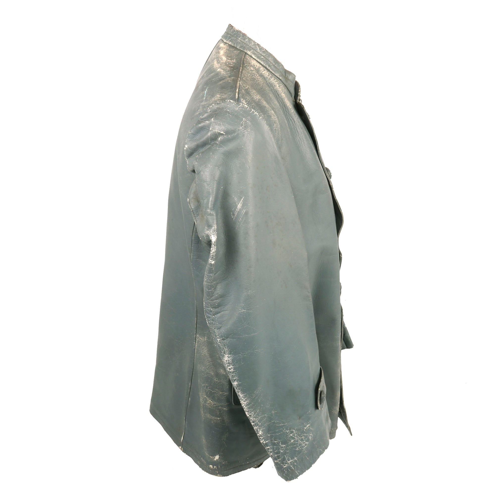 Original Items: Only One Set Available. This is an outstanding two piece, grey leather deck uniform in a variant pattern as worn by lower ranked Kriegsmarine personnel. The jacket, of heavy grey leather with a five-button front furnished with gray finished magnetic buttons, which are marked on the back with maker OVERHOFF & CIE with the <OLC> trademark at the bottom.