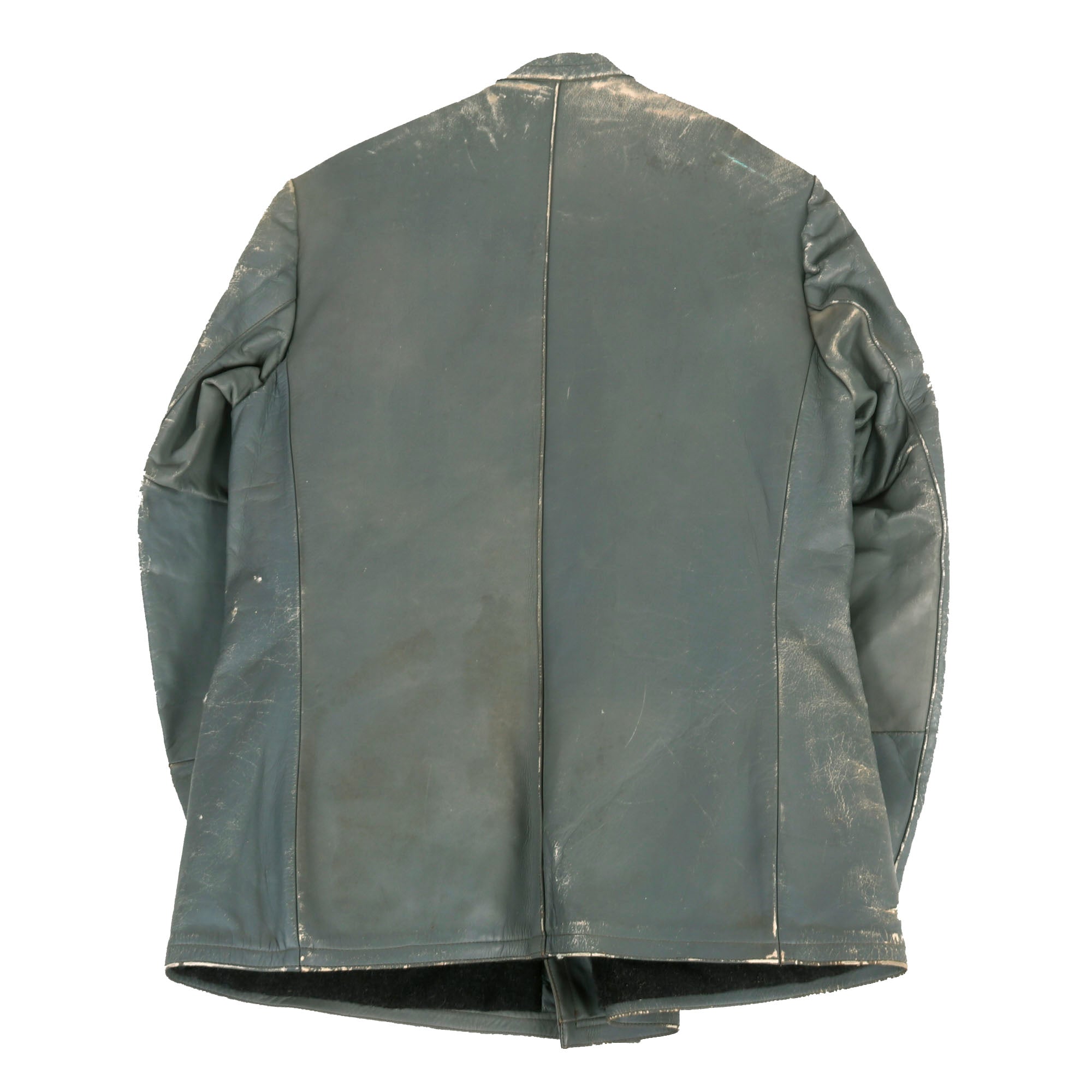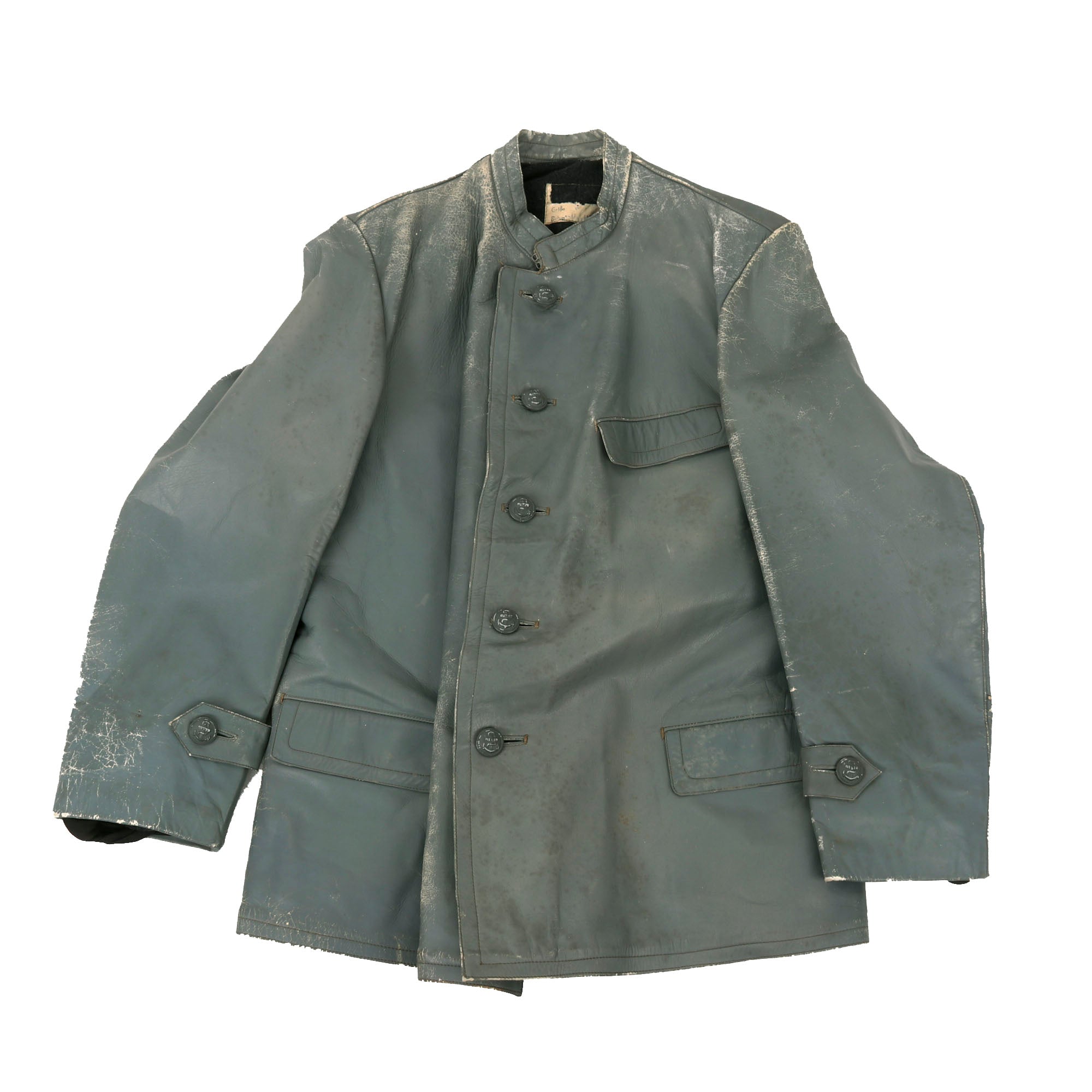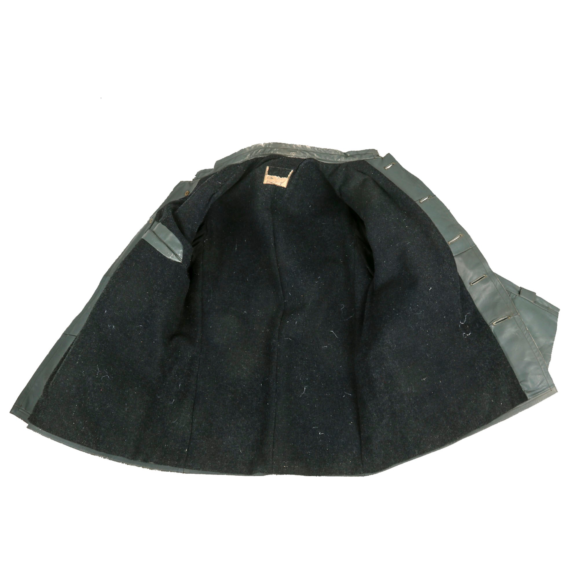It has a band collar (with hook closure) and two adjustment straps on each sleeve having the same buttons, though it looks like the second button on both has been lost. The exterior has the typical lower hip pockets and one upper breast pocket, all with top flaps but no closure buttons. The interior is lined with heavy black wool, while the sleeves are lined with soft cotton, terminating in elastic wool cuffs. There is an internal horizontal slash pocket on the right breast, as well as a worn partial label at the back of the neck area, which unfortunately does not have any particulars visible any more.