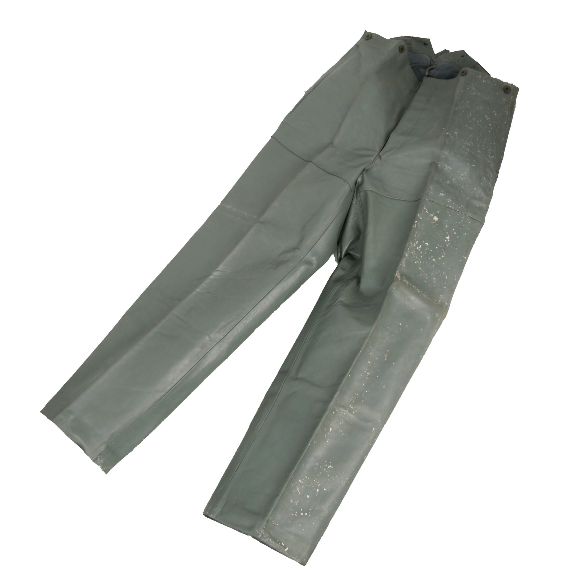 The closely matching trousers are of fine grey leather having exterior brace buttons on the waistband. The front of the trousers has a button fly with a metal hook at the top, and the rear has an opening with leather sizing strap and metal buckle. They are fully lined with blue cotton twill cloth and they retain a partial maker label, which is marked with size Große 54.