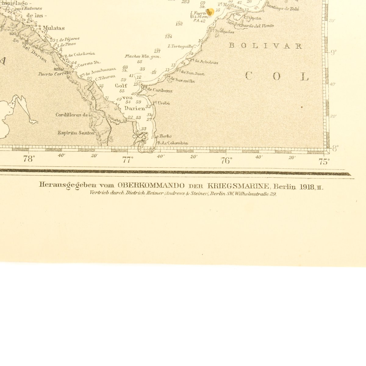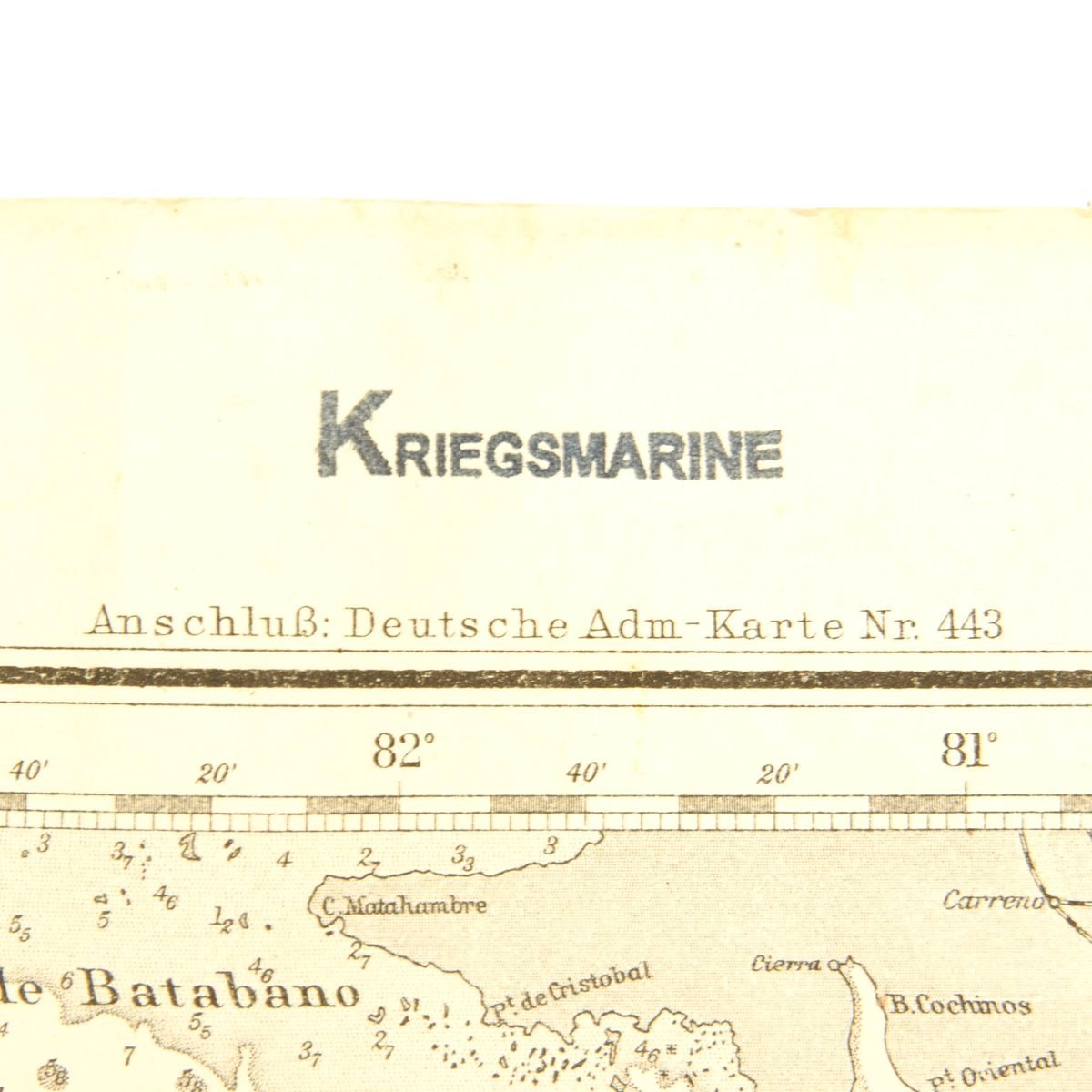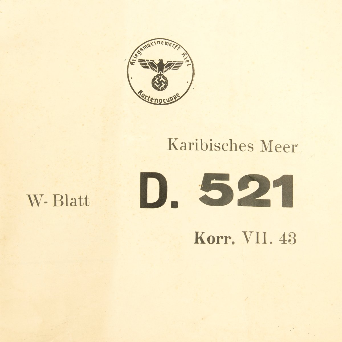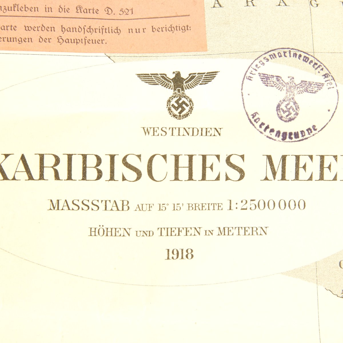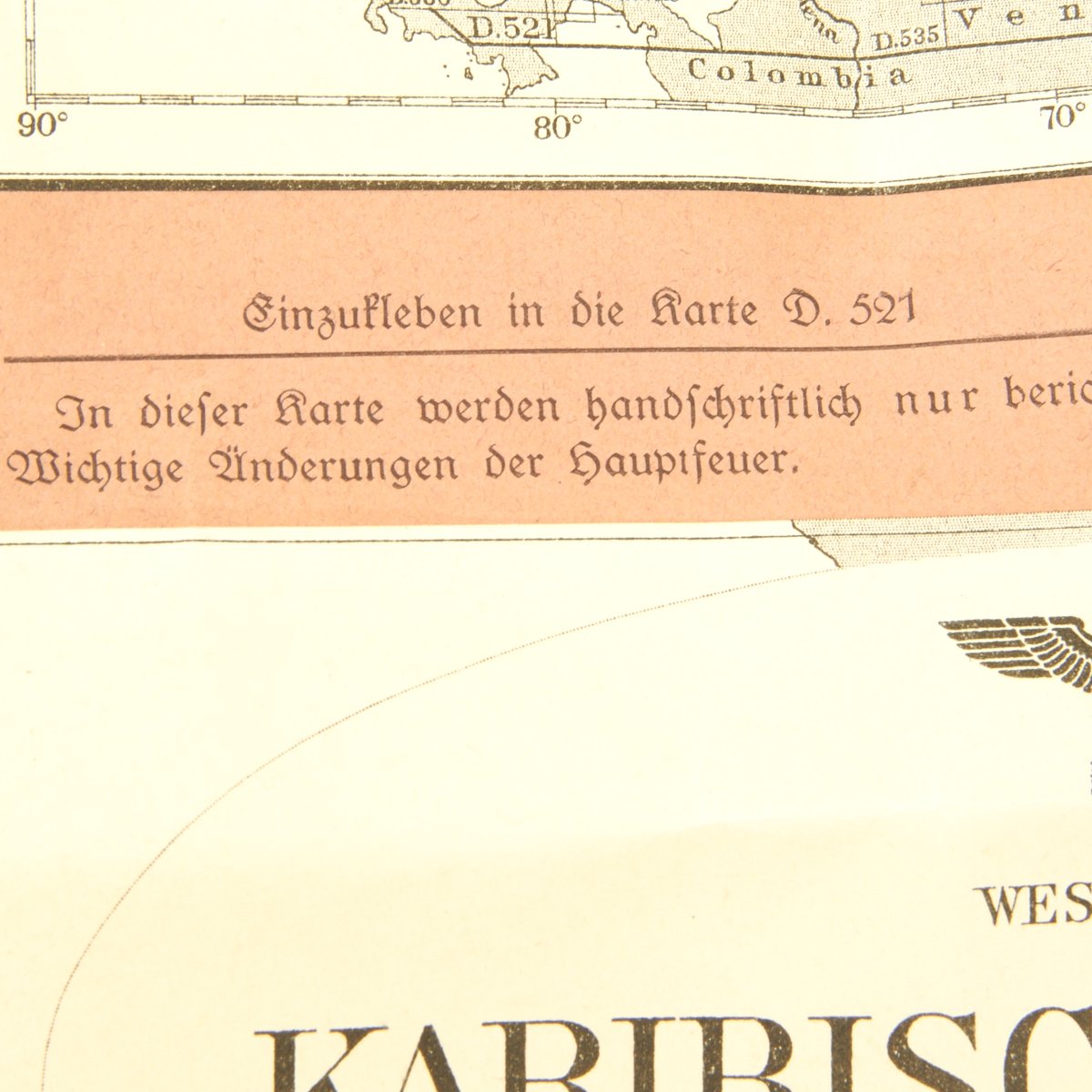 This is a wonderful map is marked Kriegsmarine across the top. This single side map is of the Karibisches Meer (Caribbean Sea) and includes the Panama Canal, Panama, Gulf of Mexico, Cuba, Jamaica, Honduras, Mexico and more.