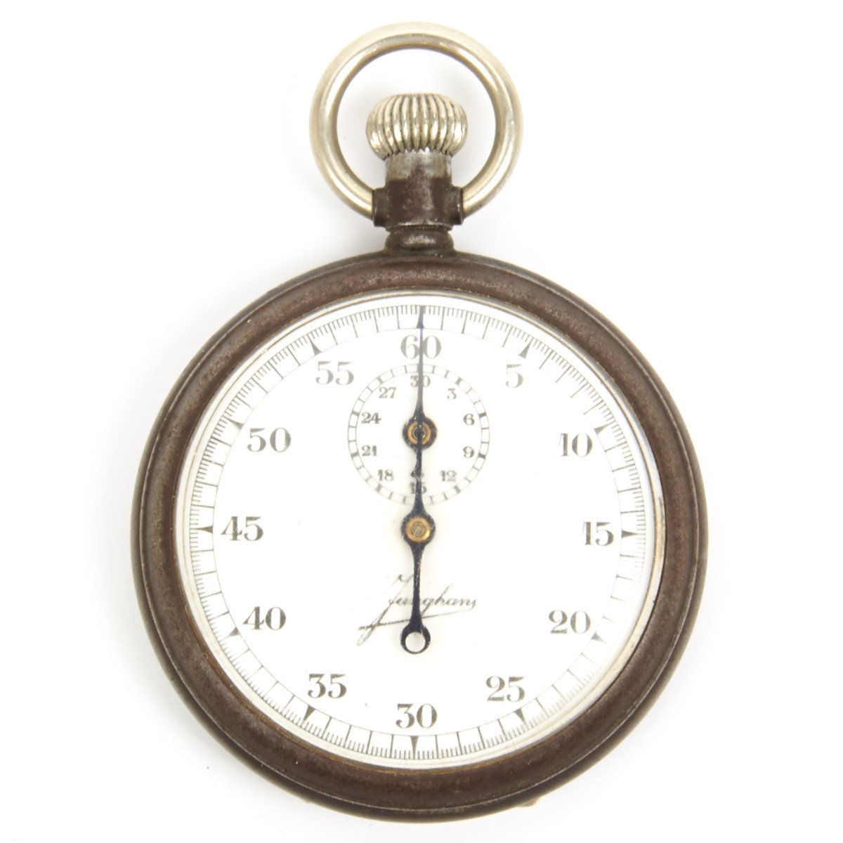 This is the classic design for Torpedo timing and used in U-Boats and E-Boats in the North Atlantic. Offered in great fully functional condition. The fluted knob on the top controls everything. You wind it up and when you push it in once the single seconds had starts moving immediately. On the second push, the second hand freezes at the time elapsed position. On the third push the timer resets itself to zero ready for reuse.
