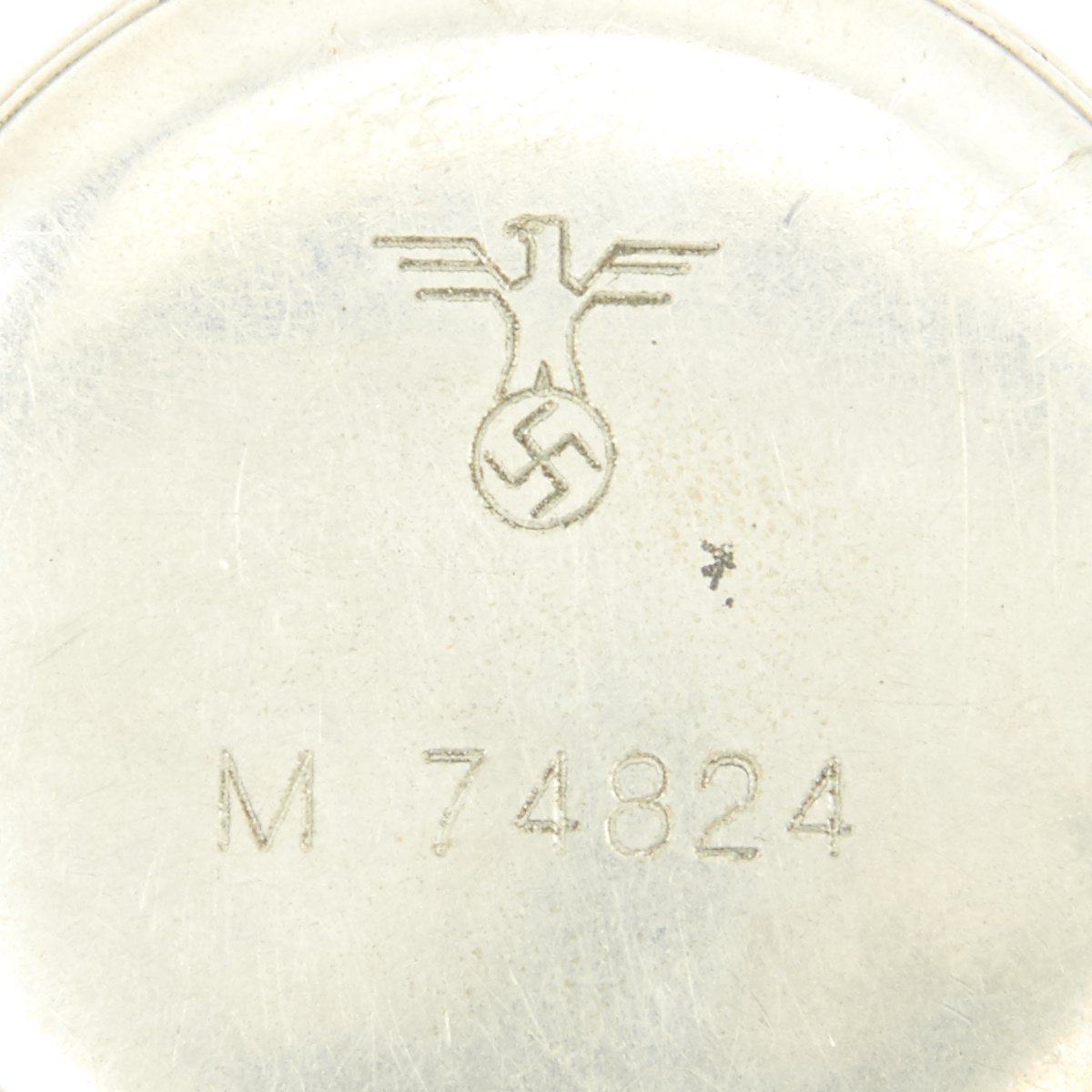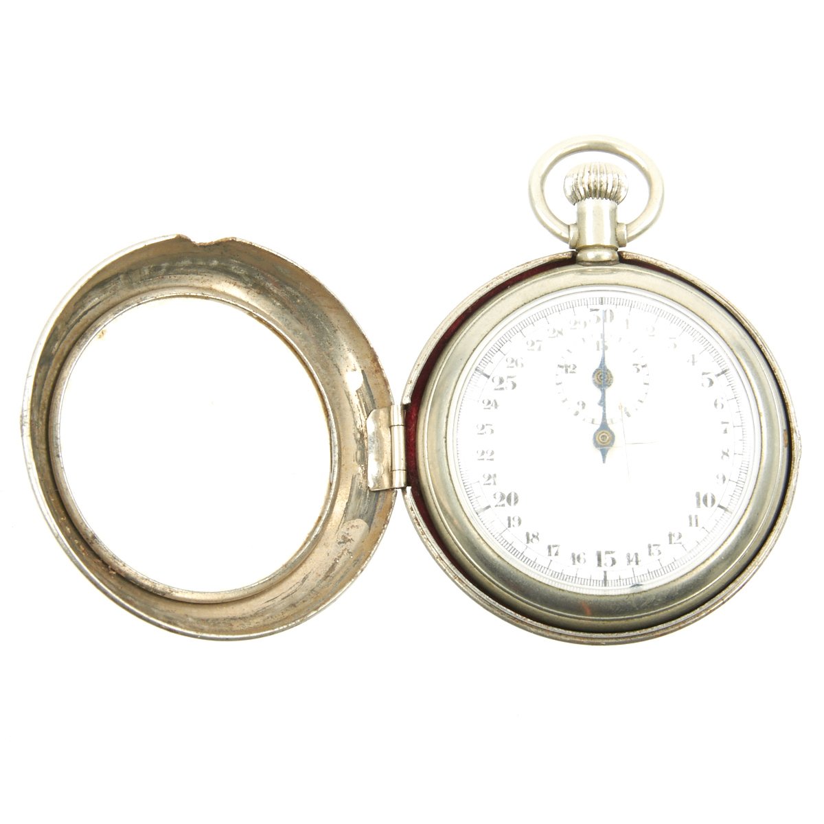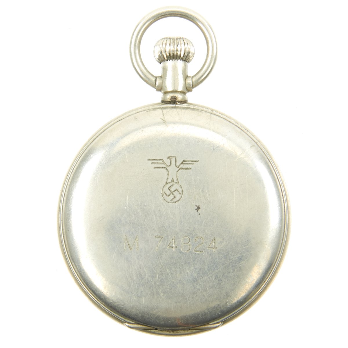 Original Item: Only One Available. This fine stop watch is WWII was contract produced for the German Navy, and is marked with spread eagle and swas stamping and an initial M for Marine under the plated finish. It also has a back that opens to be used as a stand for the watch. We have had several of these watches previously, however this is the first one to have an original felt-lined protective case.