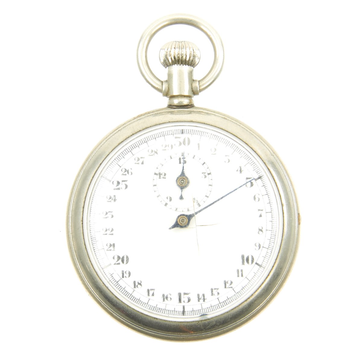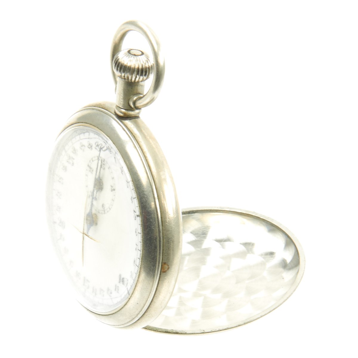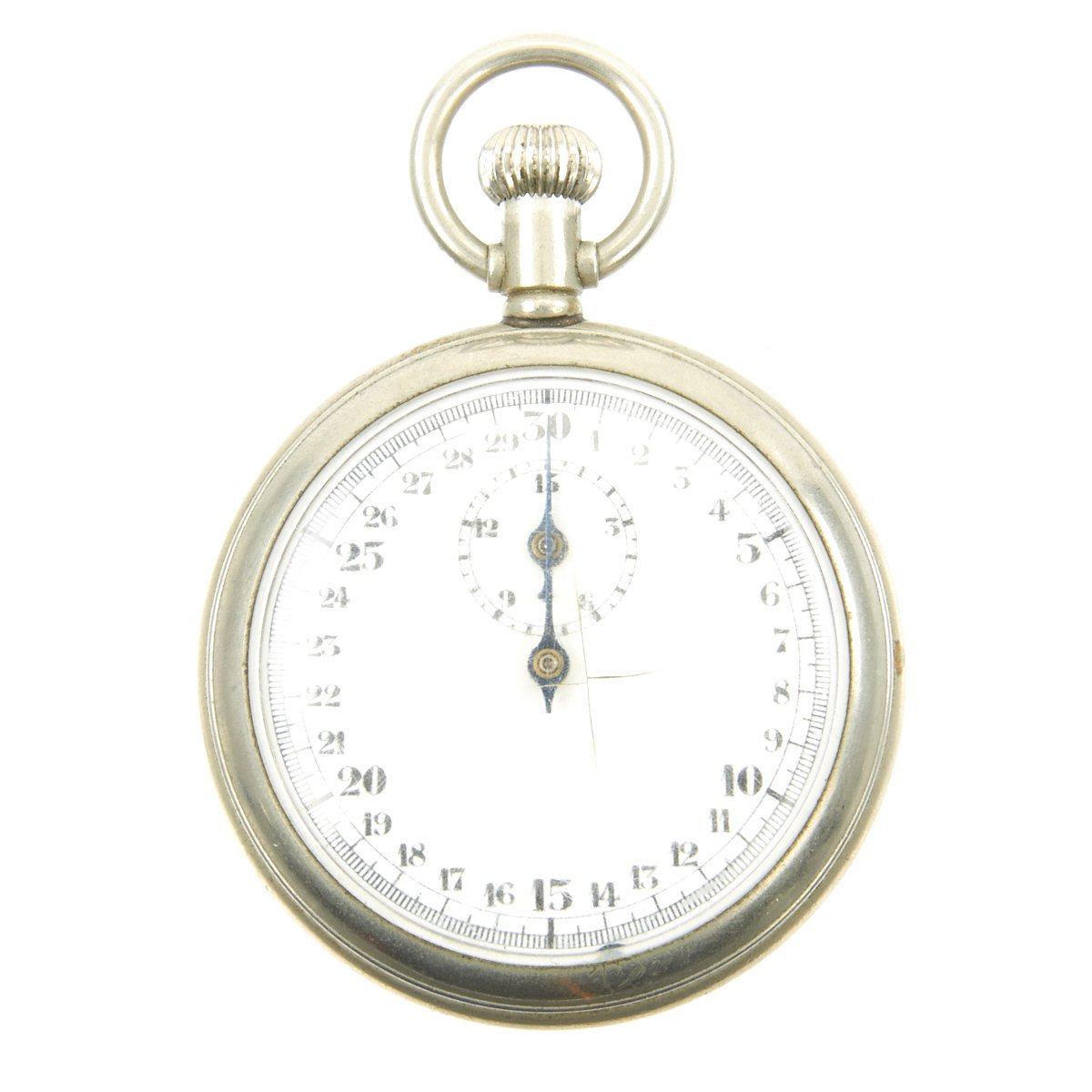 Original Item: Only One Available. This fine stop watch is WWII was contract produced for the German Navy, and is marked with spread eagle and swas stamping and an initial M for Marine under the plated finish. It also has a back that opens to be used as a stand for the watch. We have had several of these watches previously, however this is the first one to have an original felt-lined protective case.