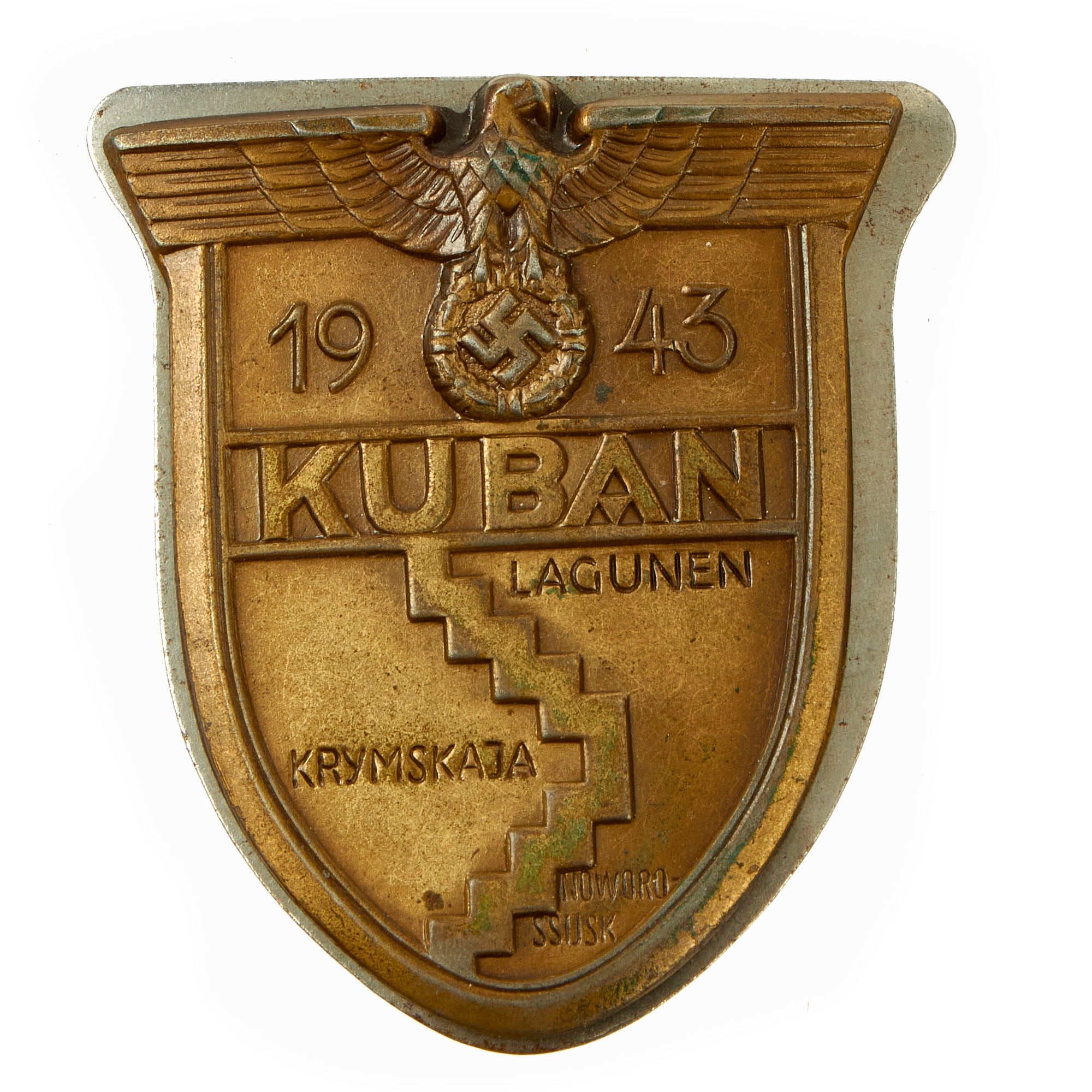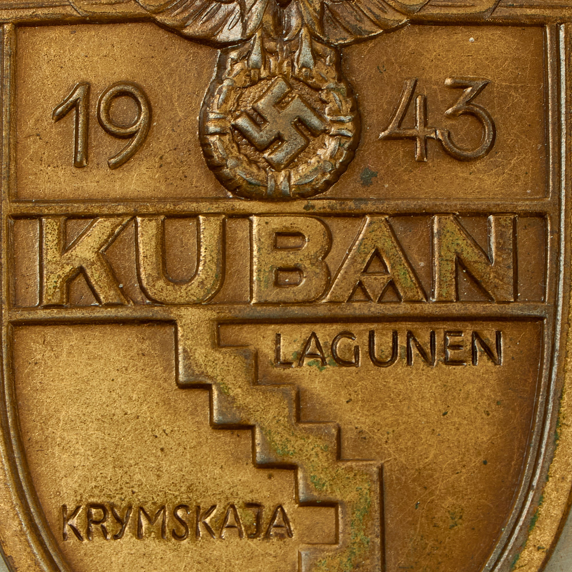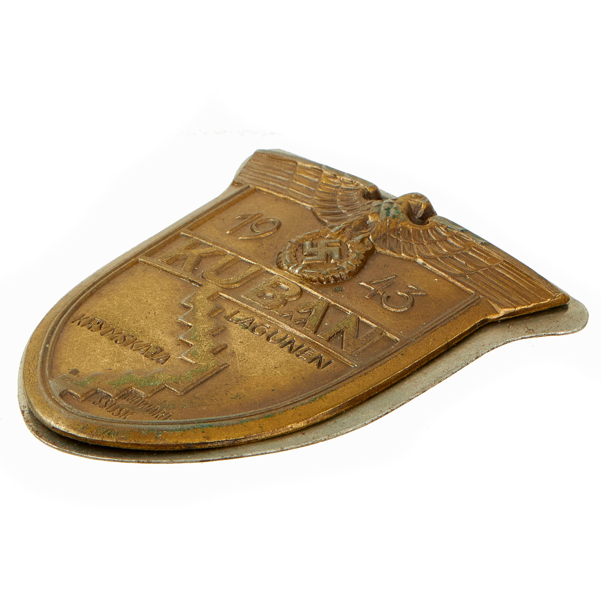 The shield is designed in a similar fashion to the Crimea Shield and was struck in sheet metal or zinc and treated with a bronzed wash. It features a German eagle with outstretched wings clutching a laurel wreath with a swas. On each side the wreath are the numbers 19 and 43. Directly below the eagle is written KUBAN in block capital letters. Below this name is a stylized map of the Kuban region, with a line representing the defensive line that the men fought to preserve with the location of the bridgeheads - KRYMSKAJA, LAGUNEN, and NOWOROSSIJSK.