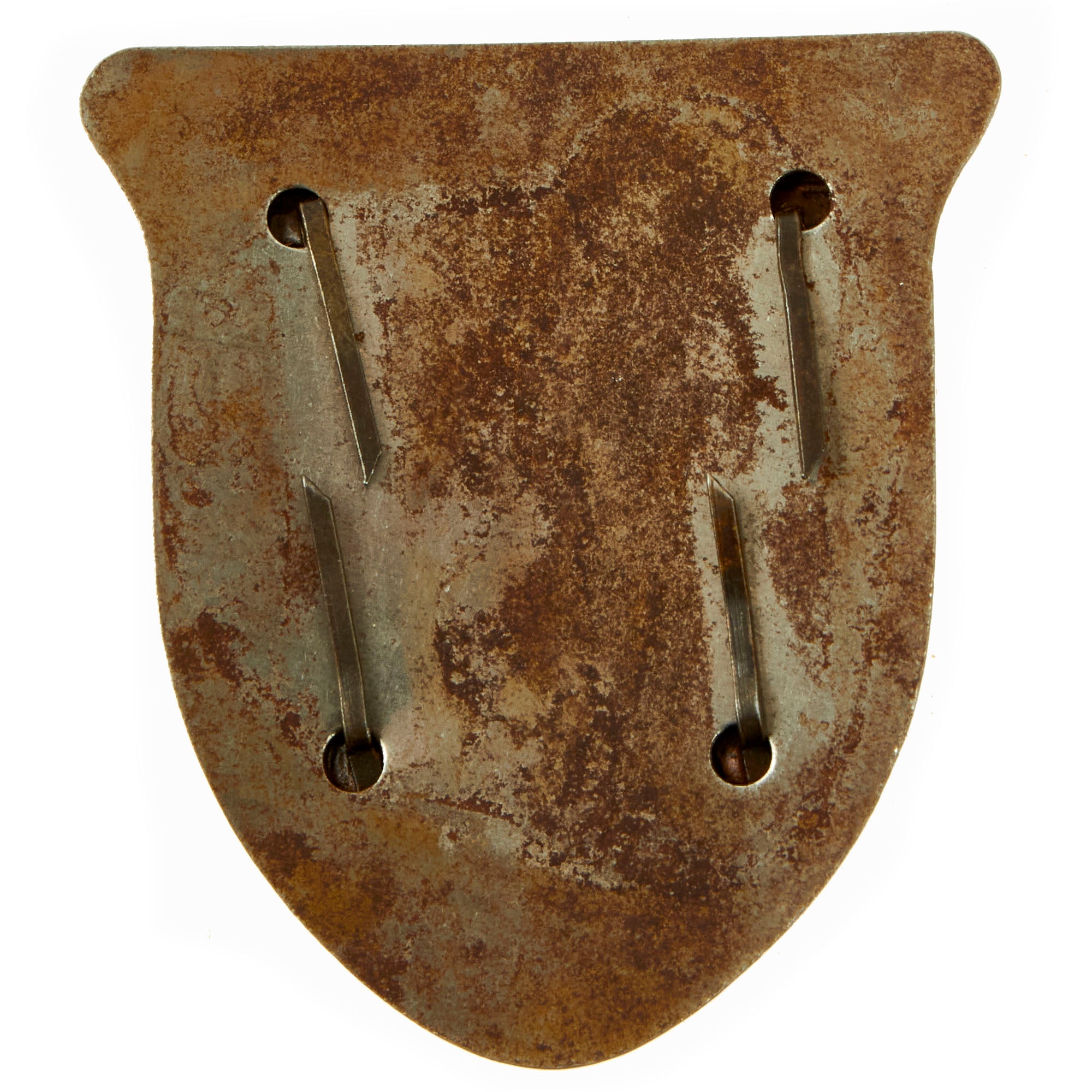 Original Item: Only One Available. This is a very nice example of German WWII Kuban Bridgehead Shield, with a plated steel shield attached to a metal backing plate. This example was removed from a uniform, and no longer has the fabric backing patch and paper covering. The front has a great aged brass patina, with no erosion of the plating over the steel. it has all four securing clips present, which hold the steel backing plate in place.