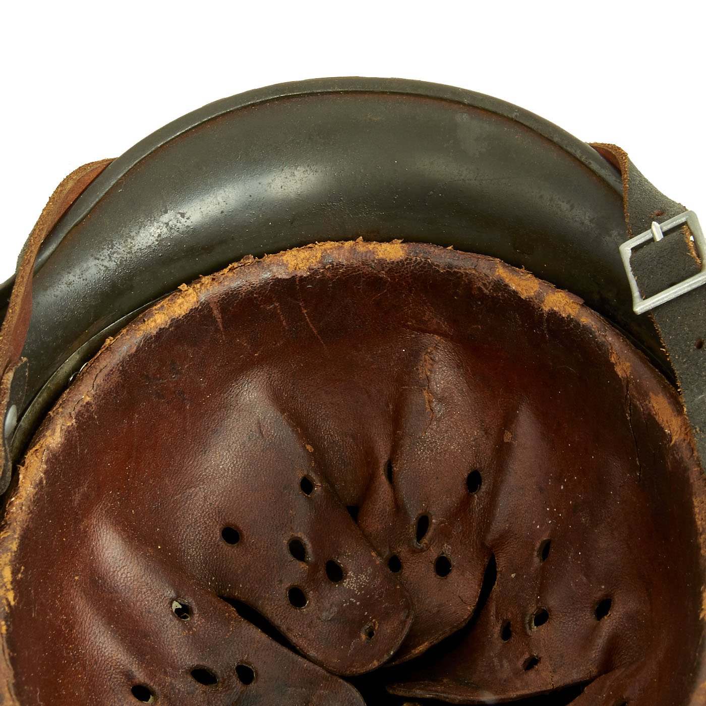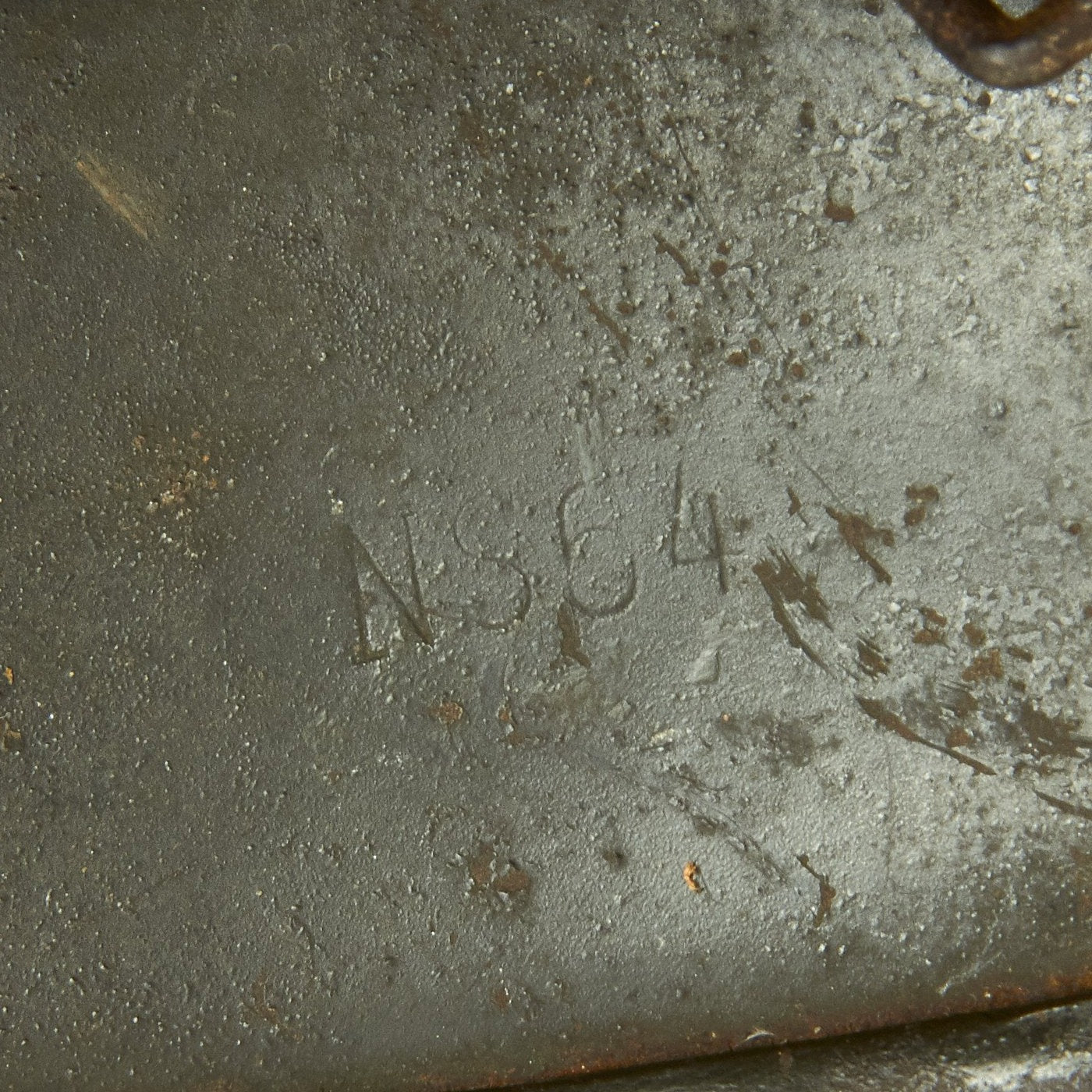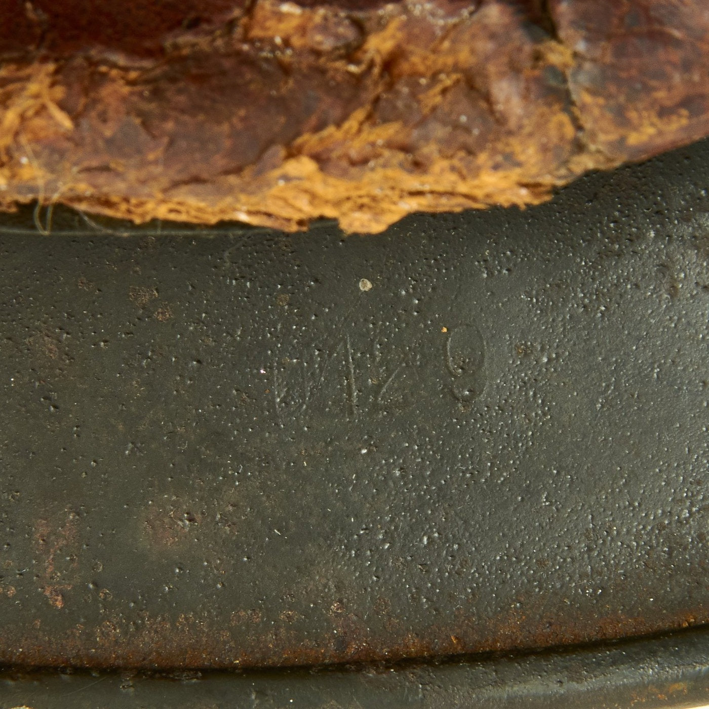 The front two liner retaining pins are intact and retain the camouflage paint to a varying degree. The rear pin is unfortunately missing. The interior of the helmet still has the original M31 leather liner with all eight of its fingers intact. The liner definitely has some tears and splitting, as shown. The original top tie is present but broken. The late war galvanized steel liner band is marked on the left side with 64 n.A. / 57, indicating a size 57cm liner for a 64cm shell. The right side displays the full manufacture information, as well as a date, though it is faintly stamped: