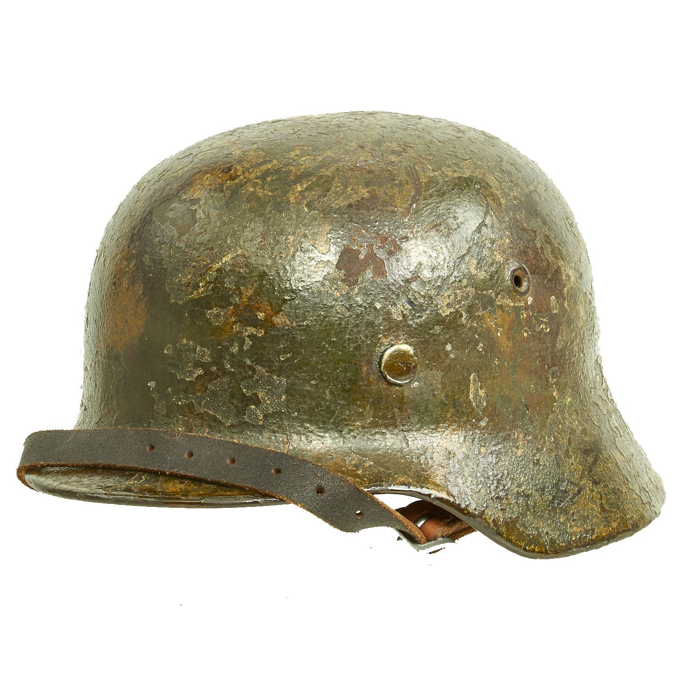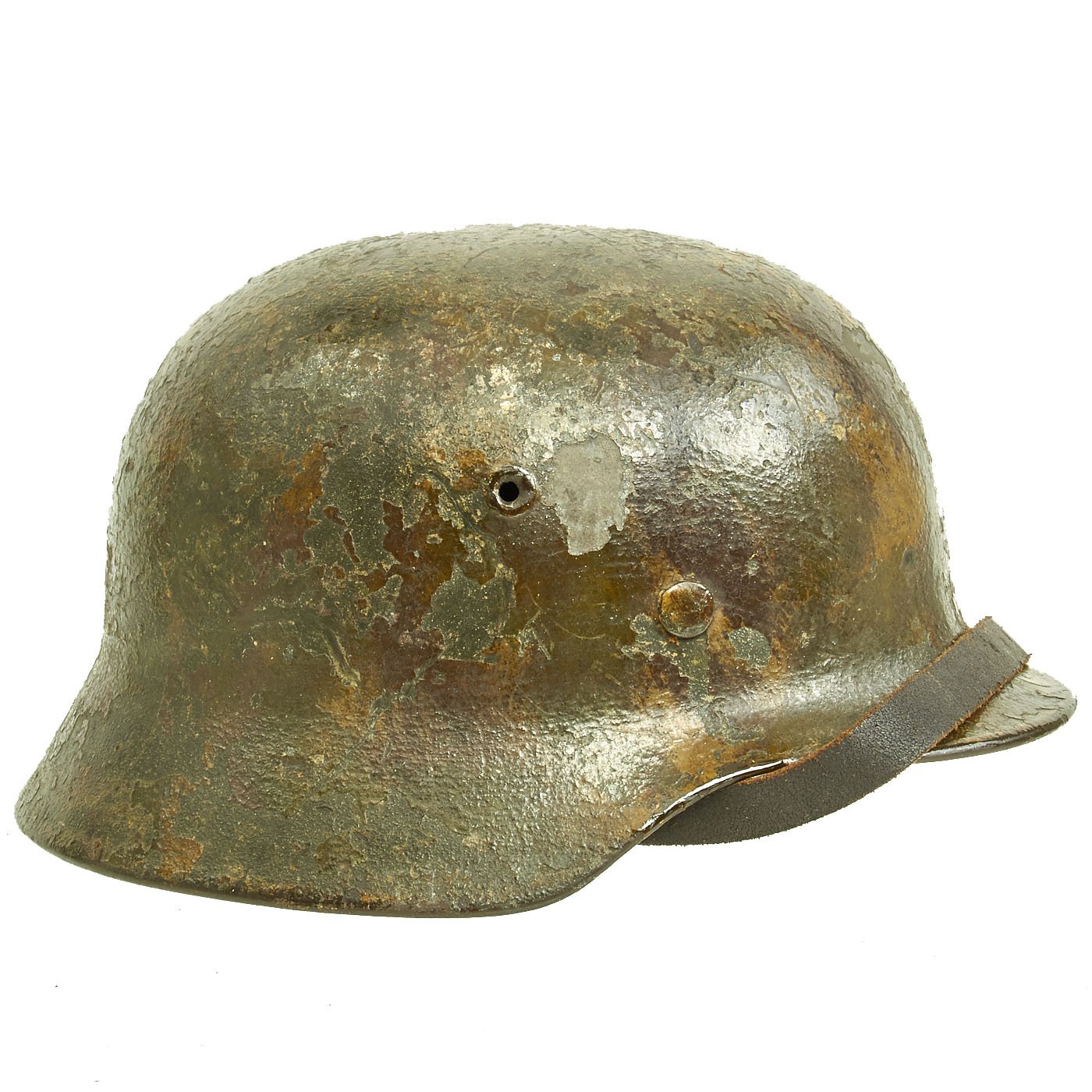 Original Item: One-of-a-kind. This is what we all look for and can never find! An incredible 100% authentic Heer Army Field Repaint Camouflage Model 1942 German Helmet! While iconic, the Feldgrau (field Gray) used by the German Army (Heer) during WWII was not always the best for concealment. Once the Allies started invading Europe, more effective camouflage was needed, as Germany was now on the defensive, and rapidly losing ground.