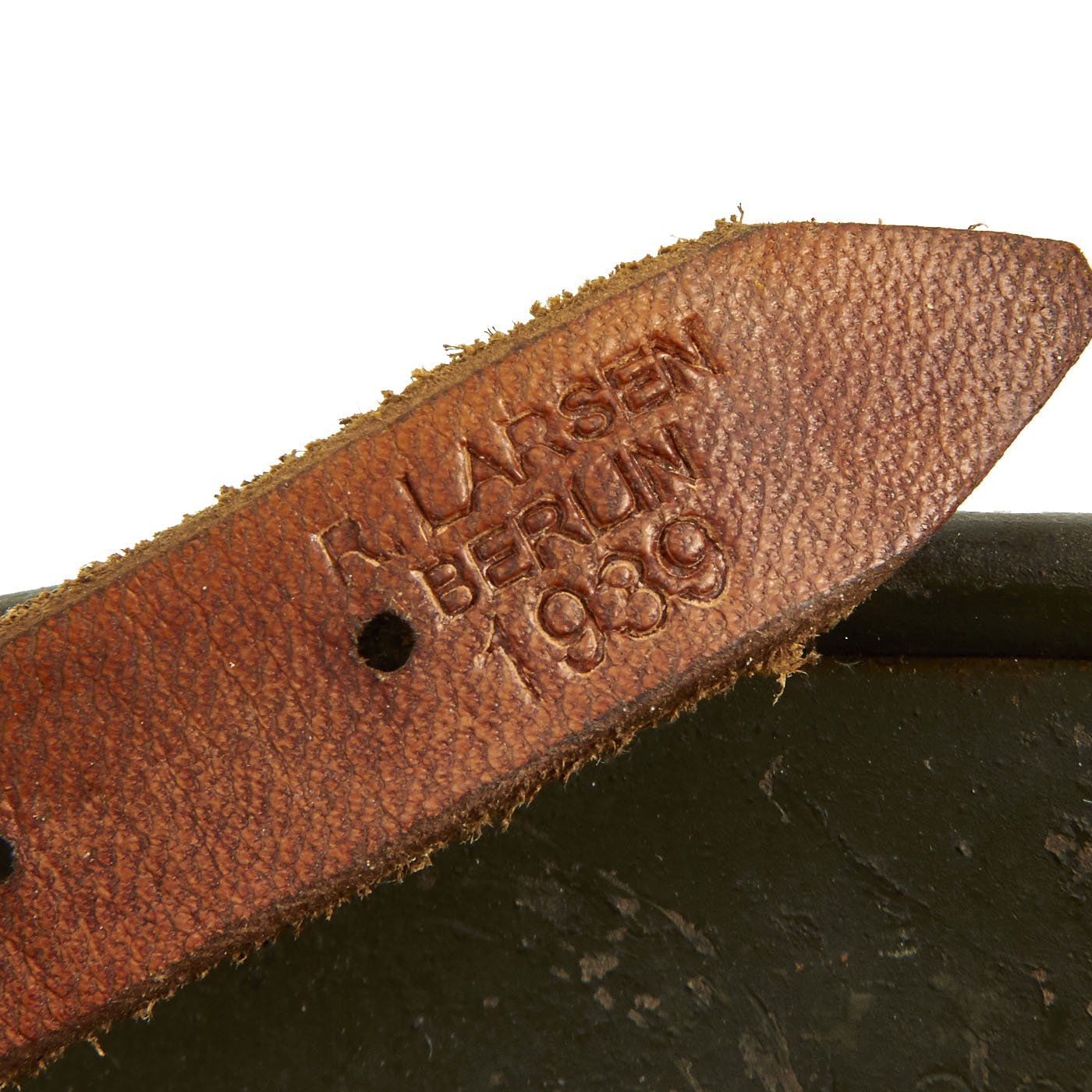 The chin strap is fully intact, and may be an arsenal replacement. It is marked on one end with R. LARSEN / BERLIN / 1939, and it is in good shape, with the expected wear from age and use. It has aluminum fittings, as opposed to galvanized or painted steel, but that is consistent with the 1939 date.