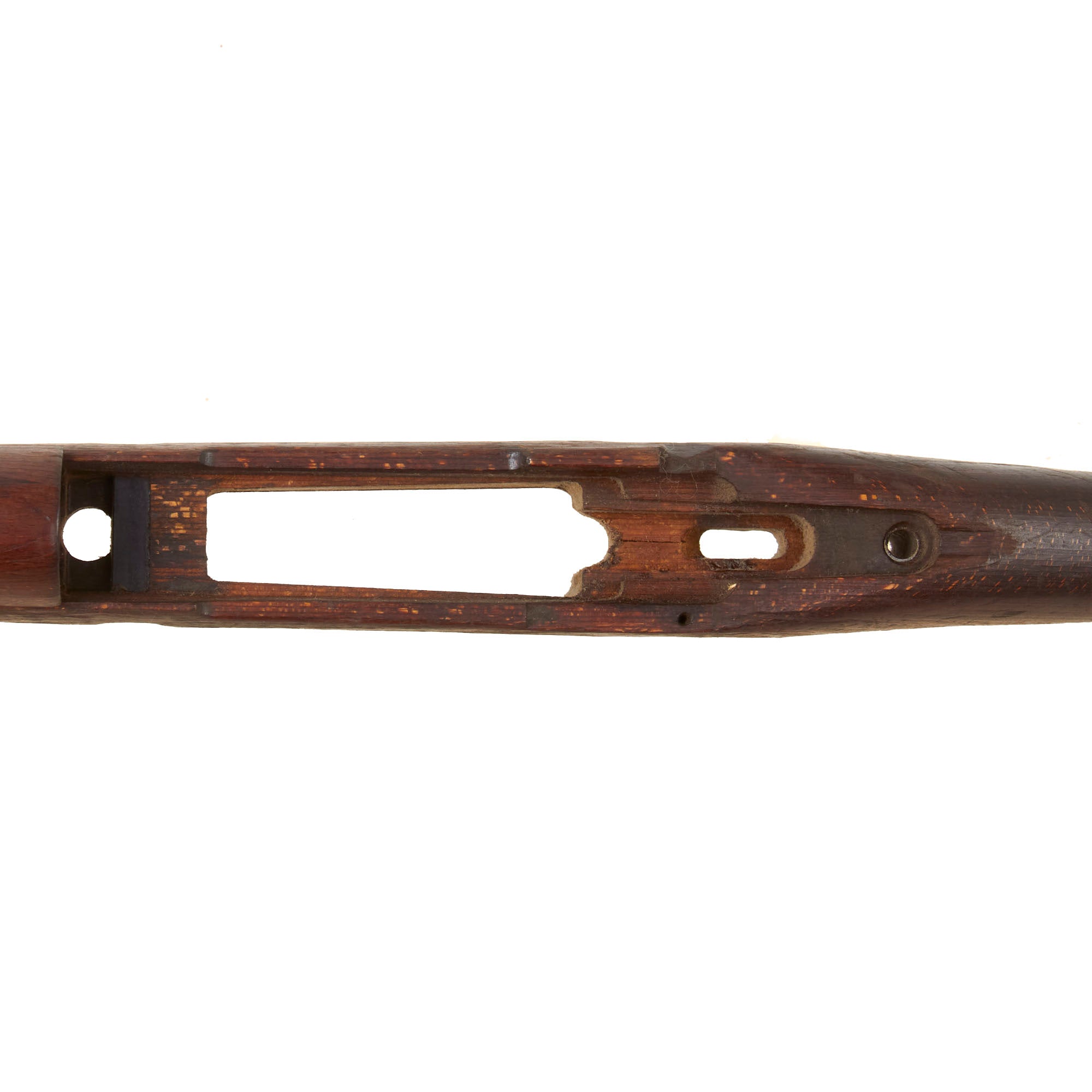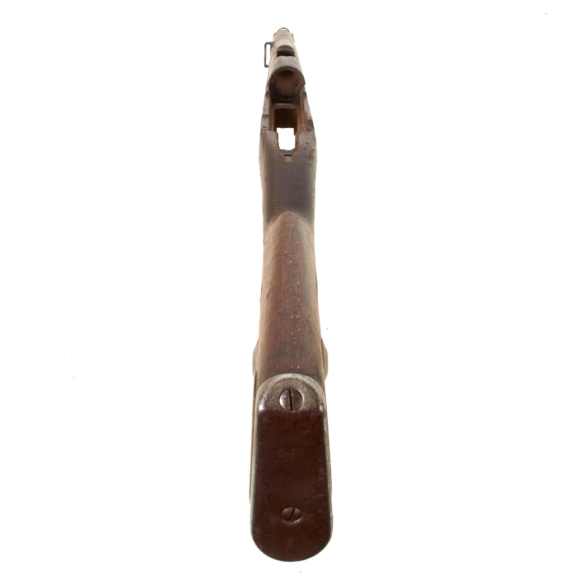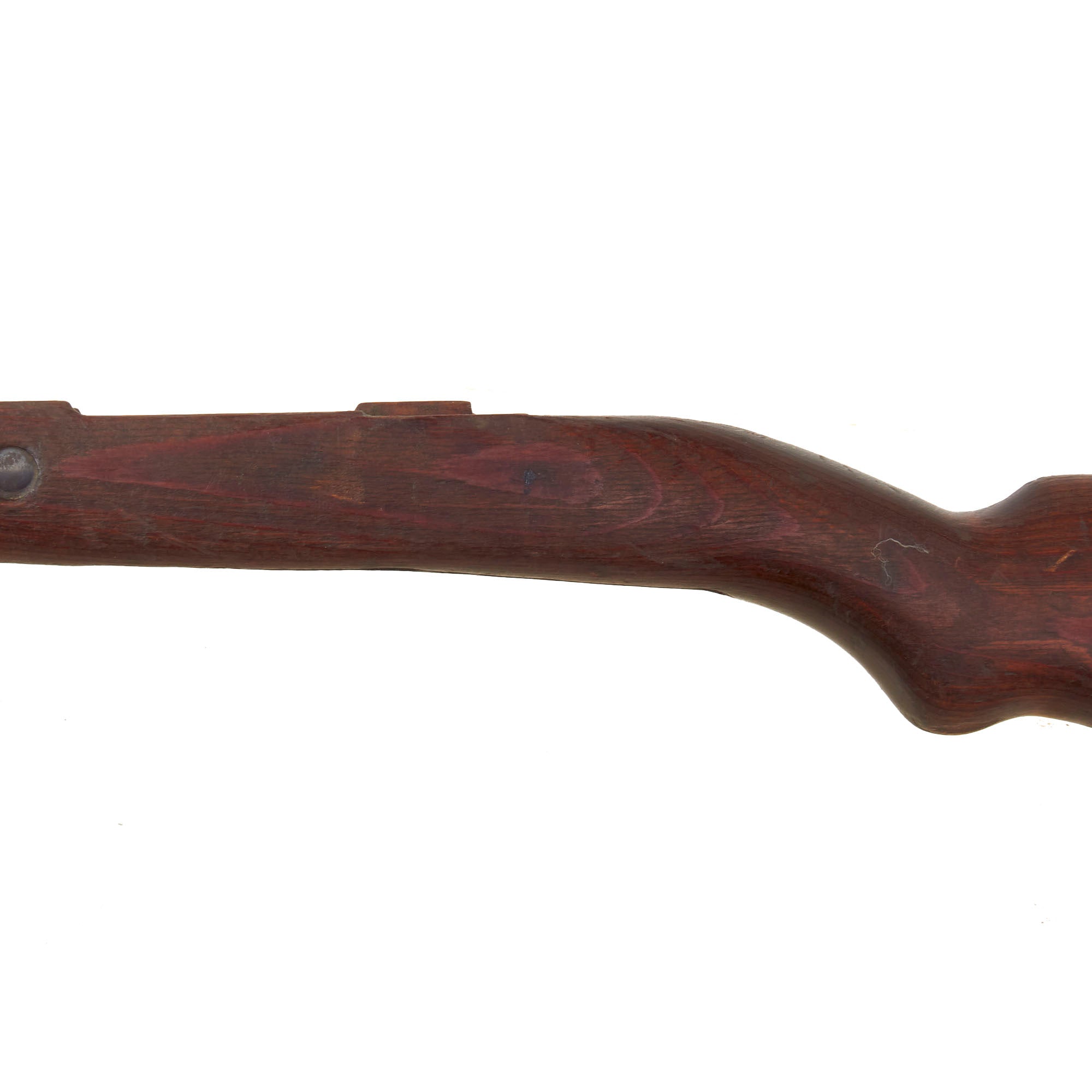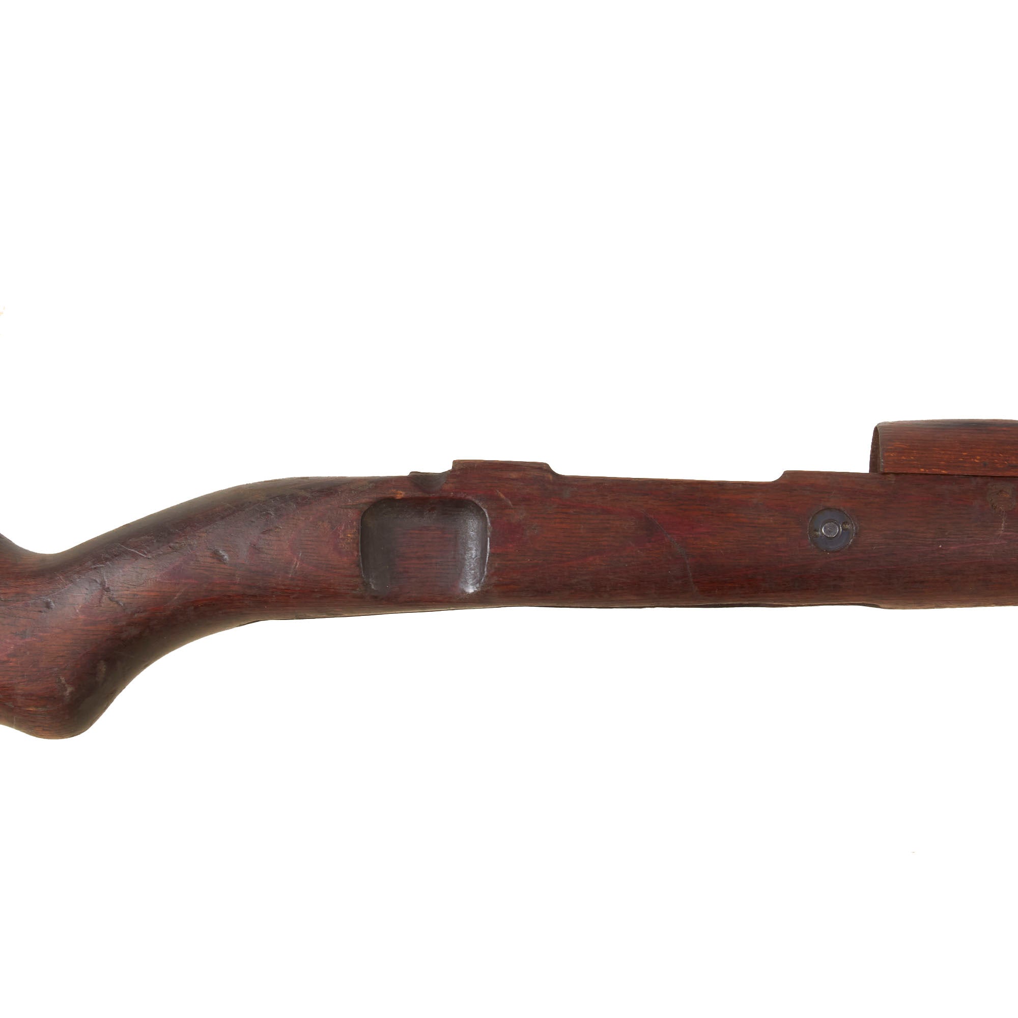 This is a very good example of a stock for the G33/40, the “Mountain Carbine” of the K98. The stock has the larger metal plate around the buttstock found on these carbines. It has the nose cap / bayonet fitting, receiver strengthening bolt, and the correct 30mm metal fitting through the butt stock that aided in bolt disassembly in the field during cleaning. There is scuffing and overall damage but nothing too serious.