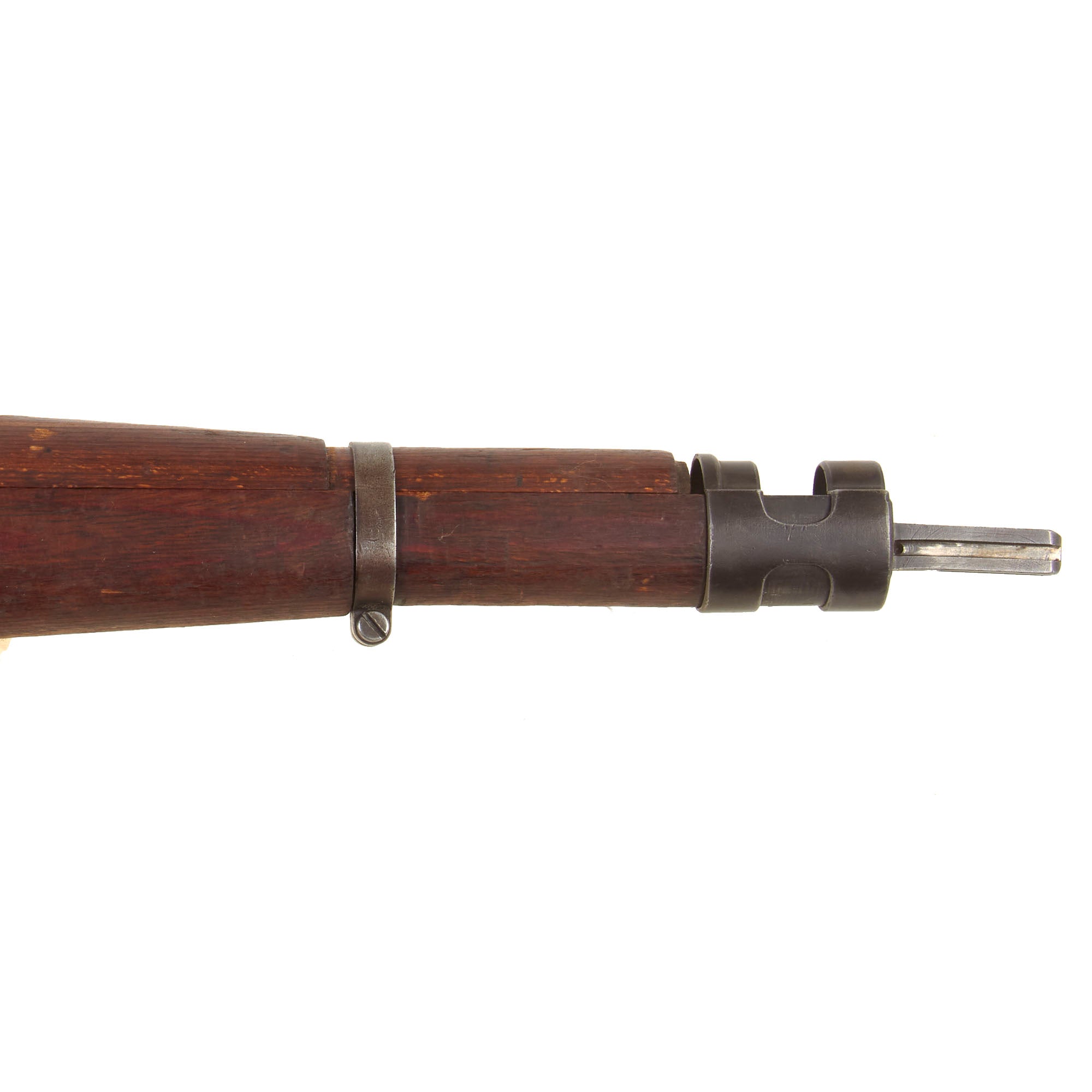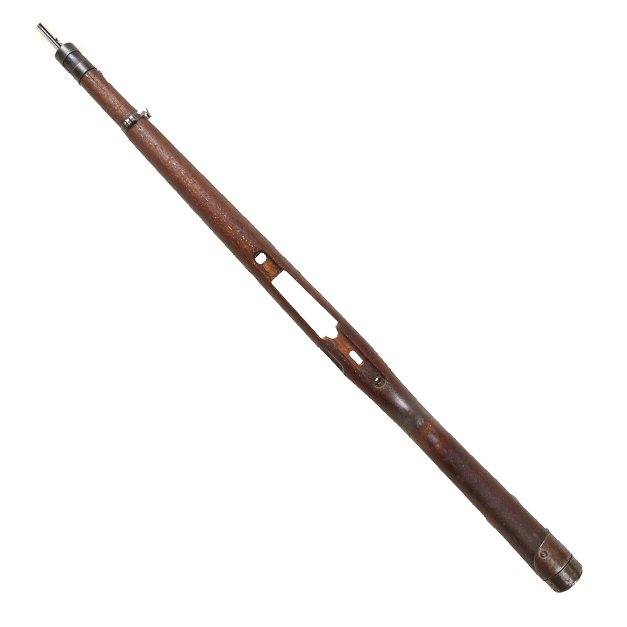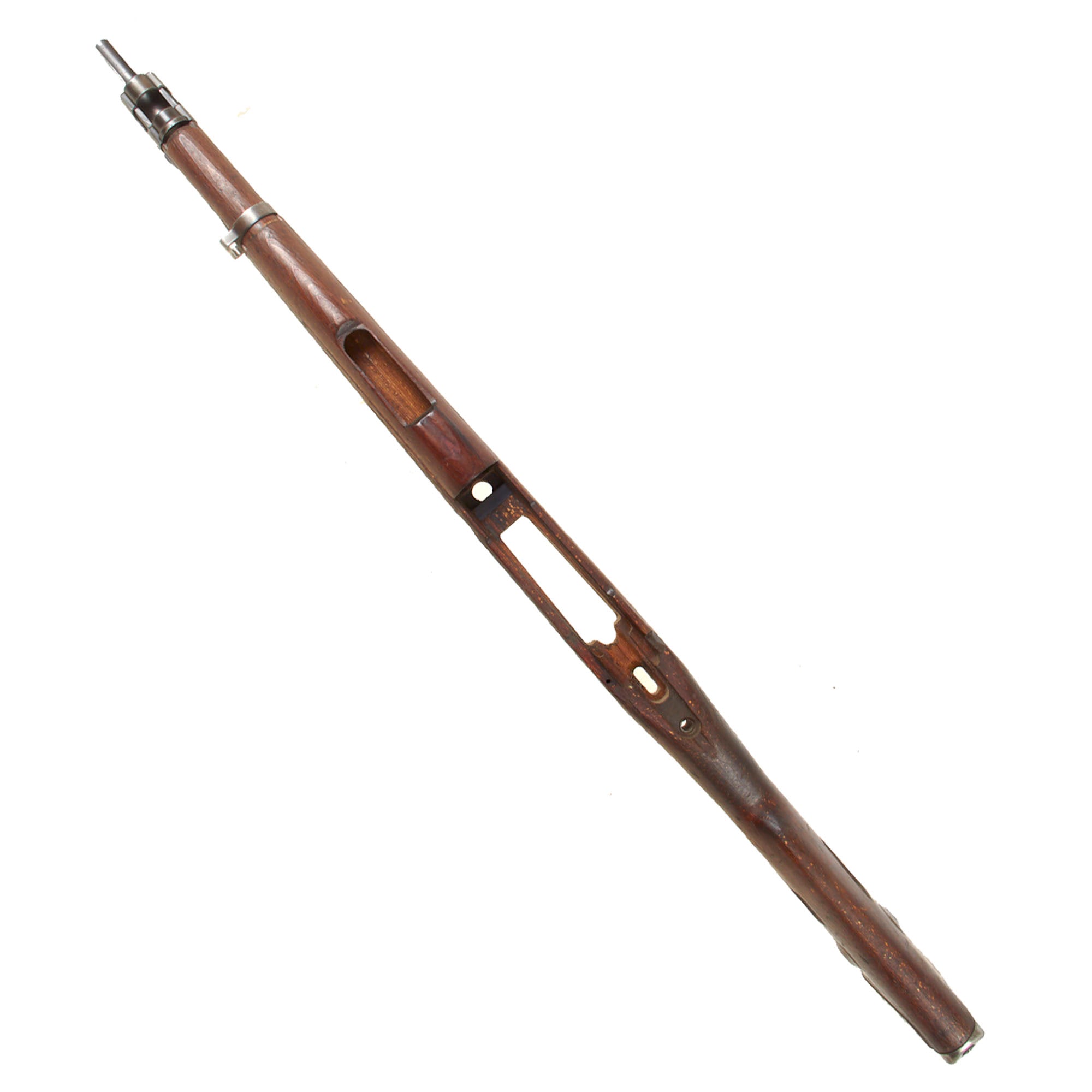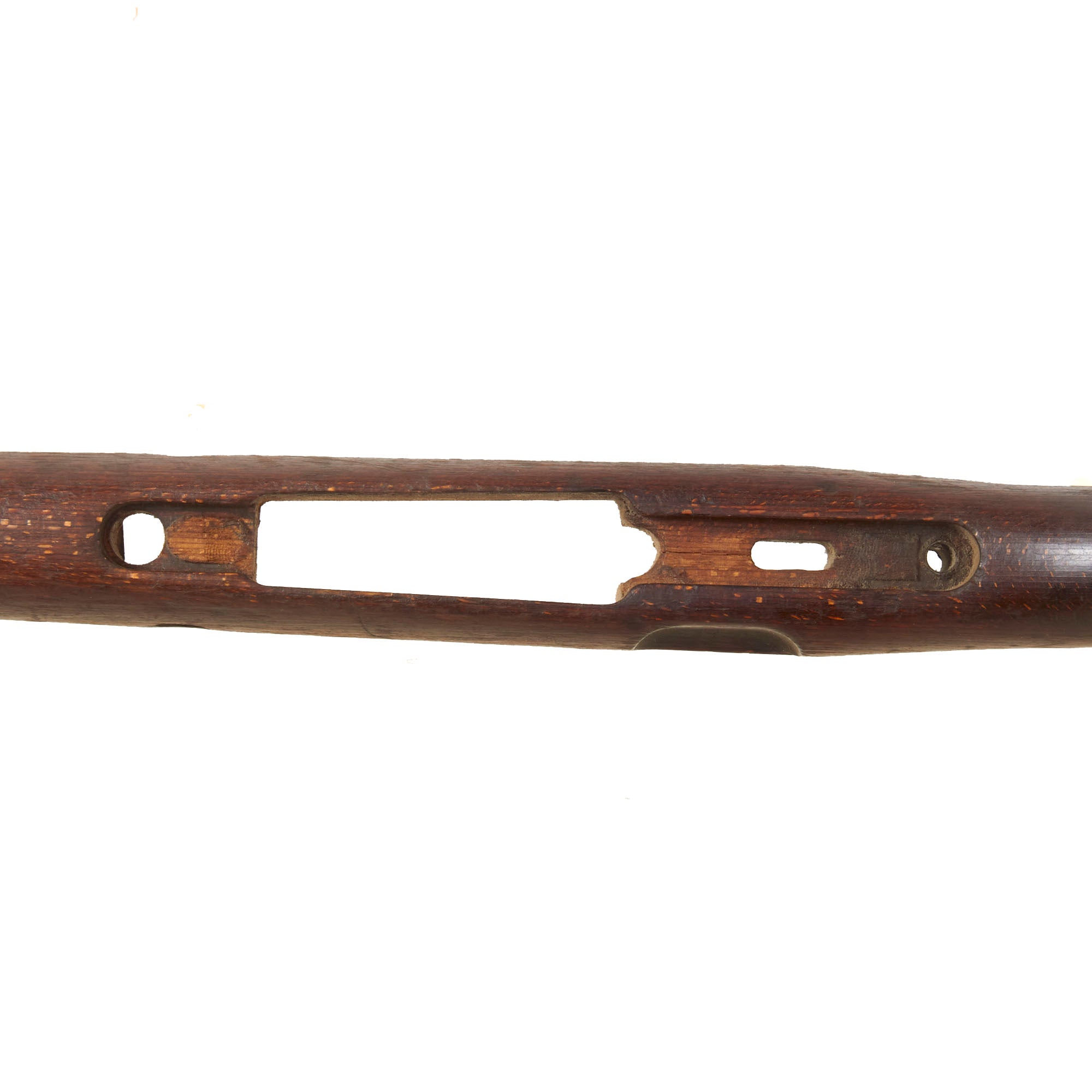 This is a very good example of a stock for the G33/40, the “Mountain Carbine” of the K98. The stock has the larger metal plate around the buttstock found on these carbines. It has the nose cap / bayonet fitting, receiver strengthening bolt, and the correct 30mm metal fitting through the butt stock that aided in bolt disassembly in the field during cleaning. There is scuffing and overall damage but nothing too serious.