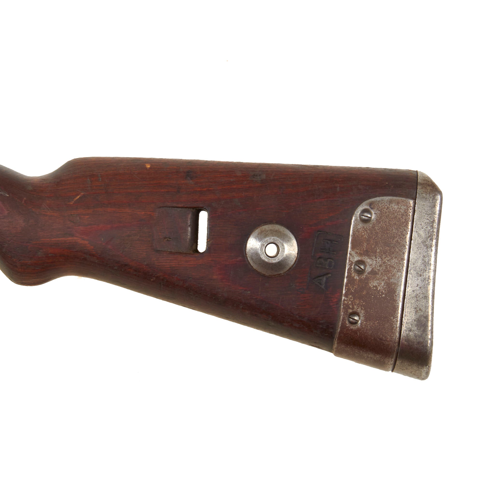 Also included is the upper handguard which has the cutout for the rear sight. The handguard fits well onto the stock and really completes the set. The end of the stock next to the buttplate is a large stamped ABH, which we are unsure about the meaning of.