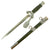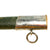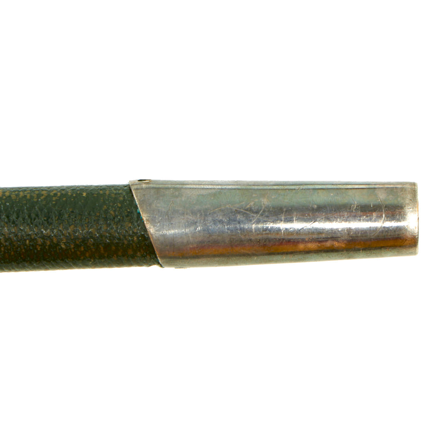 The scabbard shell is straight throughout, covered in matching dark green Moroccan leather. Other than some normal wear it remains in very good condition, with some small scattered scuffs that have removed the finish. The plated grass mounts retain almost all of the original silver plating, now lightly tarnished. These mounts are retained by headless side screws and are styled with decorative lines on the obverse only.