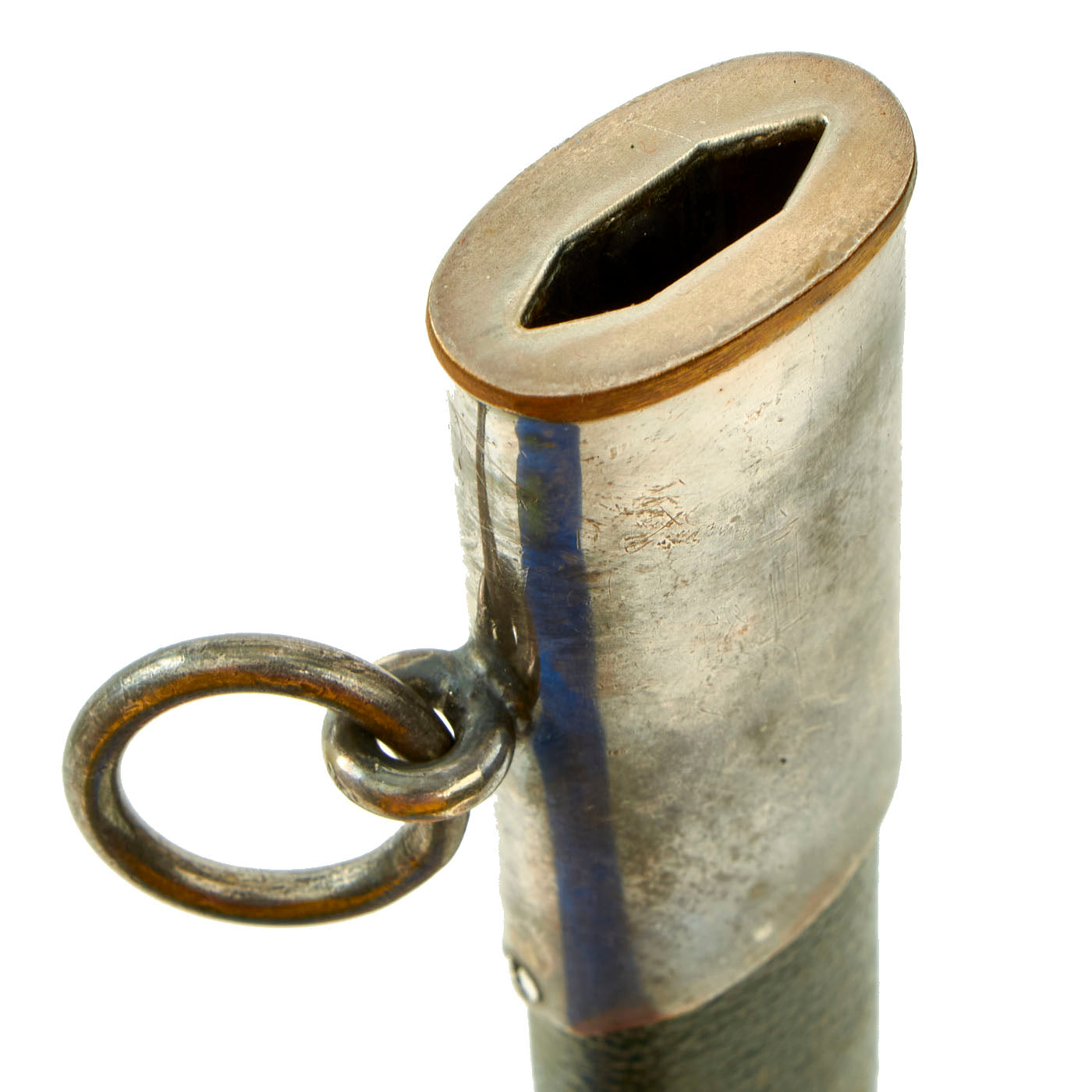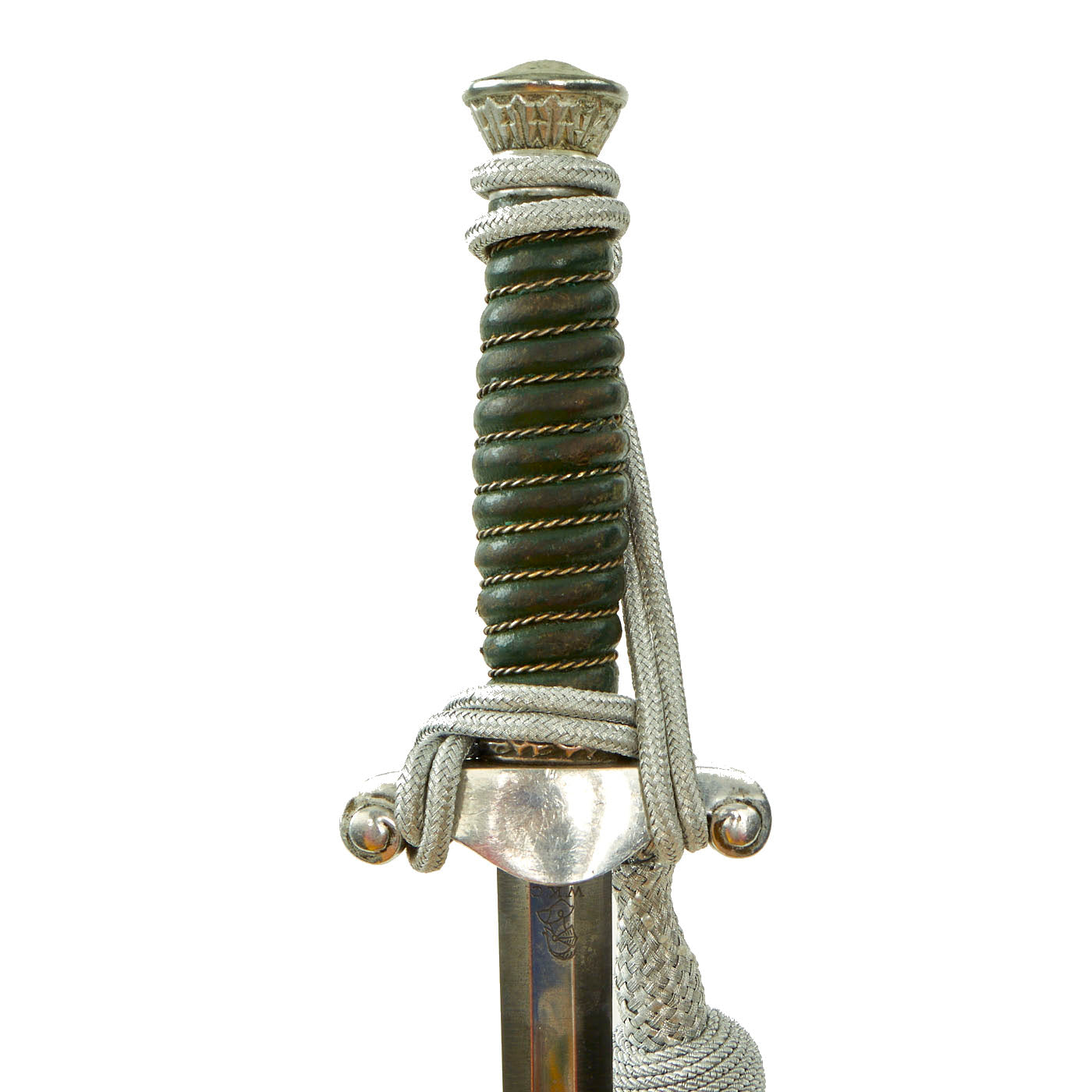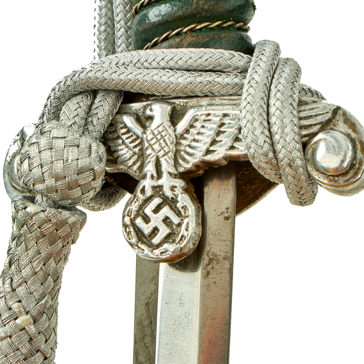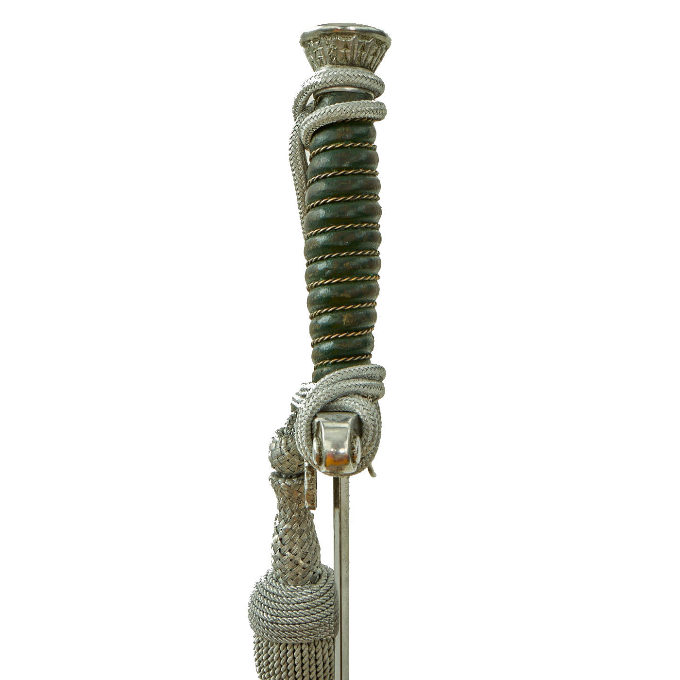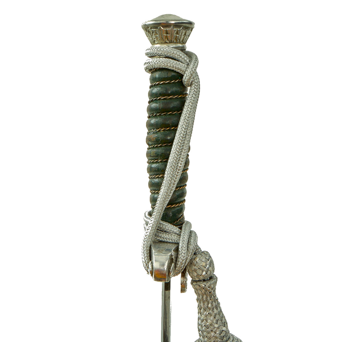 The matching crossguard features an open-winged eagle with wing tips that rise upward. The detailing throughout the guard is exceptional, much better than that seen on the later bare aluminum examples. The reverse of the guard has been polished enough to almost totally remove the plating. The silvered ferrule actually still has a nice patina on it, as it has been protected from cleaning by the excellent condition portepee wrapped around the handle. The grip is wood covered in fine dark forest green Moroccan leather. This leather remains in very good condition, tightly wrapped with twisted silver coated brass wire, and still showing much of the original finish.