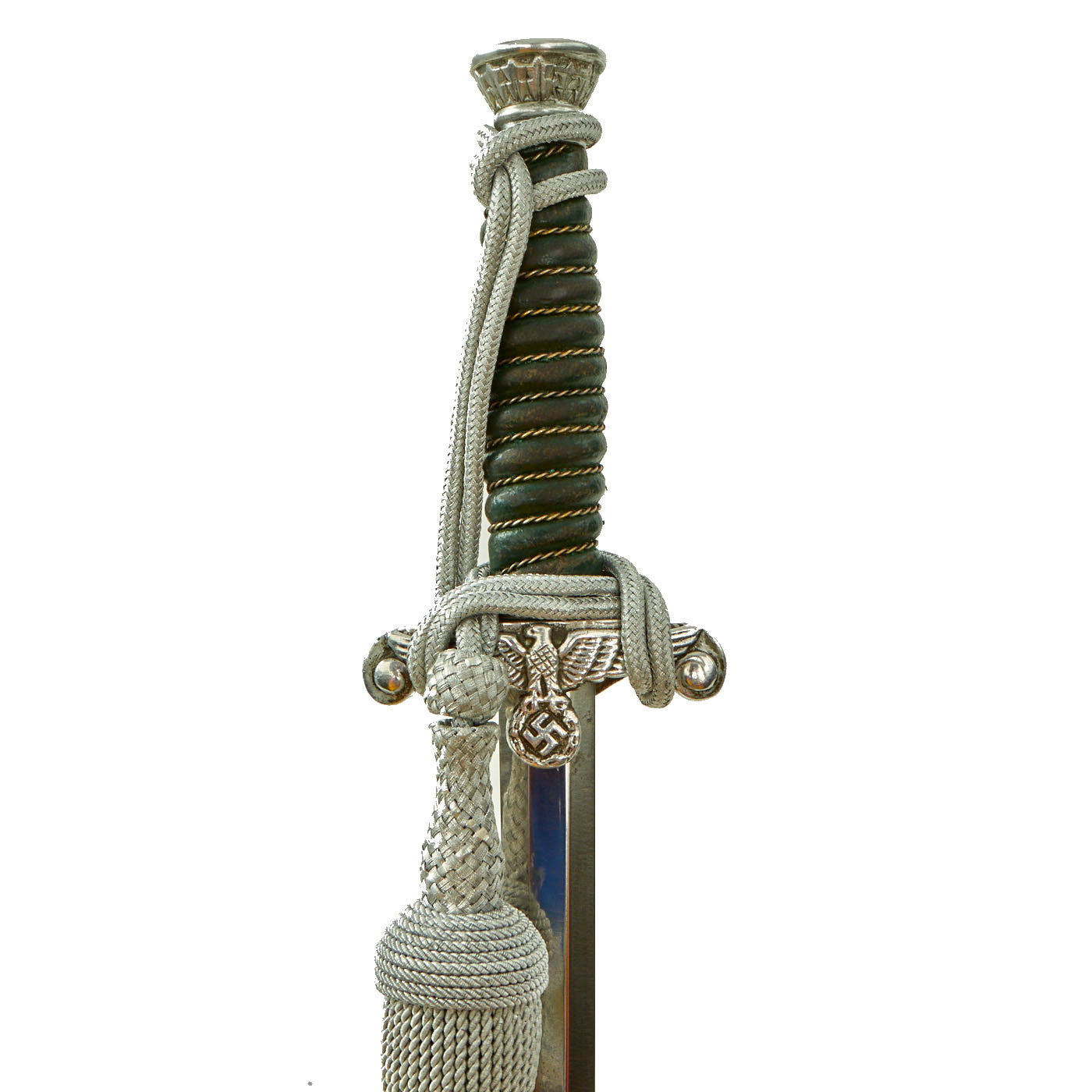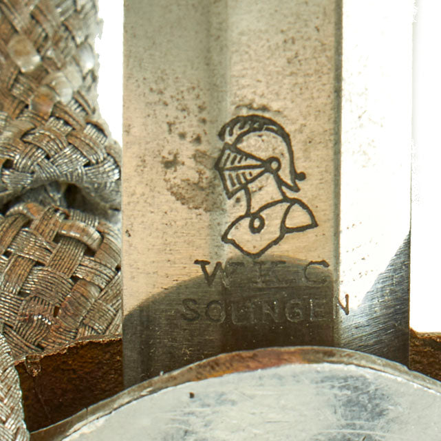 The reverse ricasso is etched with the trademark "Knights-Head" (Ritter-helm) logo of legendary maker Weyersberg Kirschbaum & Cie of Solingen, over the firms initials of WKC / SOLINGEN. This company is a famous manufacturer of military swords and cutlery in Solingen, Germany - a city famous since the middle ages for its metal-working and craftsmanship in sword making. Per J. Anthony Carter's fine work GERMAN SWORD AND KNIFE MAKERS, the traditional manufacturing of swords at WKC dates back to the year 1774 when the Weyersberg first registered the ''Kings head'' as their trademark. Later in 1883 the company merged with the Kirschbaums and the company Weyersberg Kirschbaum & Cie was formed, which continued into the Weimar Period. It then rebranded as W.K.C. Waffenfabrik GmbH, and produced many edged weapons during the NSDAP Period. The company is still in operation today.