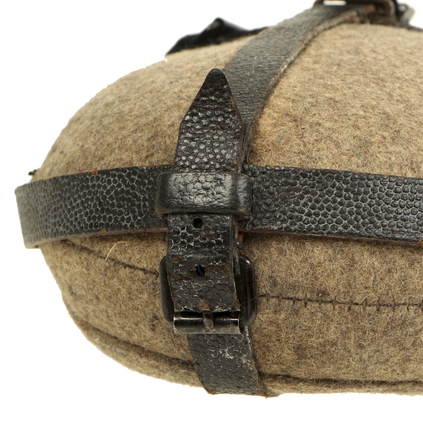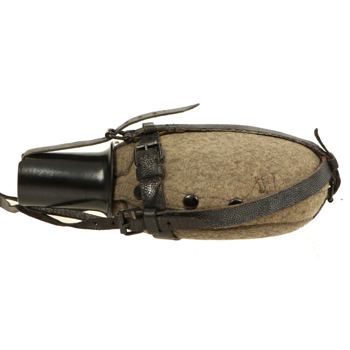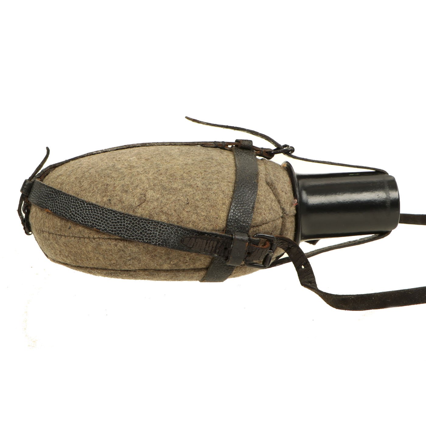 This is a very good example, featuring a bakelite cap and cup, as well as a black pebble grain leather harness. The neck of the aluminum bottle is marked W.A.L. 43, as is the inside of the wool cover. This indicates manufacture by Westfalische Aluminium Industrie, Junger & Co. of Lüdenscheid, Germany. The bakelite cap and cup have mold marks, which we are unfortunately not able to identify. There look to be some markings on the harness, but we cannot read them.