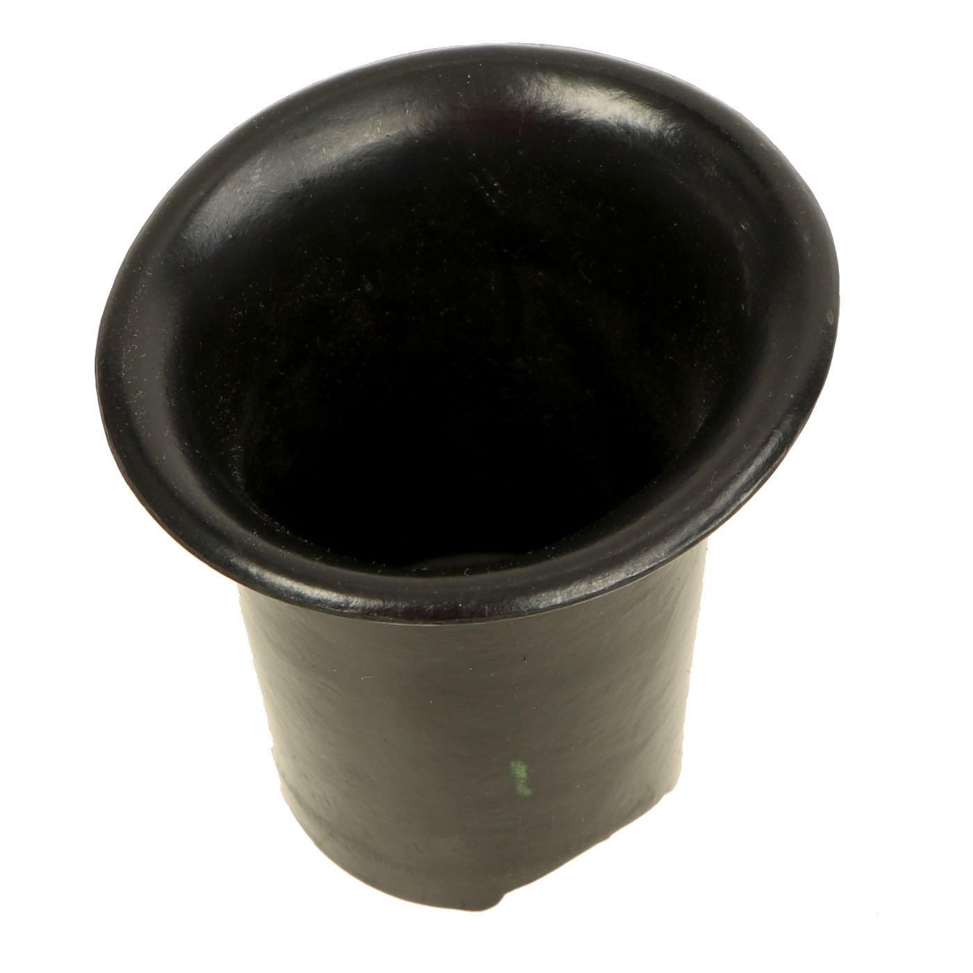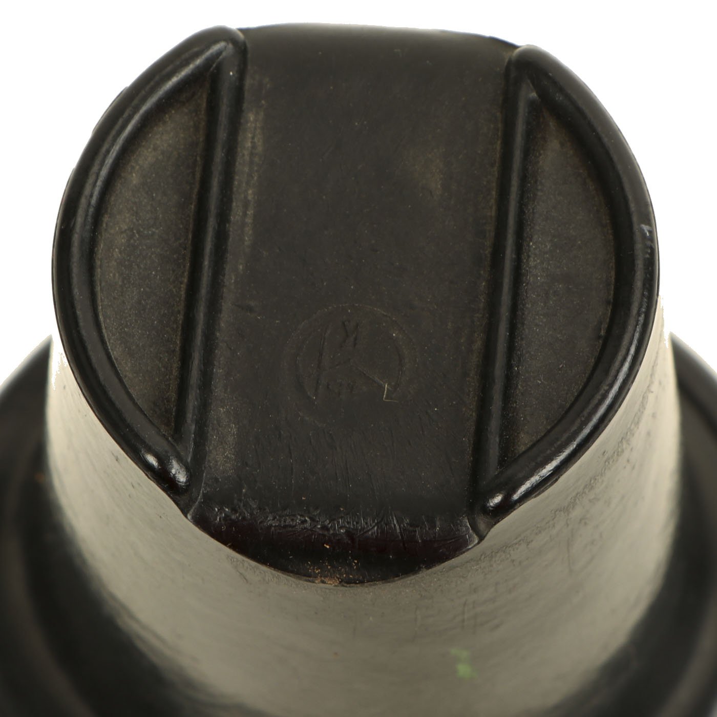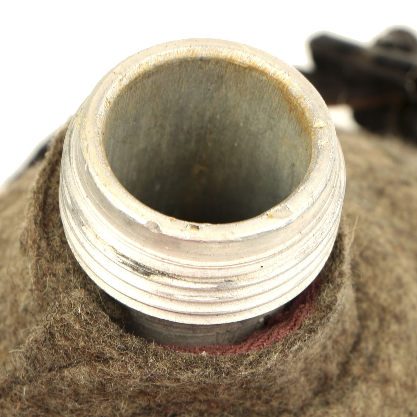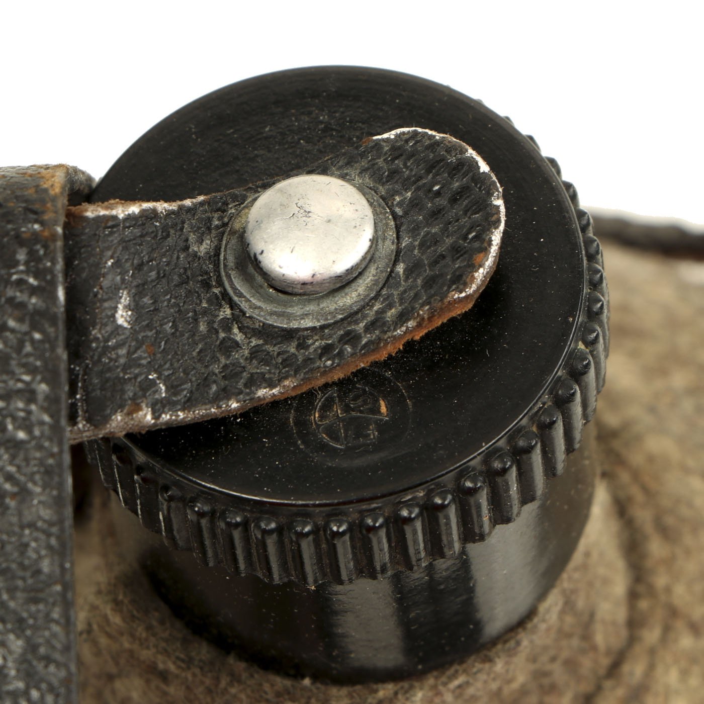 This is a very good example, featuring a bakelite cap and cup, as well as a black pebble grain leather harness. The neck of the aluminum bottle is marked W.A.L. 43, as is the inside of the wool cover. This indicates manufacture by Westfalische Aluminium Industrie, Junger & Co. of Lüdenscheid, Germany. The bakelite cap and cup have mold marks, which we are unfortunately not able to identify. There look to be some markings on the harness, but we cannot read them.