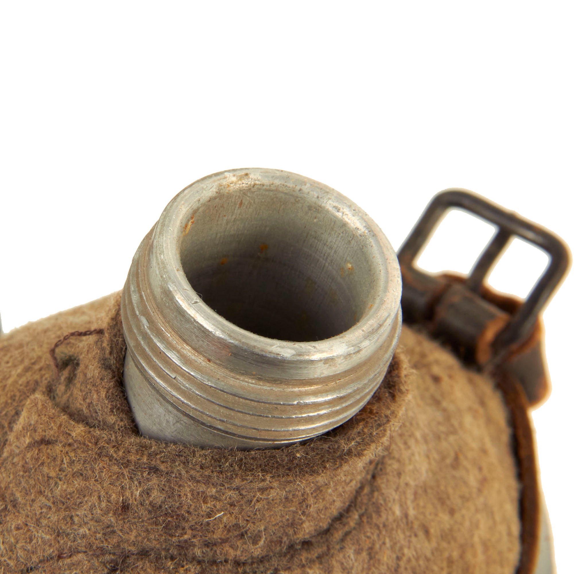 This is a very good example, featuring a bakelite cap and cup, as well as a black pebble grain leather harness. The neck of the aluminum bottle is marked W.A.L. 43, as is the inside of the wool cover. This indicates manufacture by Westfalische Aluminium Industrie, Junger & Co. of Lüdenscheid, Germany. The bakelite cap and cup have mold marks, which we are unfortunately not able to identify. The harness also has the same marking.