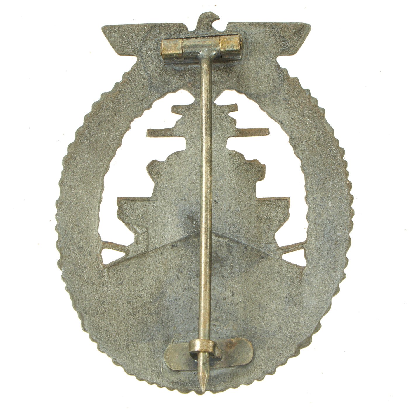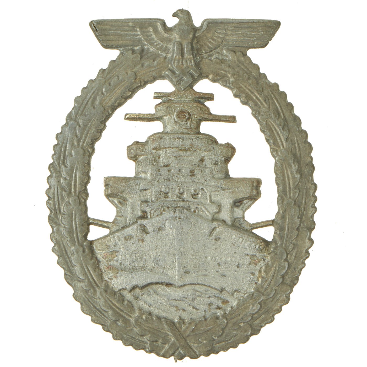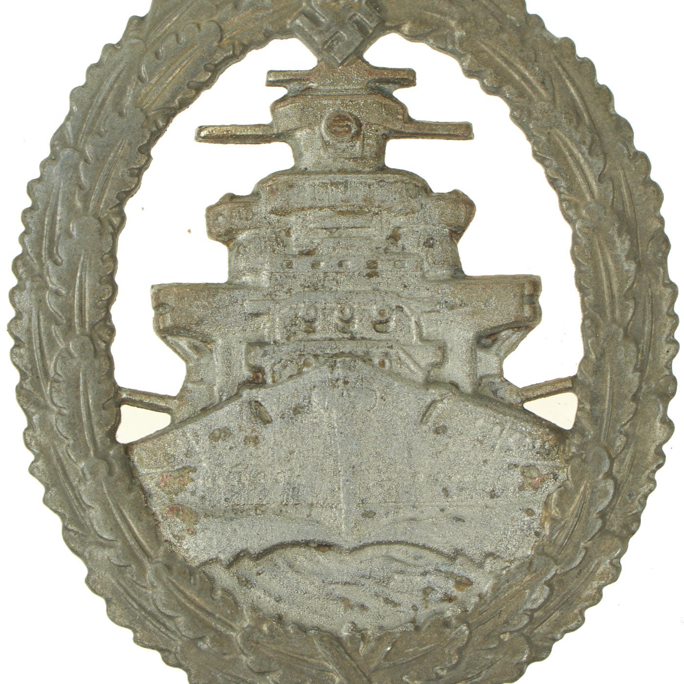 Original Items: Only One Available. This is a very good condition Late War Flottenkriegsabzeichen der Kriegsmarine - High Seas Fleet Badge, made of Zinc alloy. Earlier in the war, these had been made of Brass with a blacked battleship in the middle, but as the war went on, they moved to zinc.