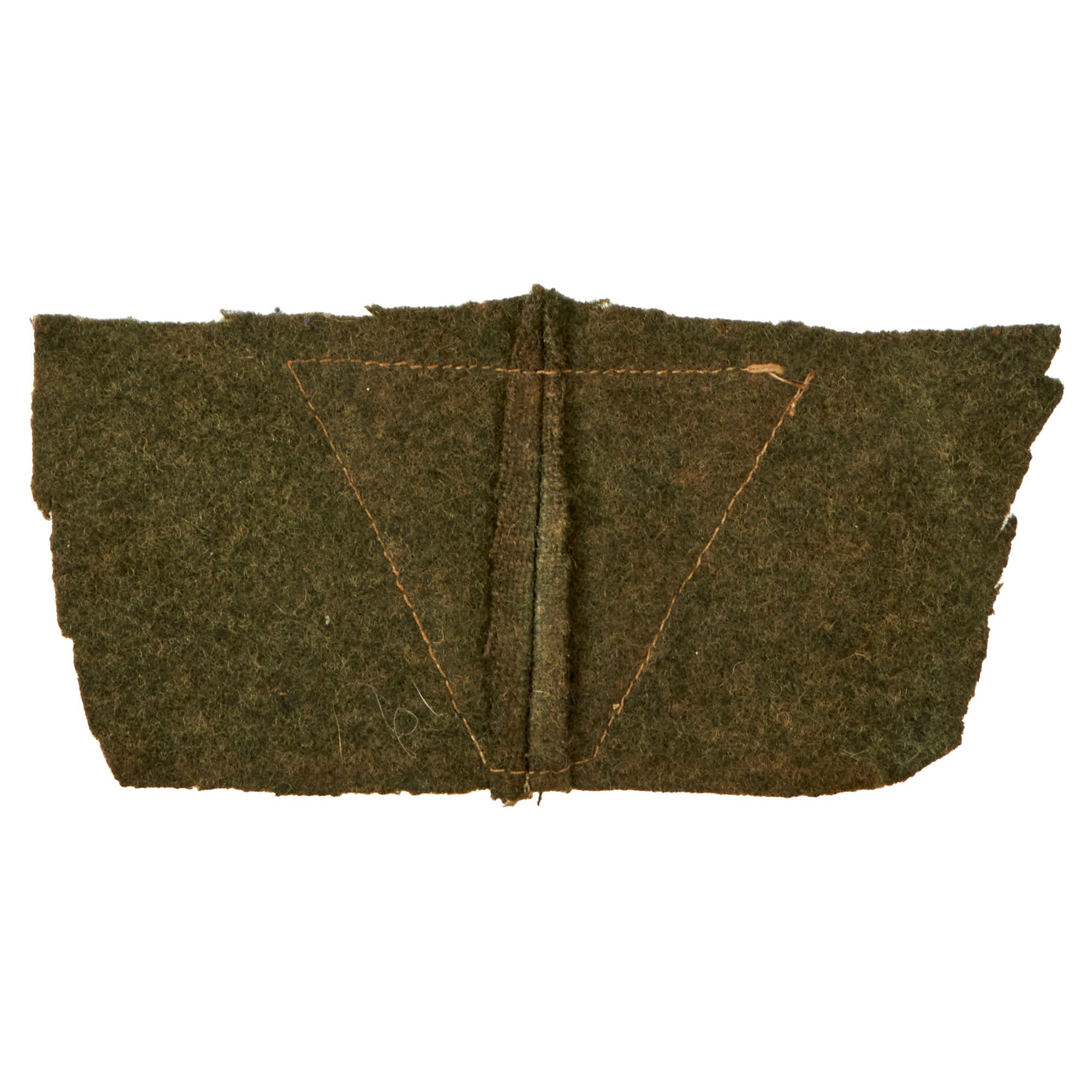 Original Item: Only One Available. Here we have a very nice late war pattern Cap Eagle and Cockade trapezoid, cut off from a German WWII Army M43 Field cap (Heer M43 Feldmütze). The insignia are sewn onto a field gray (feldgrau) wool cap section, which has the center seam from the front of the cap and measures 4 5/8"W x 2 1/4". It features a fine machine BeVo embroidered insignia trapezoid, which features an eagle with gray thread on a light green base, the Heer colors in use from 1940 onwards, and below this is a tri-color cockade, The trapezoid measures approximately 2 3/8"W x 1 3/4". Both the insignia and the fabric shows good amount of staining from use.