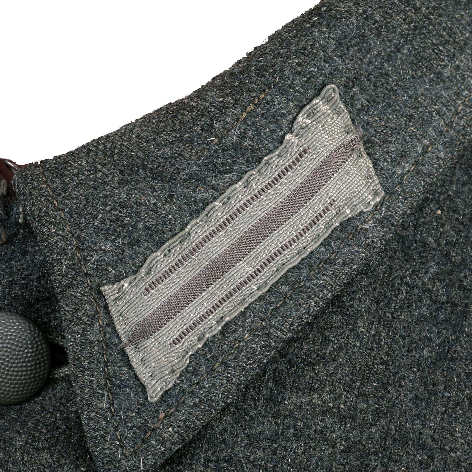 It is adorned with the usual rank and branch insignia used on German tunics. The attractive Army breast eagle is a 1940 pattern BeVO embroidered type, woven with gray threading on a green background, and it is very neatly hand stitched to the chest. It is only sewn to the outer layer of fabric, so it was definitely installed during the production of the tunic, as is correct. The collar is plain feldgrau wool, correct for the M-40 combat pattern. There are EM/NCO litzen collar patches on each side, which late war pattern, BeVo embroidered using light green on a gray background.