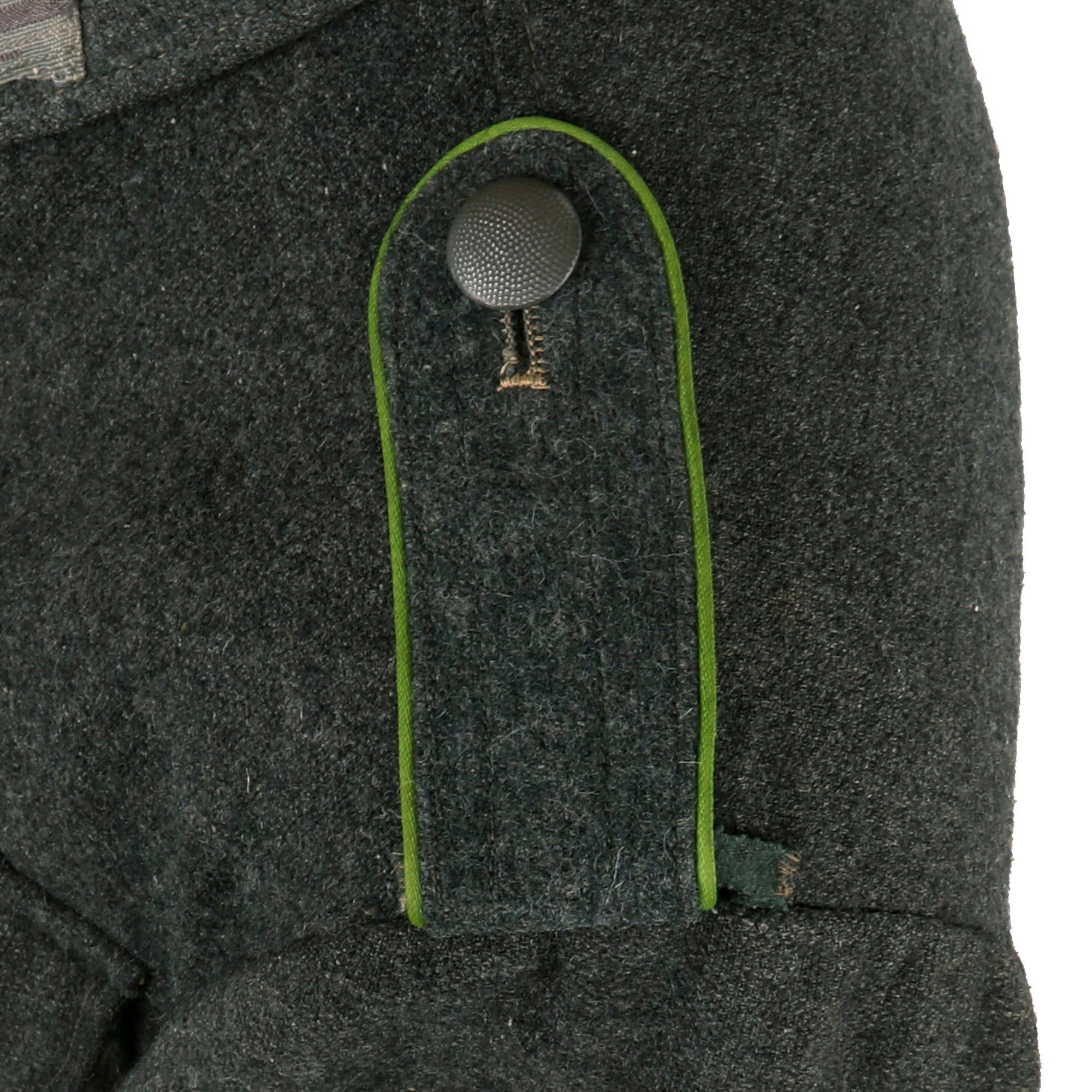 The button attached style Enlisted pattern shoulder straps (Mannschaften Schulterklappen) attached to the tunic have a field gray wool base, and are the later 1940 pattern with a field gray top layer. They have no installed devices and feature Wiesengrün (Meadow Green) piping around the edges, the Waffenfarbe (corps color) for the Heer Panzergrenadiertruppen (Panzer Grenadier Troops). These were motorized / mechanized infantry troops, and were legendary in the field. Originally called Schützen regiments, they had used the same Pink piping as the Panzer corps. Then in 1942 Infantry Regiments were renamed as Grenadier Regiments by AH as a historical homage to Frederick the Great's Army, and the Schützen were renamed to Panzergrenadiers. As there are no devices installed, these indicate the lowest enlisted rank of Panzergrenadier, equivalent to Soldat or a U.S. Army Private.