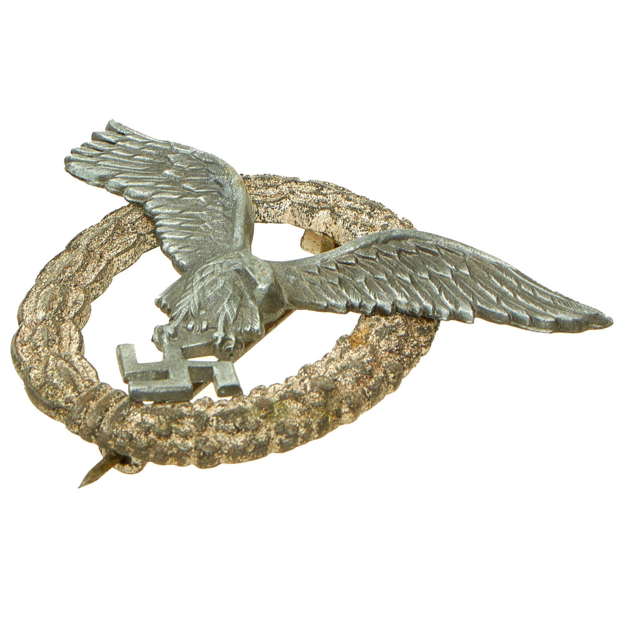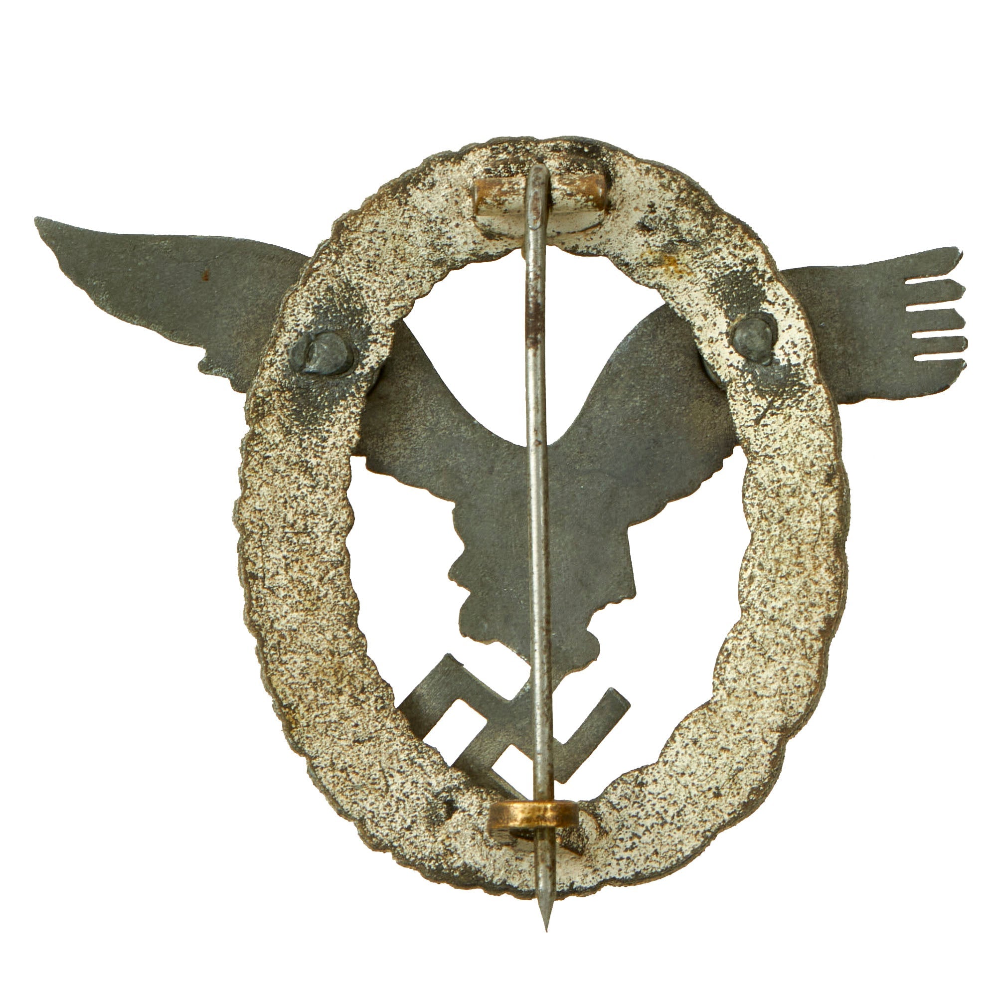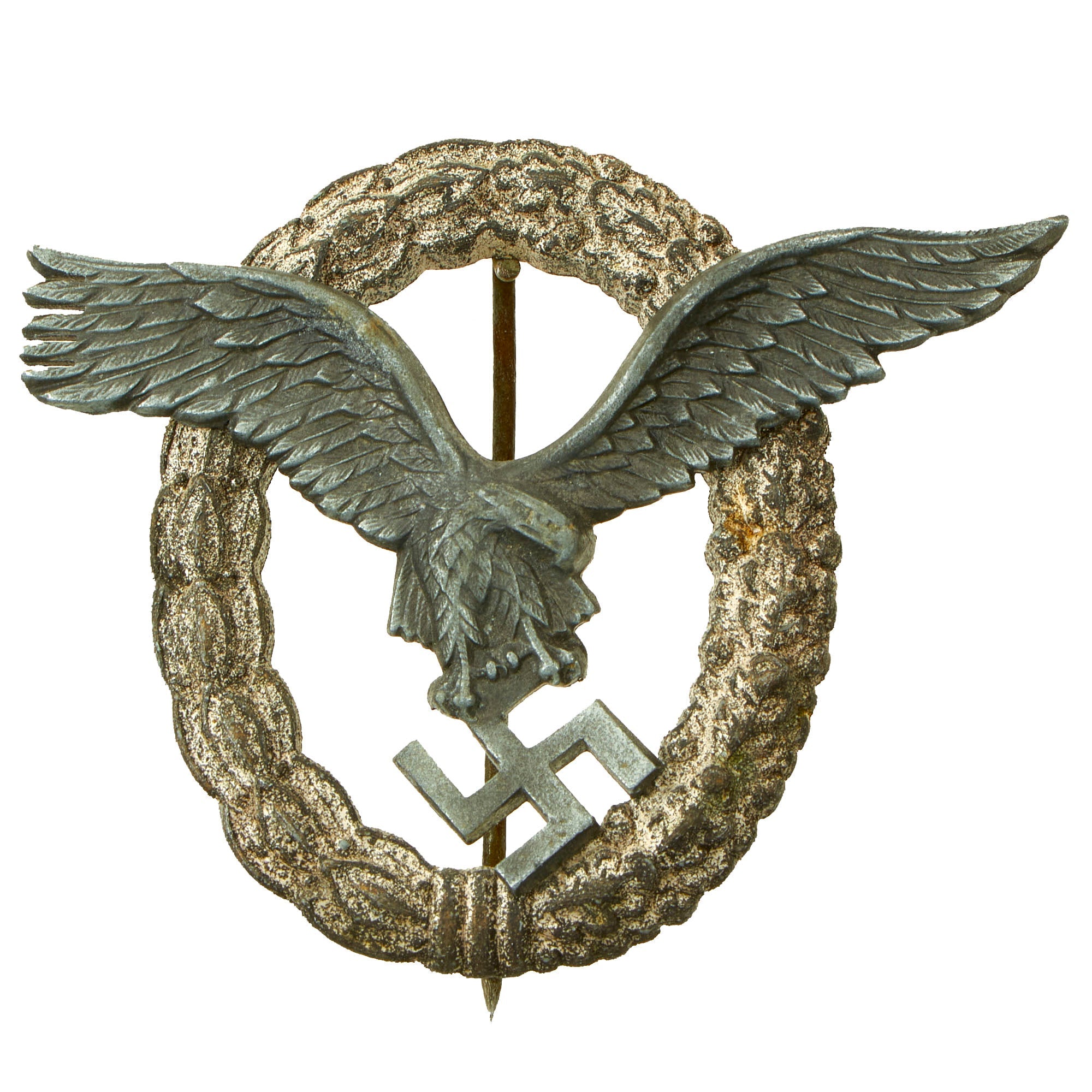 Original Items: Only One Available. This is a very nice condition Luftwaffe Pilot's Badge, with the standard two-piece zinc construction. The "swooping eagle" is held on by the usual two rivets, and looks to have been left bare zinc, which has now oxidized to a gray patina. It has a vertical steel pin on the back, with a barrel hinge and bent wire catch. Condition is very good, with much of the original silvering retained on the wreath, showing a bit of oxidation on the reverse. The eagle has some wear around the edges, and there is also a bend at the bottom where the swas meets the eagle. The rivets holding the eagle to the wreath are also a bit loose.