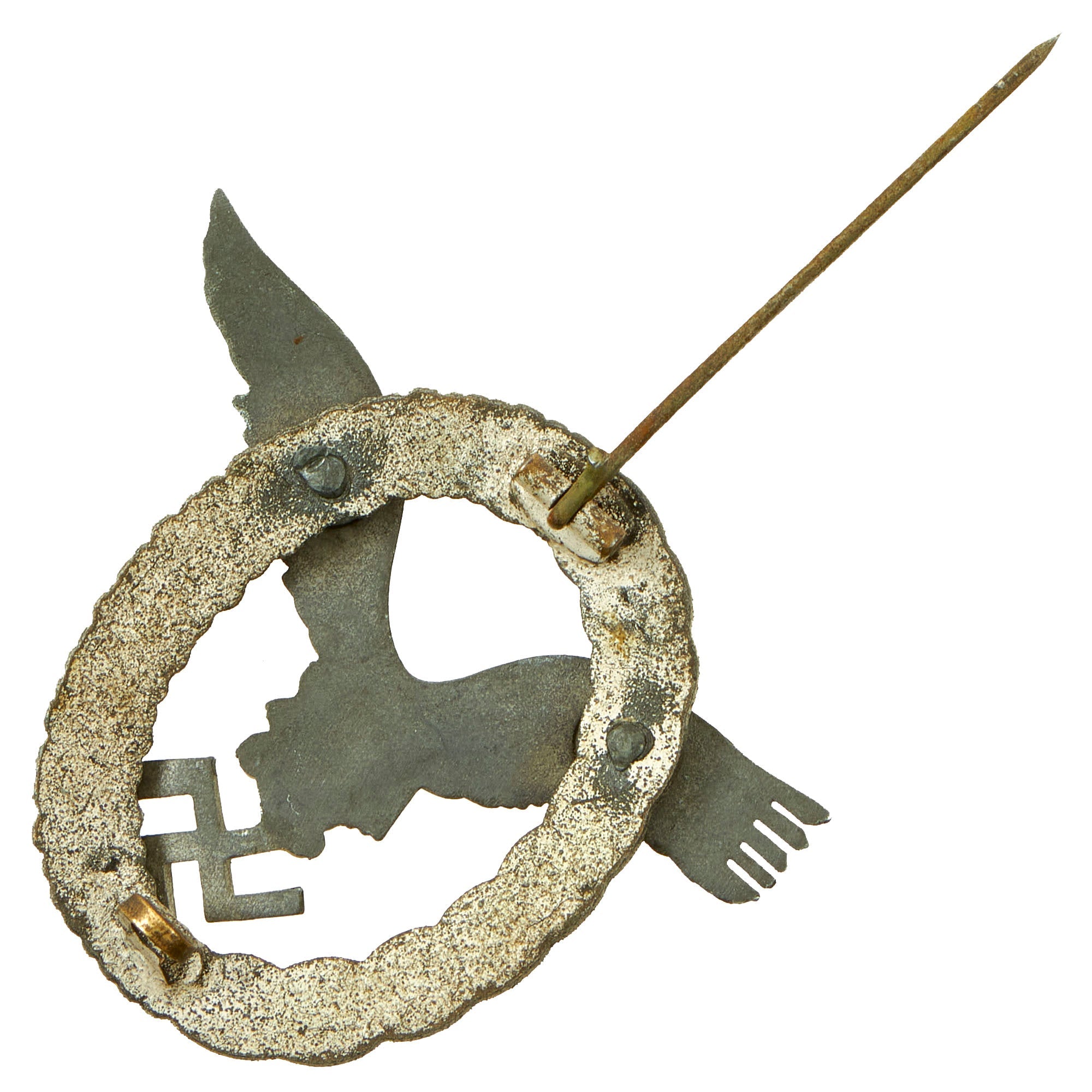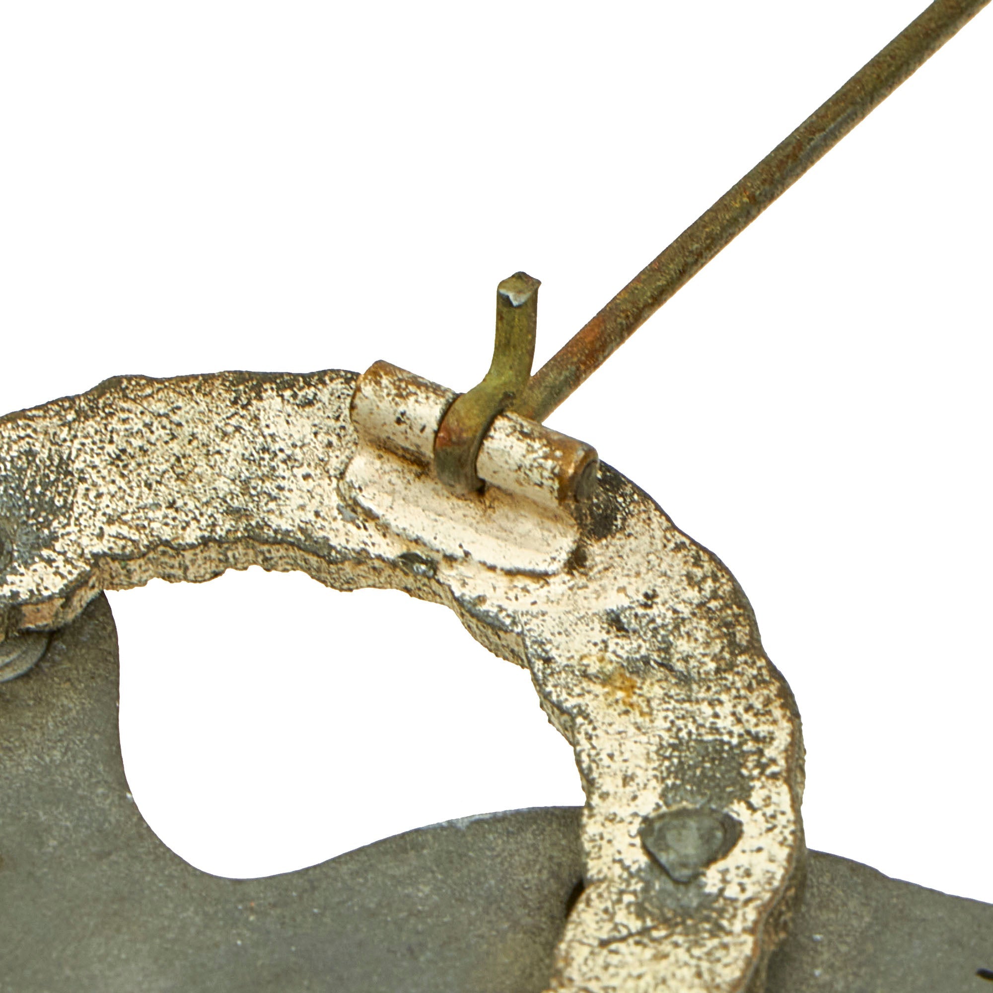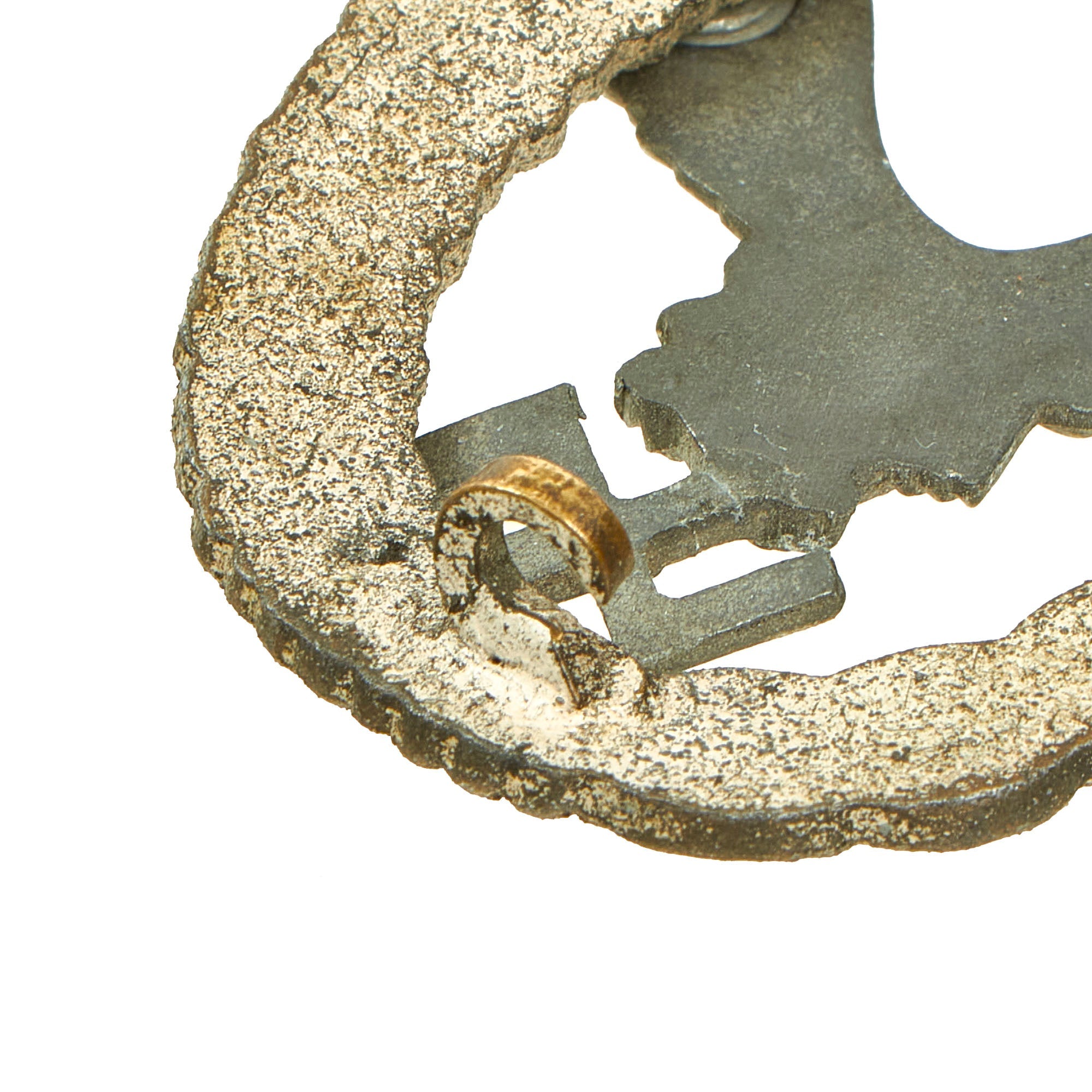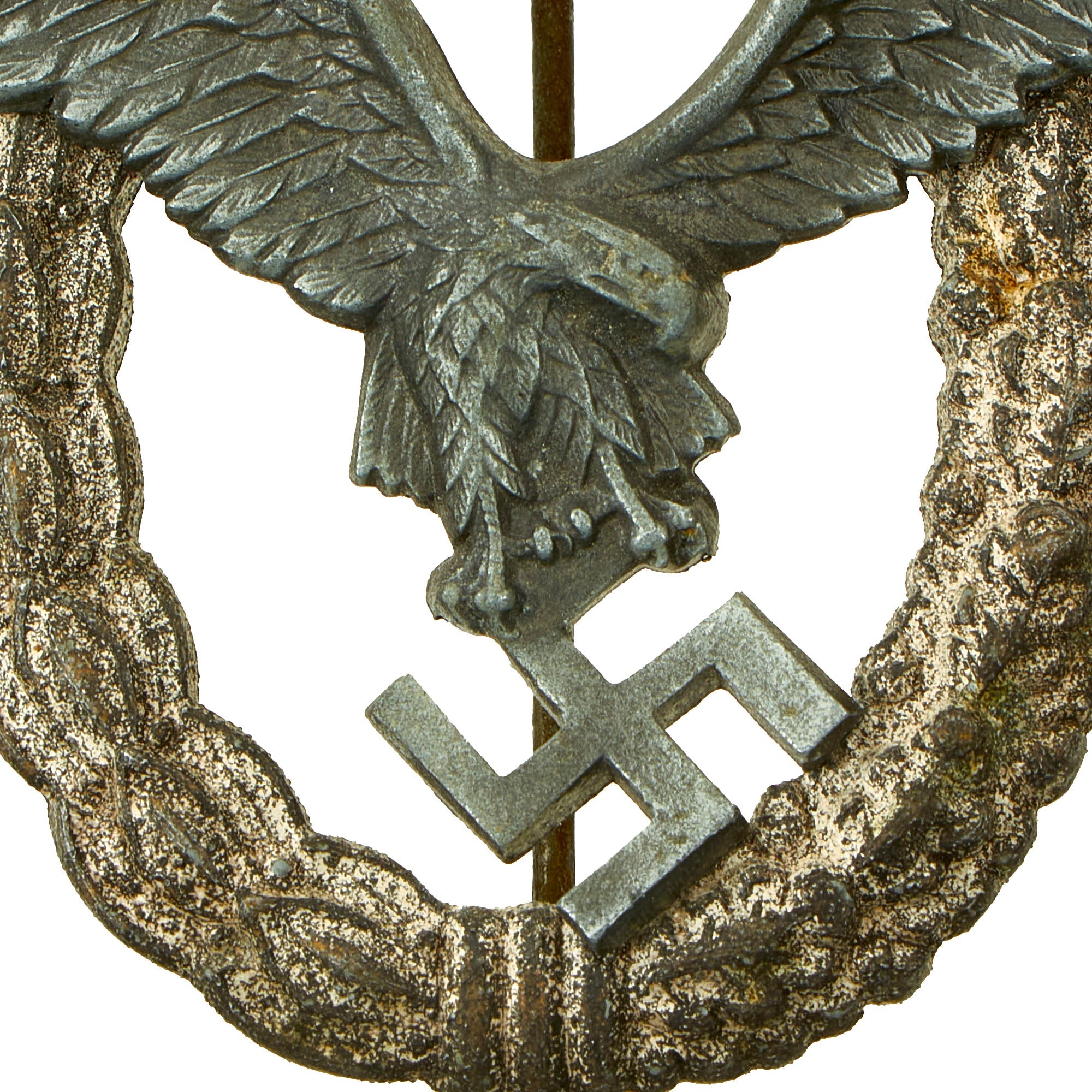 Original Items: Only One Available. This is a very nice condition Luftwaffe Pilot's Badge, with the standard two-piece zinc construction. The "swooping eagle" is held on by the usual two rivets, and looks to have been left bare zinc, which has now oxidized to a gray patina. It has a vertical steel pin on the back, with a barrel hinge and bent wire catch. Condition is very good, with much of the original silvering retained on the wreath, showing a bit of oxidation on the reverse. The eagle has some wear around the edges, and there is also a bend at the bottom where the swas meets the eagle. The rivets holding the eagle to the wreath are also a bit loose.