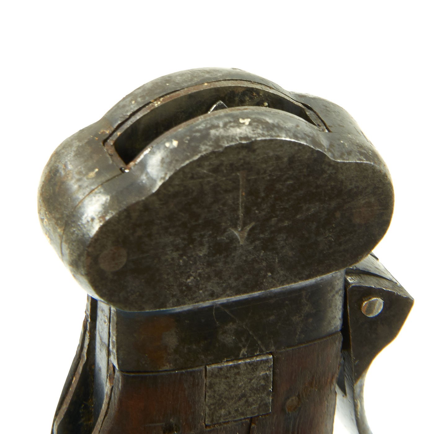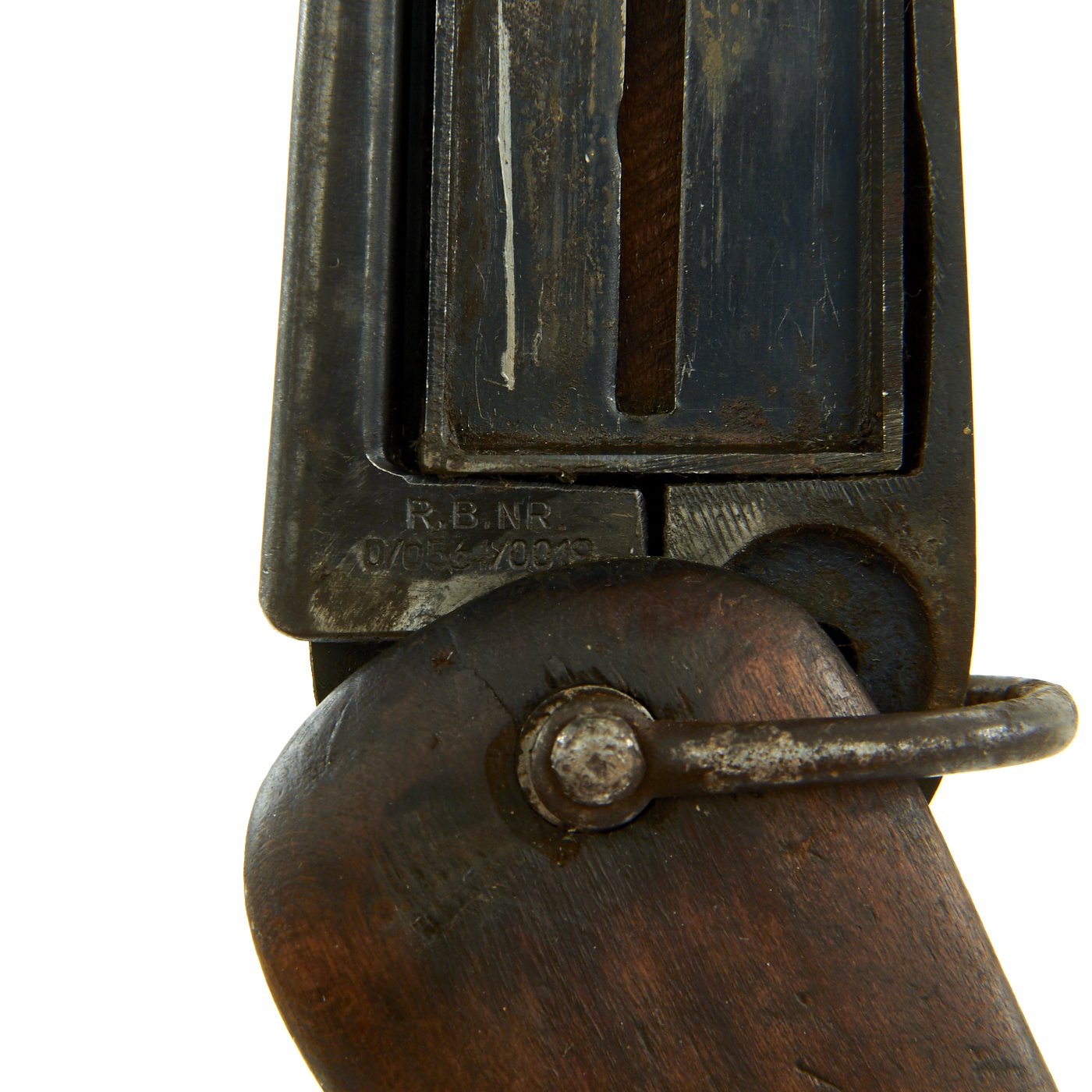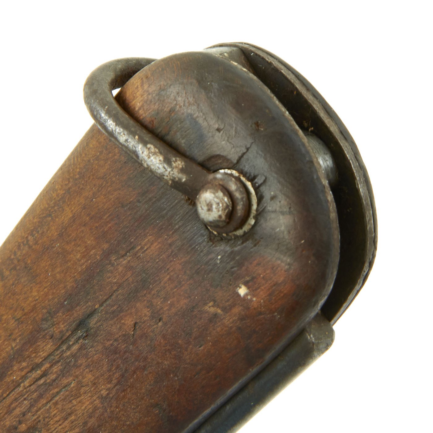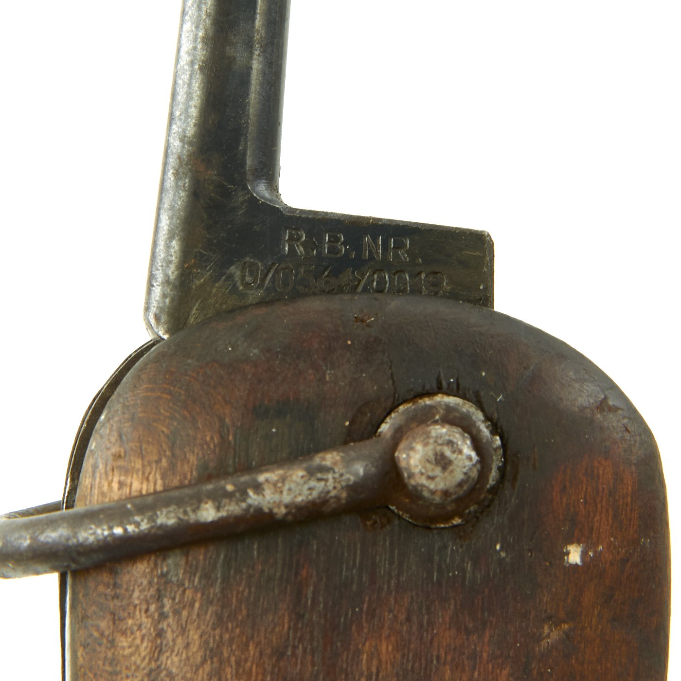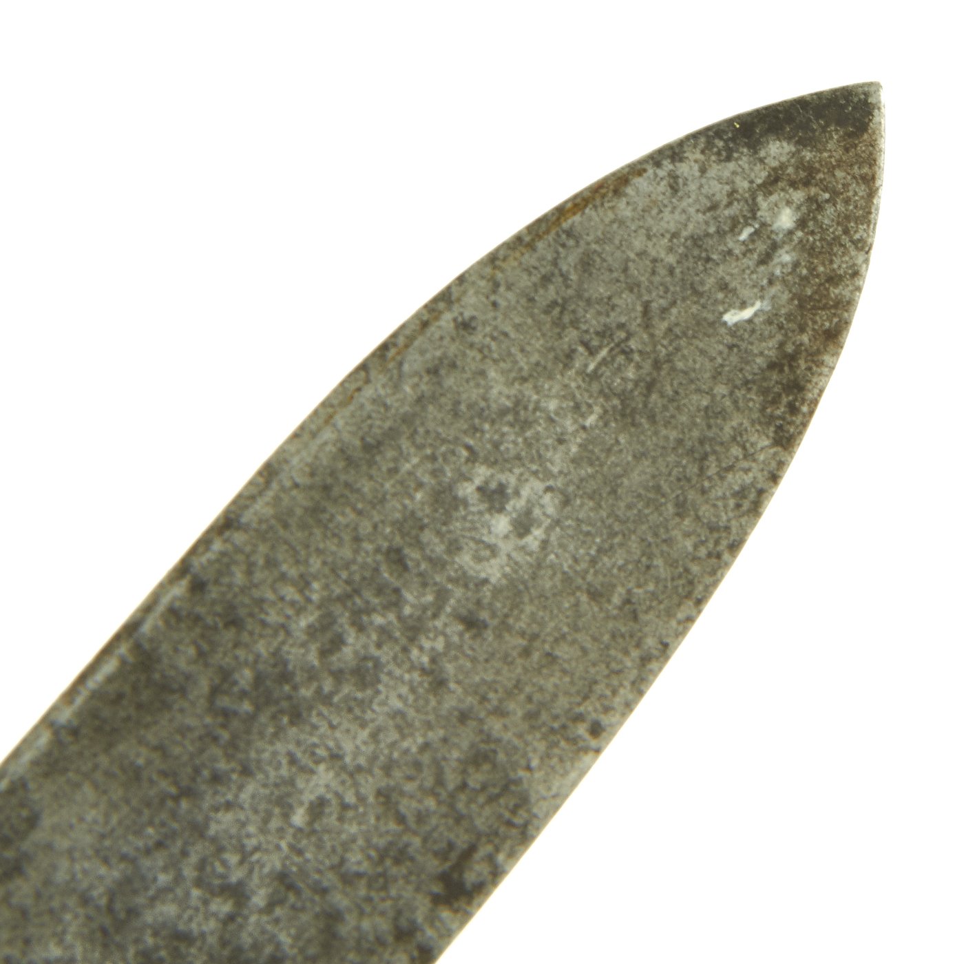 The "take-down" ability allows the cross guard to be removed, and the body/sheath opens with the end ring as a hinge. The blade can then be removed for servicing, and the interior can be cleaned to ensure the blade moves freely. On this example, the take-down ability functions perfectly, and the release and marlingspike springs are intact with no cracks. This is a fully functional example, and the blade of this knife is in very good condition. It retains some of the original cross grain, and is still partly sharp, though it has been sharpened after production. It has light staining overall, as pictured.
