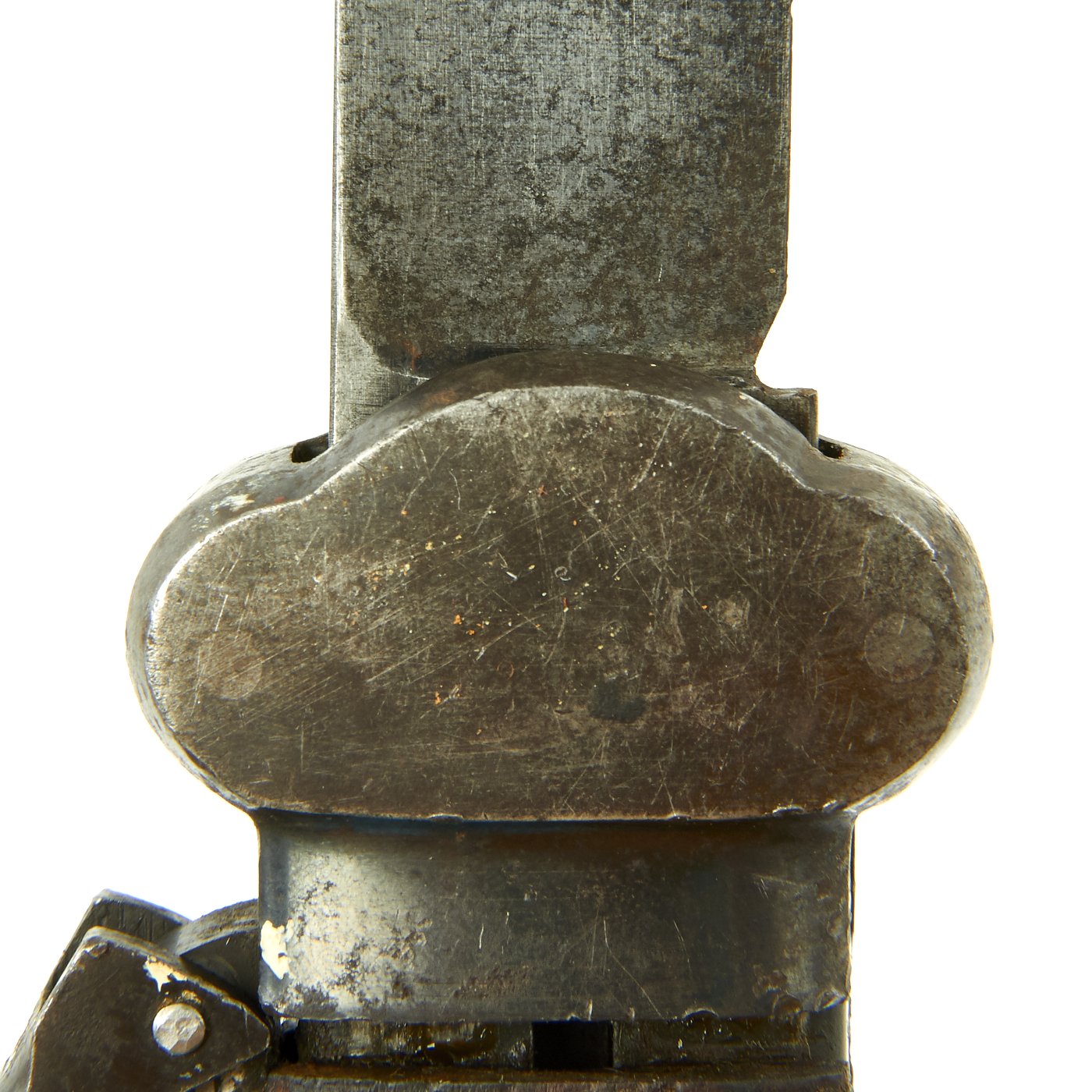 This example of the Type II FKm (FJM) is in very good condition, and is has a fine carbon steel blade, with anodized and plated steel components making up the rest of the knife. The blade does have some staining now, and the black anodized coating is worn in many places on the knife. The number 1720 is stamped on the bottom of the cross guard, the blade base, and on the end of the blade channel. The catch and spring are both marked with number 220. Whether this is just a mistake or parts were swapped out, we do not know. There is also arrow on cross guard and interior to indicate the correct orientation when reassembling the knife.