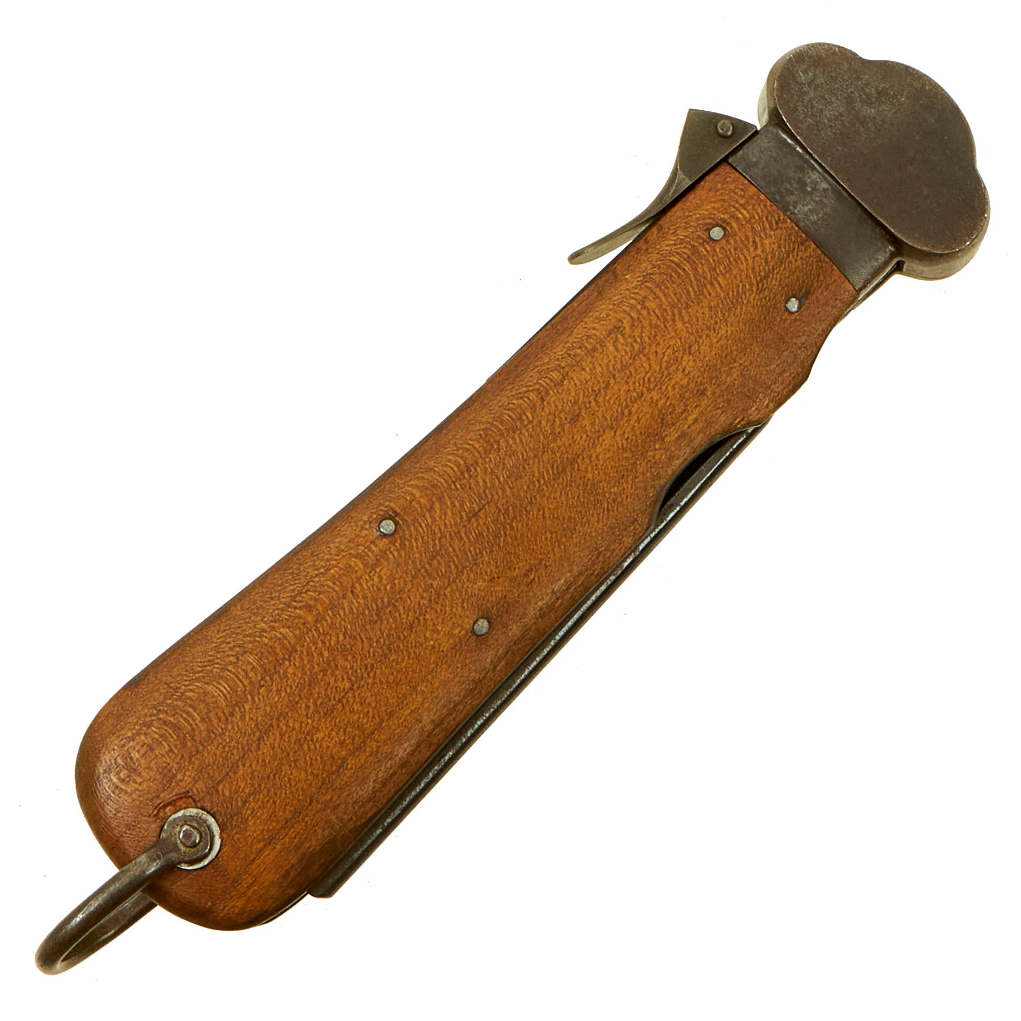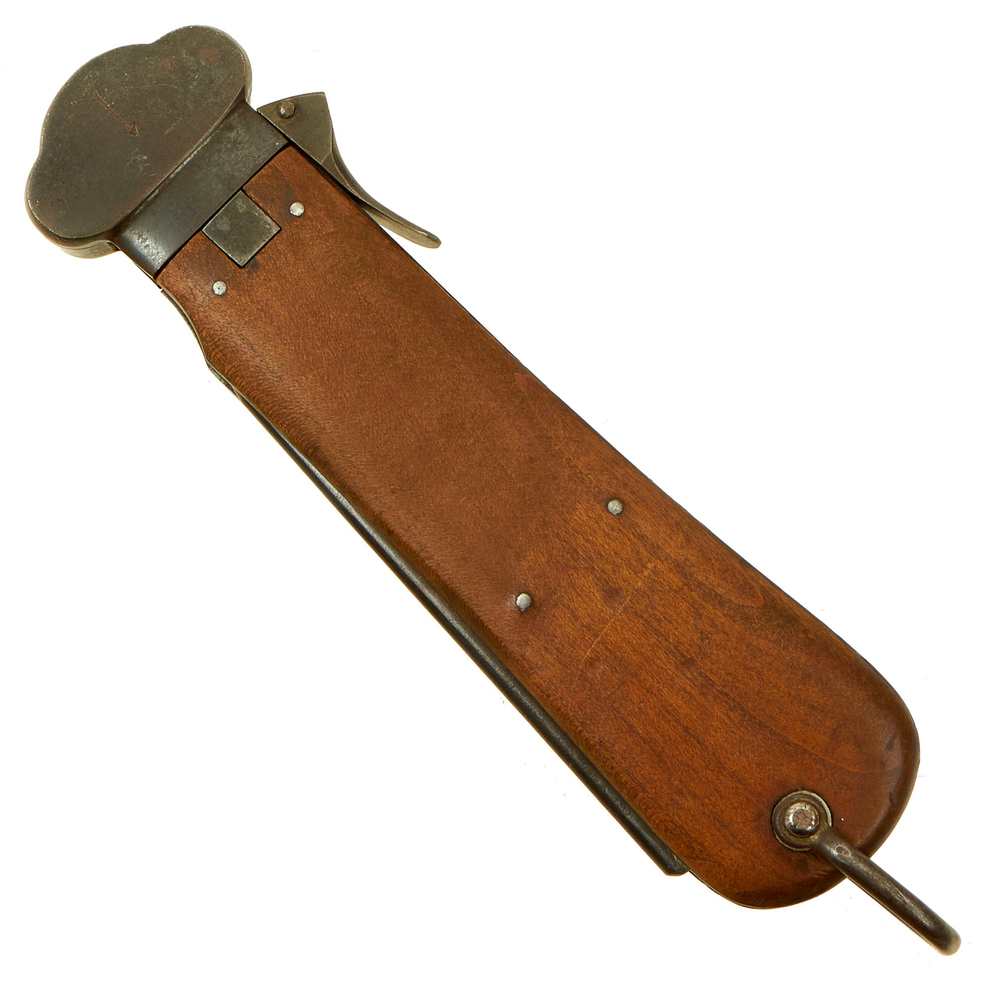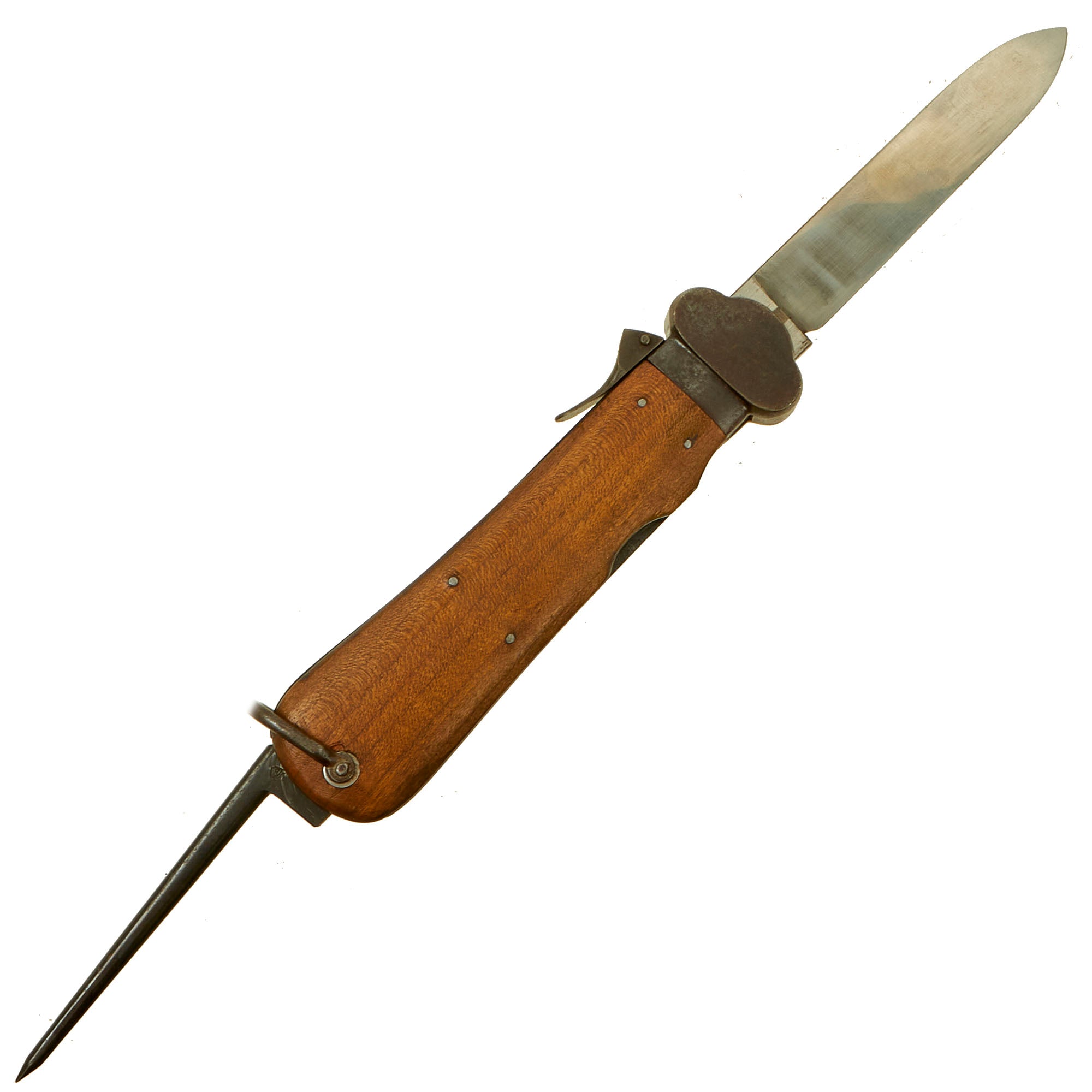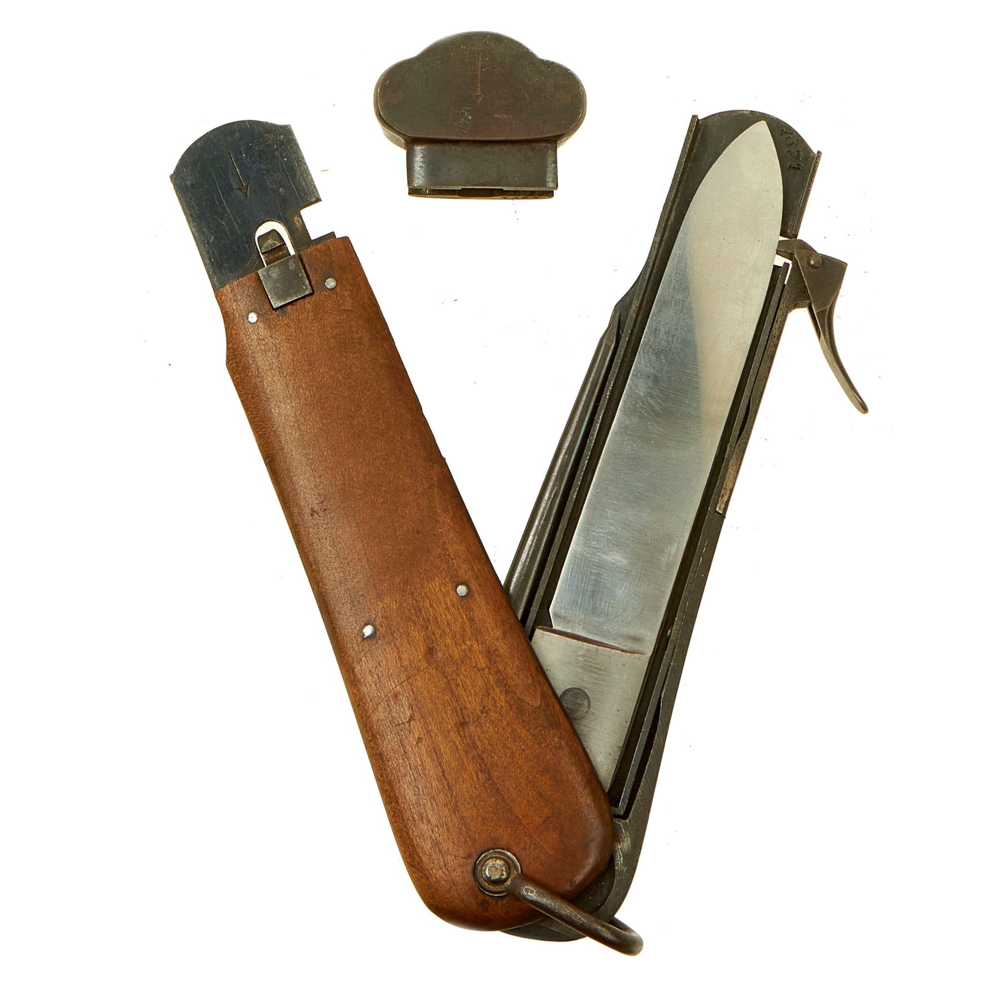 Original Item: Only One Available. This is an excellent barely used example of a late-war produced Type II "Take down" version of the legendary Luftwaffe Fallschirmjäger-Messer, or German air force paratrooper knife (FJM or FKm), with a Solingen RB Nr on the blade. These knives utilize a four-inch (100 mm) telescoping (OTF), gravity-propelled locking blade. First produced in 1937, the FJM was issued to German flight crews and paratroops, primarily for the purpose of cutting a trapped parachutist from his rigging in case he landed with a tangled parachute, or became entangled in trees with the shroud lines. Though not intended for use as a fighting knife, the FJM's blade could be and was used as a close combat weapon when necessary.