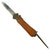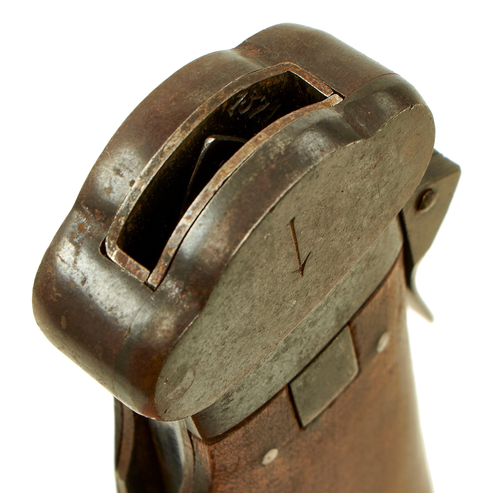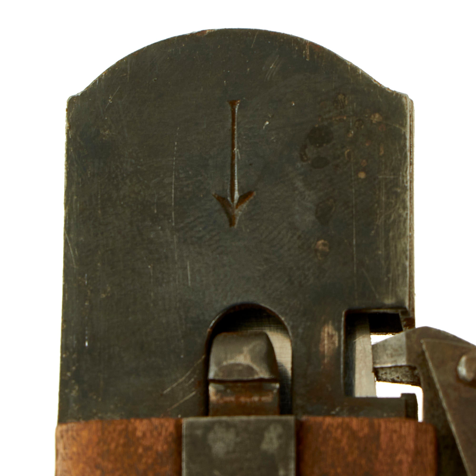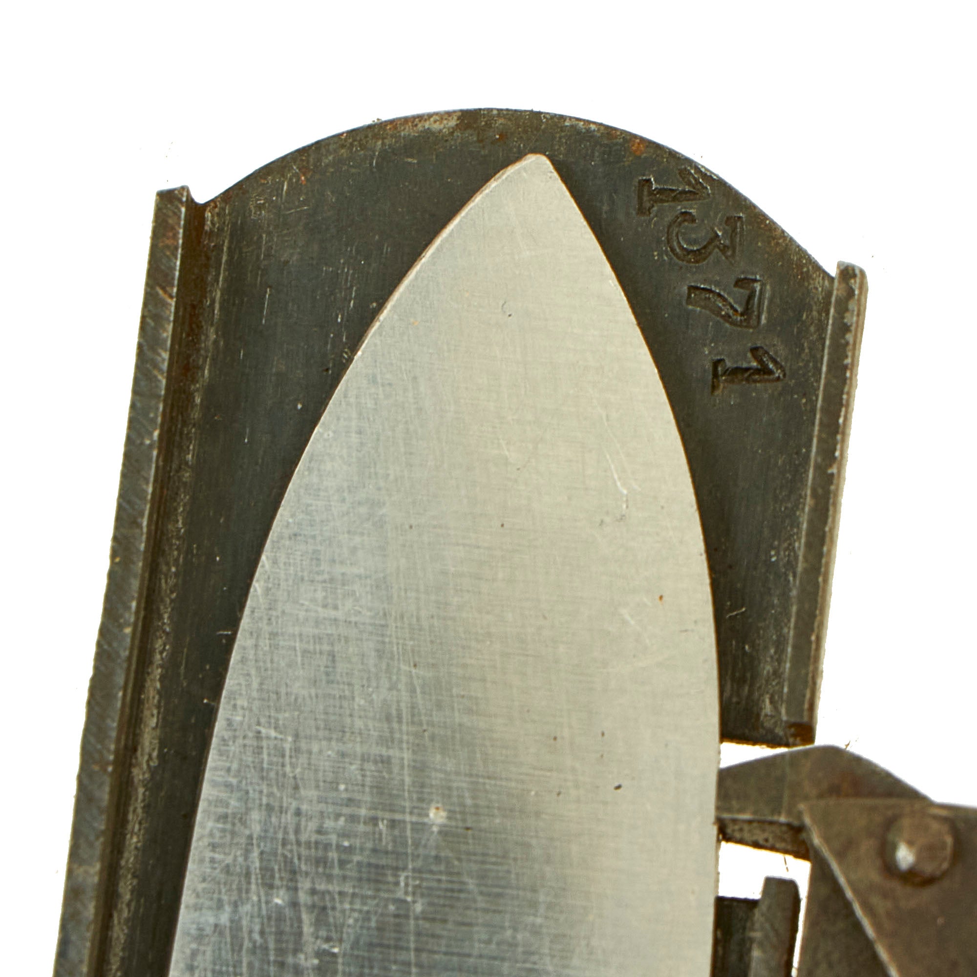 This example of the Type II FKm (FJM) is in good condition, and it has a fine carbon steel blade, with anodized and plated steel components making up the rest of the knife. The number 1371 is stamped on bottom of the cross guard, the blade base, and on the inside of the blade slide, so this knife has not had parts replaced. There is even shortened number 371 on both pieces of the securing latch, which we rarely see! There is an arrow on the cross guard and interior to indicate the correct orientation when reassembling the knife.