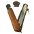 The Luftwaffe Fallschirmjäger-Messer uses a sliding blade inside a metal gripframe, which was originally fitted with smooth wood scales, usually of beech or walnut. The blade itself is a relatively blunt spear-point, and the profile is flat ground, tapering to a utility edge. To open the blade, the user points the FJM downwards while flipping up the fulcrum-style operating lever, allowing gravity to draw out the blade to its fullest extent. Releasing the lever locks the blade into position. The FJM may also be opened by flipping the blade release lever while flicking the wrist holding the knife, causing the blade to extend. The FJM was also equipped with a folding marlinspike or awl. Primarily intended for untangling rope knots, it can also be used as a prying tool. The FJM's spike does not lock when opened and was never intended to be used as a combat weapon, though individual German paratroopers may have employed it as such.