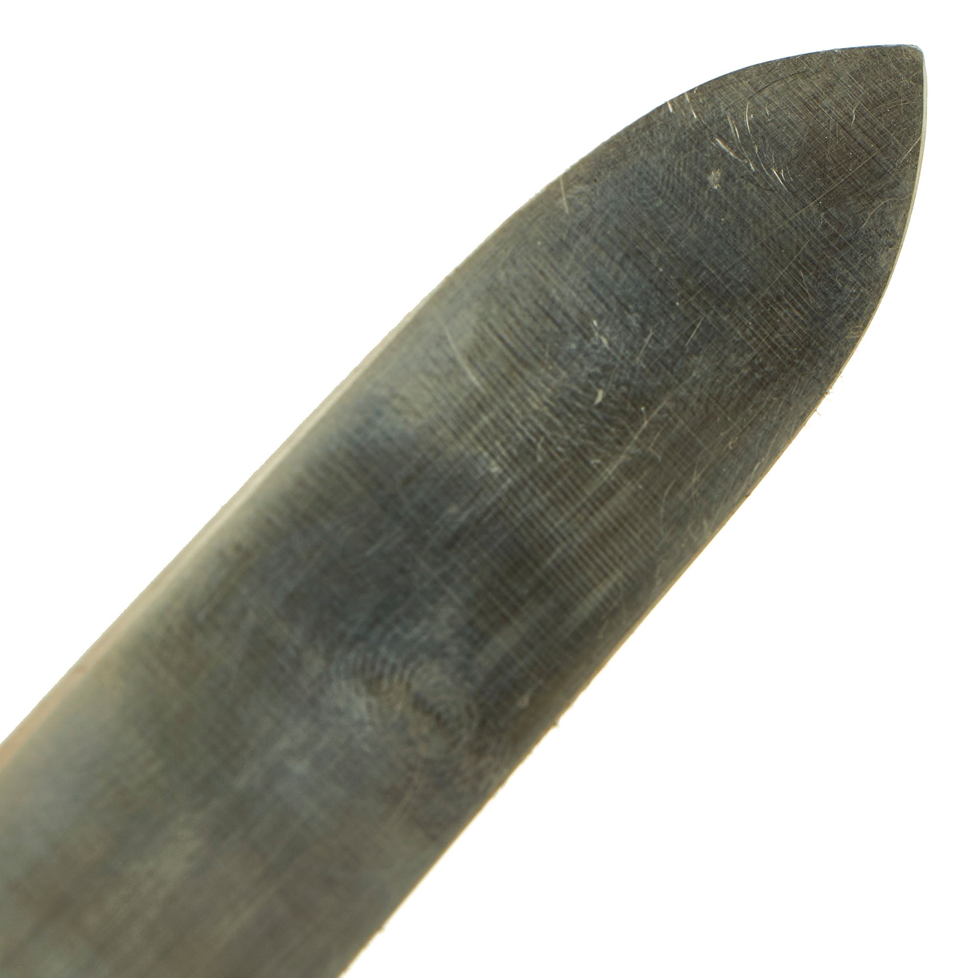 The grip plates are of walnut with the standard four retaining rivets on each side. These plates are in very good condition throughout, with a very attractive wood grain. There is just a bit of wear and light denting. The base of the marlinspike is marked with the Early "Stick Eagle" over 5 inspection mark, seen on many Luftwaffe edged weapons. The other side of the spike has an additional marking on it, indicating the manufacturer of the knife: