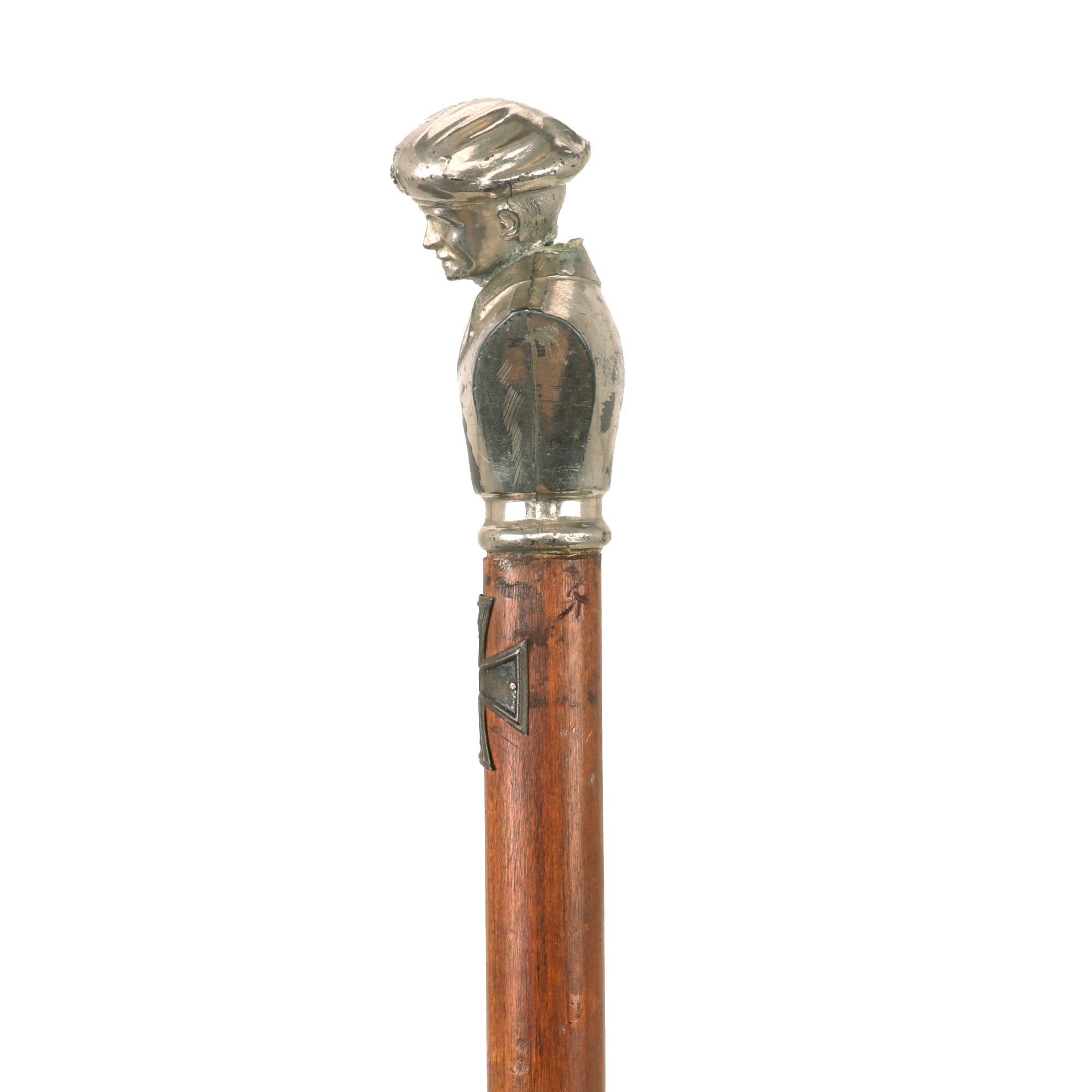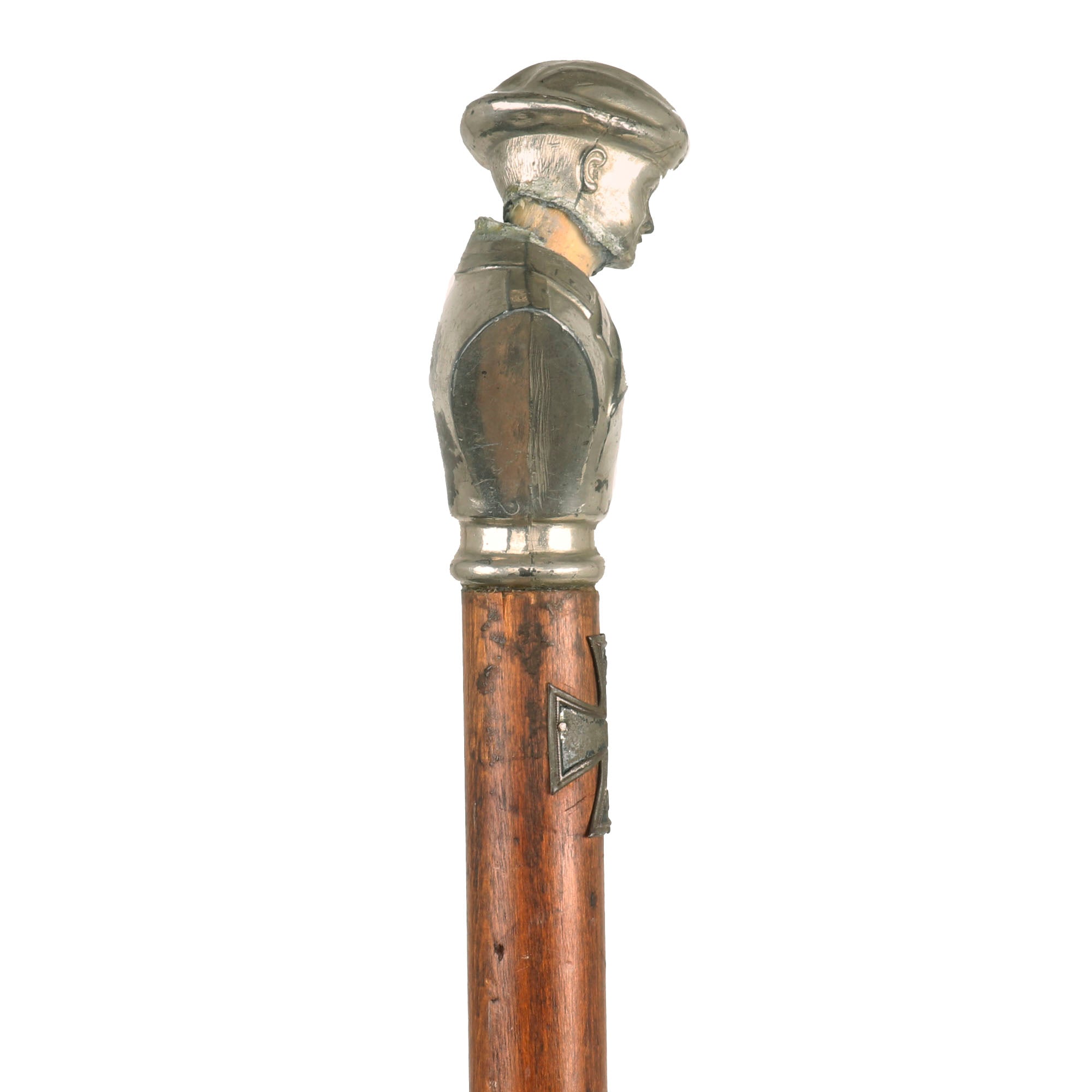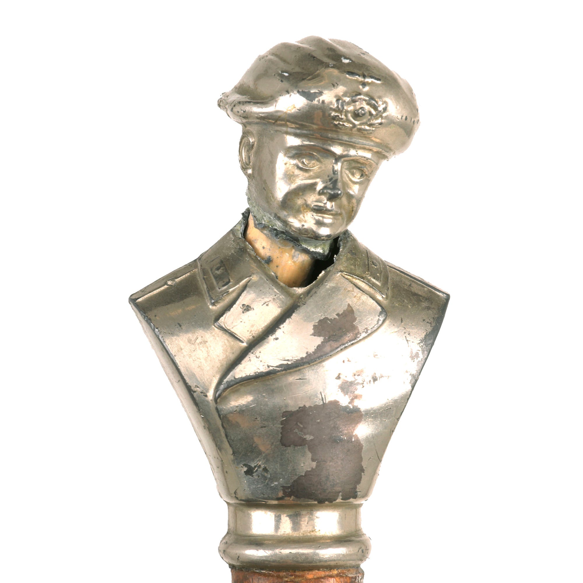 The included swagger stick is in relatively good condition, showing a Panzer soldier wearing a wrap tunic as well as a "Panzer Beret" protective helmet. It is also fitted with a 1914 Iron Cross insignia, indicating that the owner saw WWI service, as Eberbach did. The head of the figure has broken off, and was repaired at some point, but it still can fall out. The swagger stick fits into slots added to the left side of the greatcoat, and measures 39 inches in overall length.