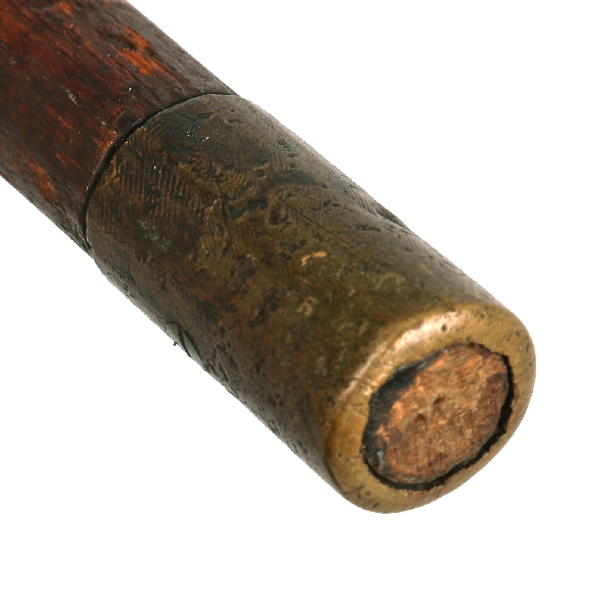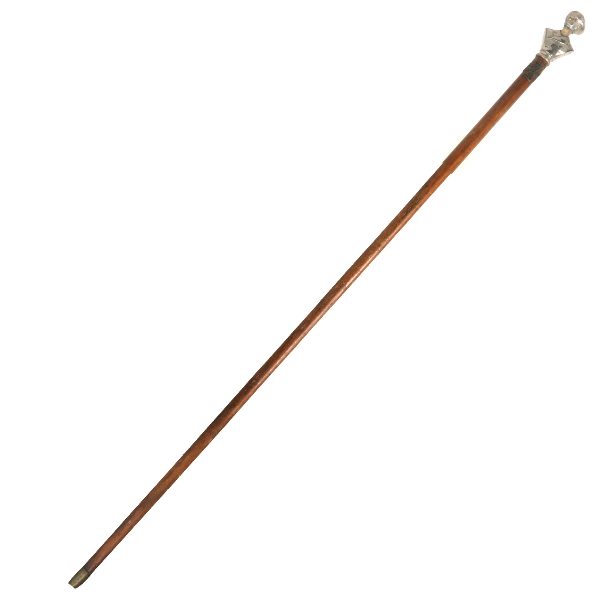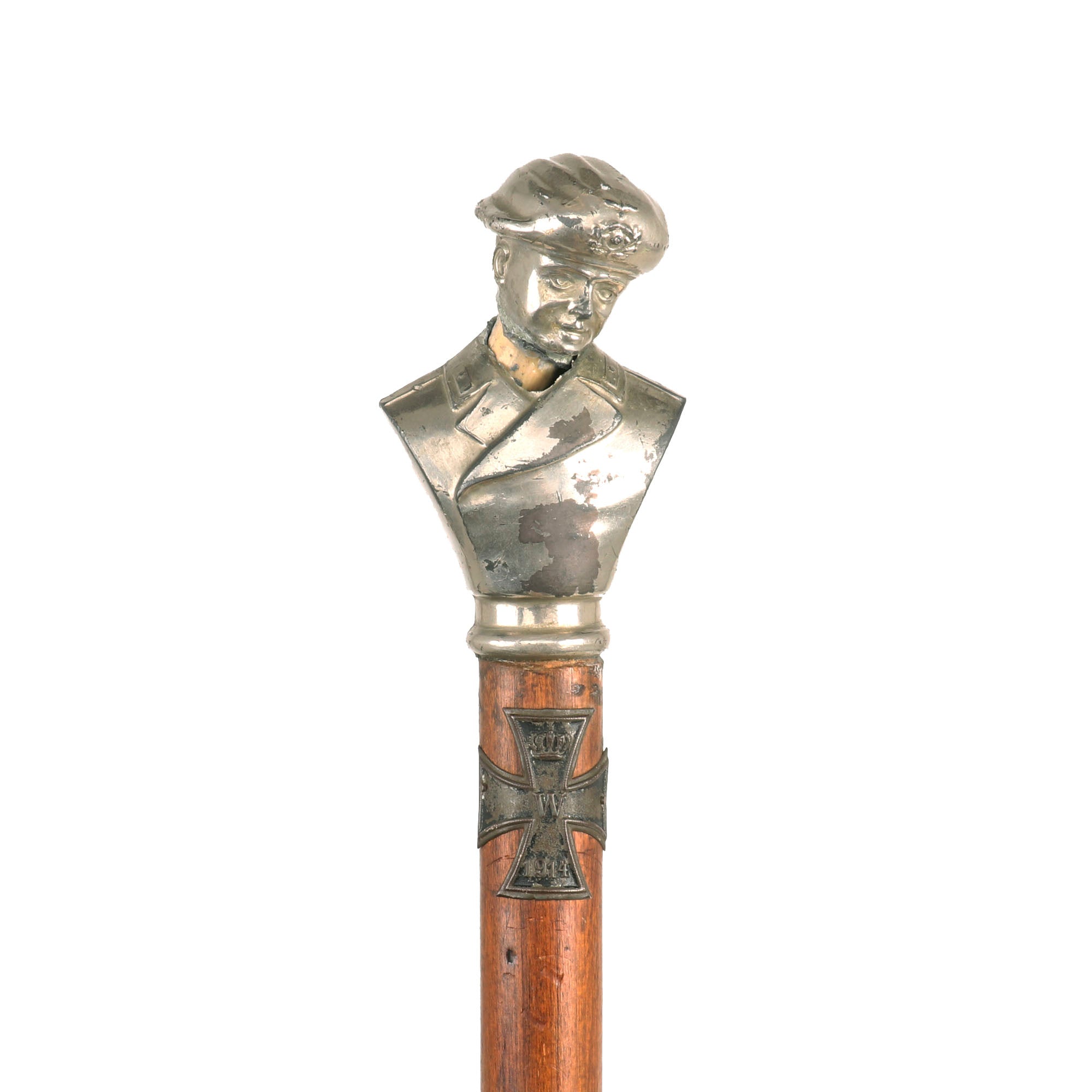 The included swagger stick is in relatively good condition, showing a Panzer soldier wearing a wrap tunic as well as a "Panzer Beret" protective helmet. It is also fitted with a 1914 Iron Cross insignia, indicating that the owner saw WWI service, as Eberbach did. The head of the figure has broken off, and was repaired at some point, but it still can fall out. The swagger stick fits into slots added to the left side of the greatcoat, and measures 39 inches in overall length.