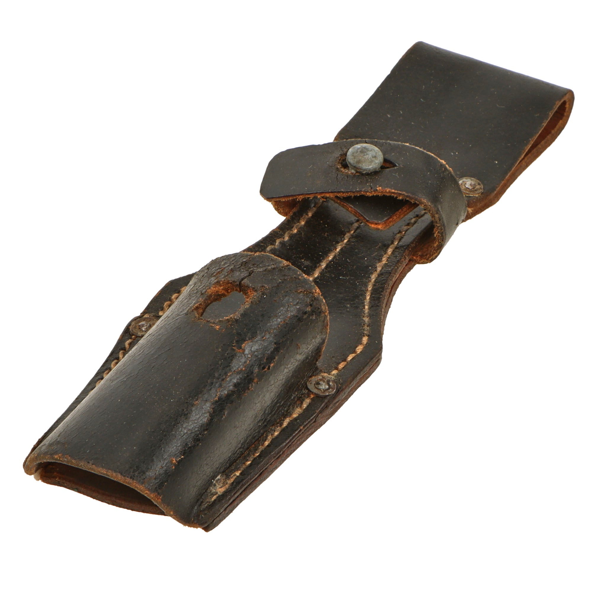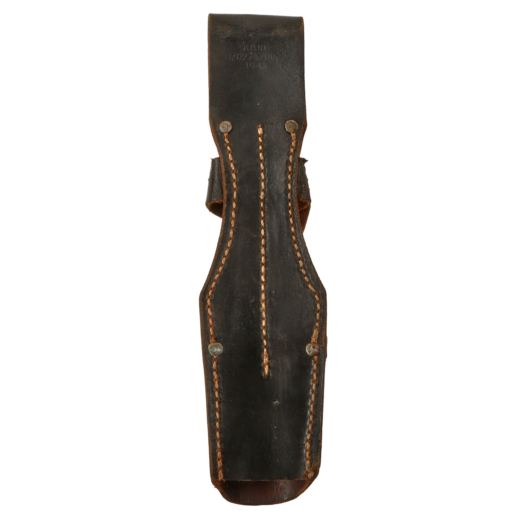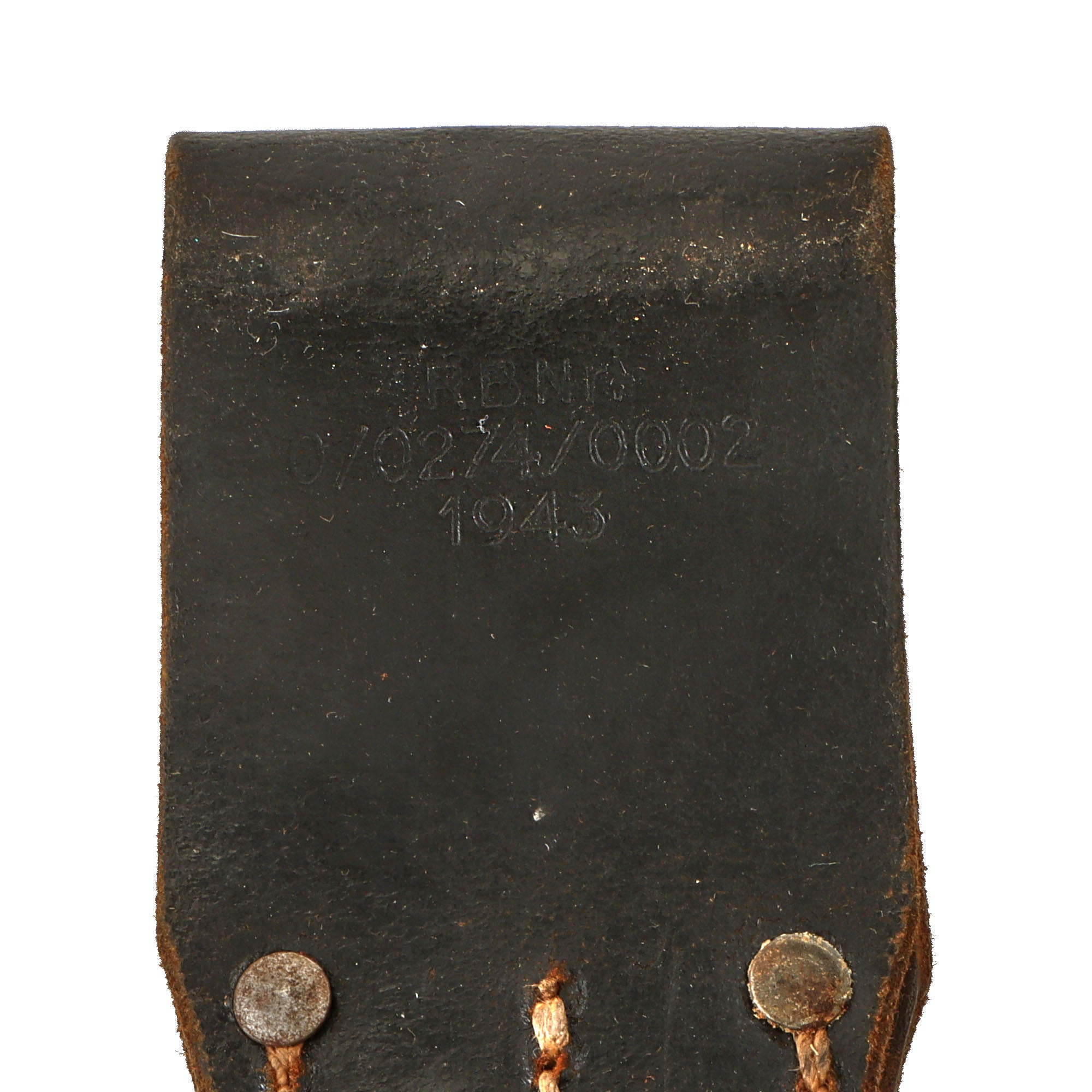 Original Item: Only One Available. This is a very nice "mounted pattern" genuine German WWII leather bayonet frog (Seitengewehrtragetasche), as used with the bayonets for the K98k and other service rifles. Sometimes called the "early pattern", it features a securing loop for the handle of the scabbard, which helped keep in place better. Some makers removed this later in the war, but others produced them with securing straps until the end of the war.